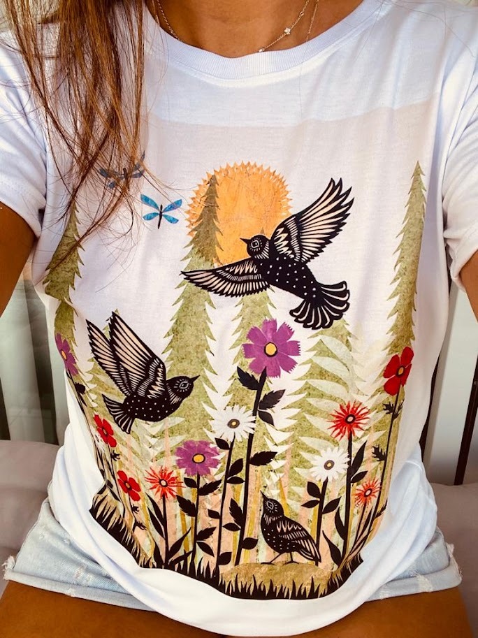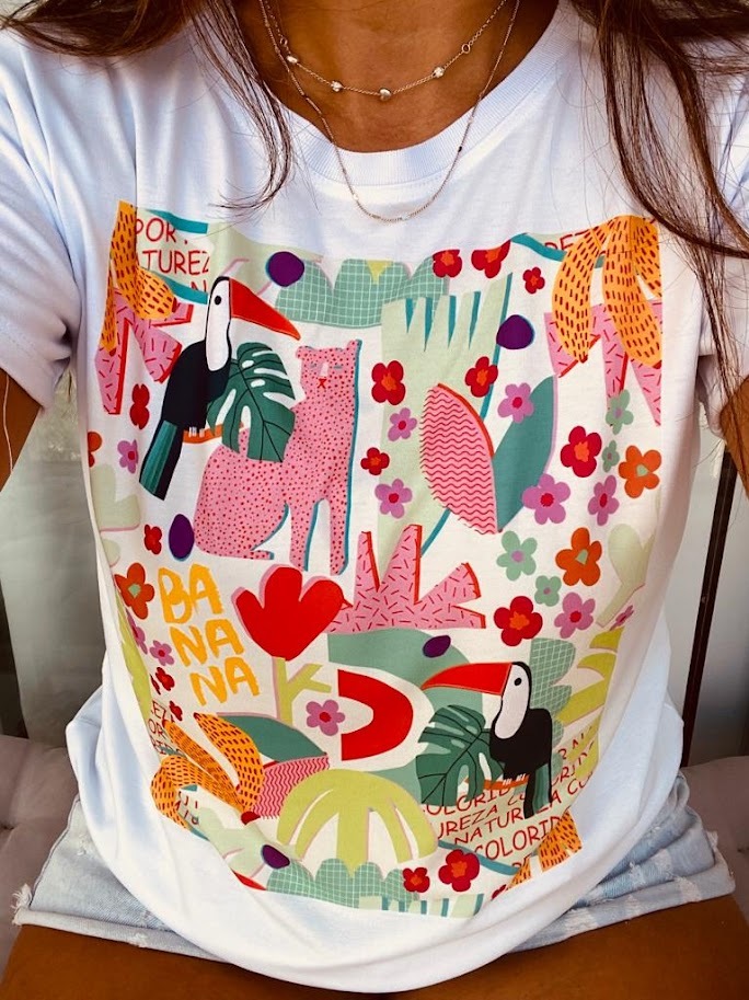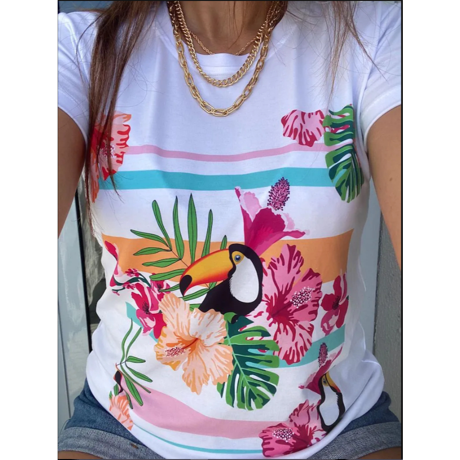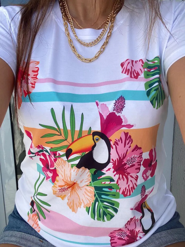 T-Shirt Feminina Estampada Tropical em Poliéster com Elastano Confortável