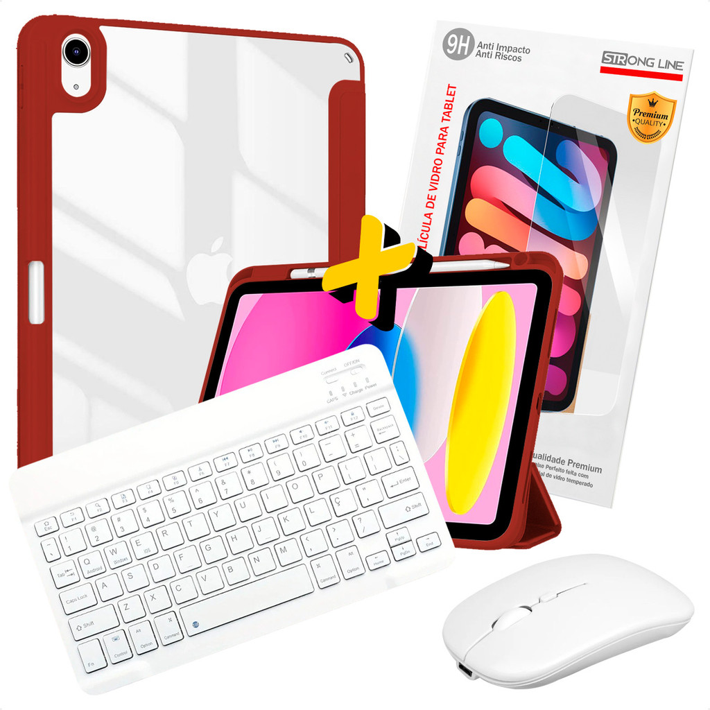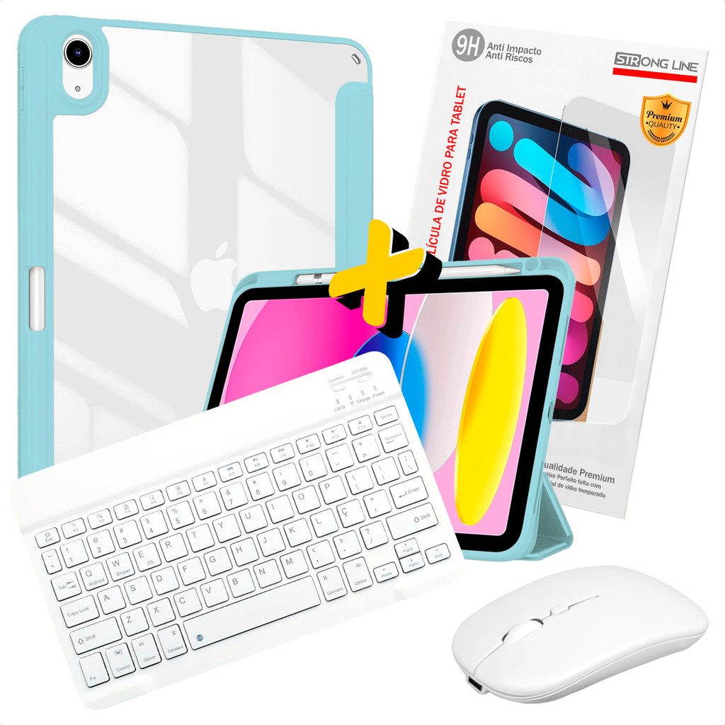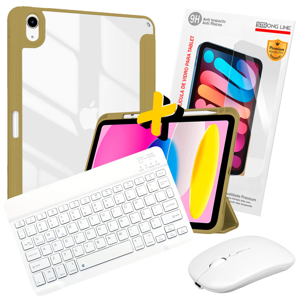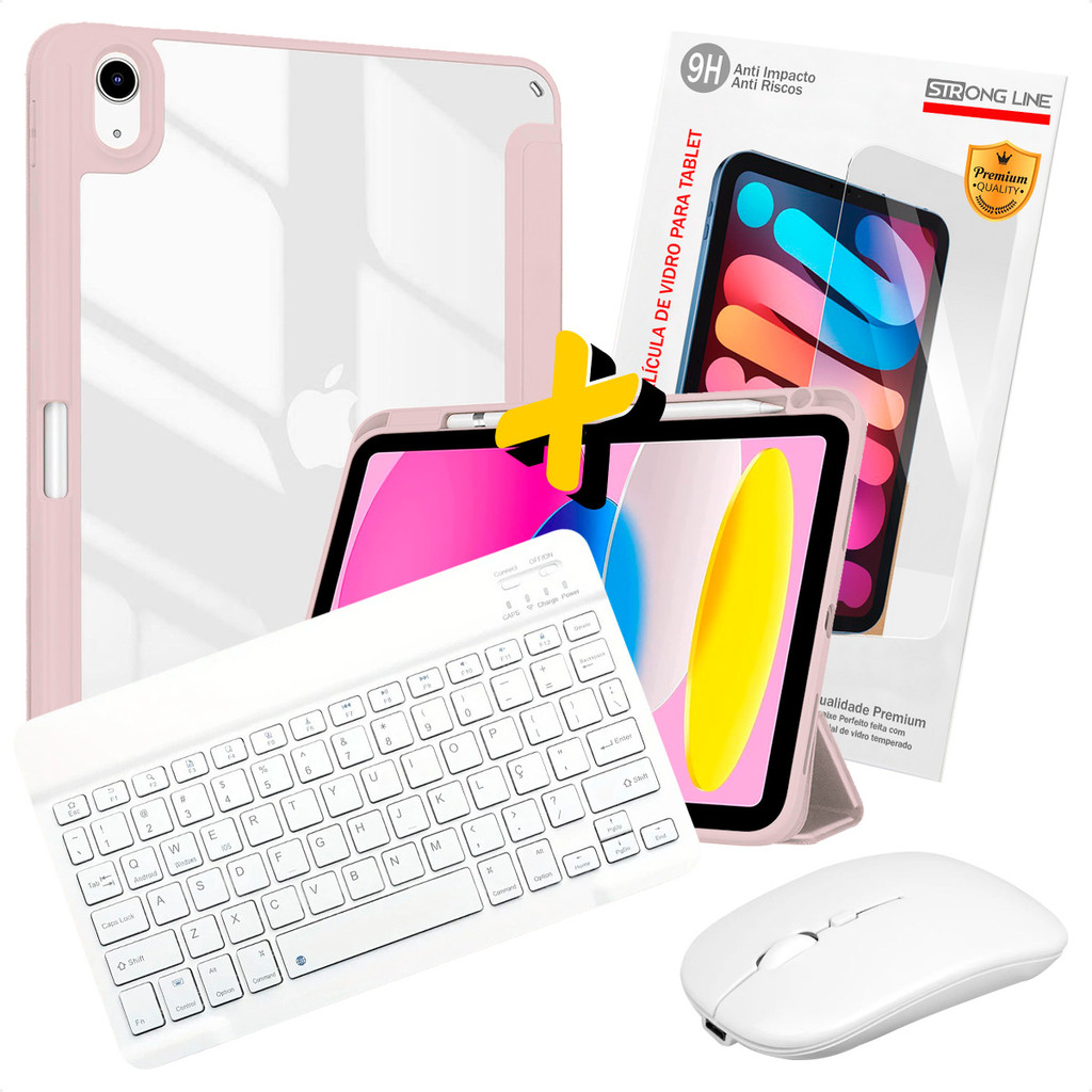 Kit 4 em 1 Capa para iPad A16 11ª Geração 2025 Teclado Wireless Mouse Óptico Branco e Película de Vidro
