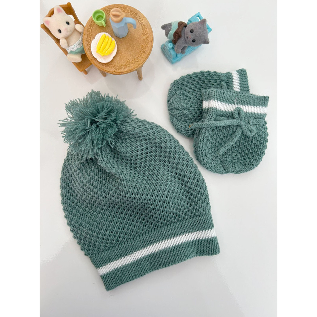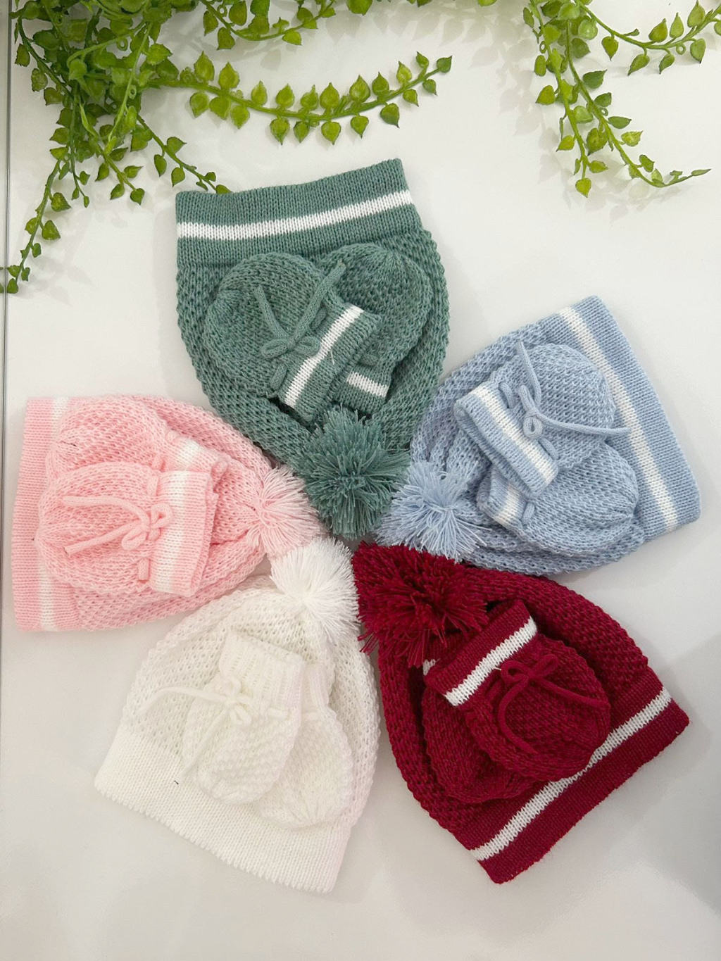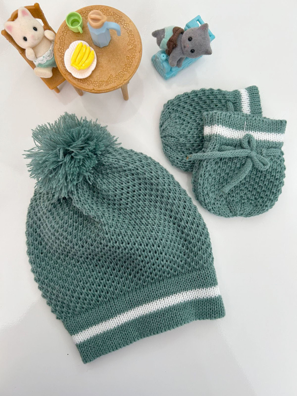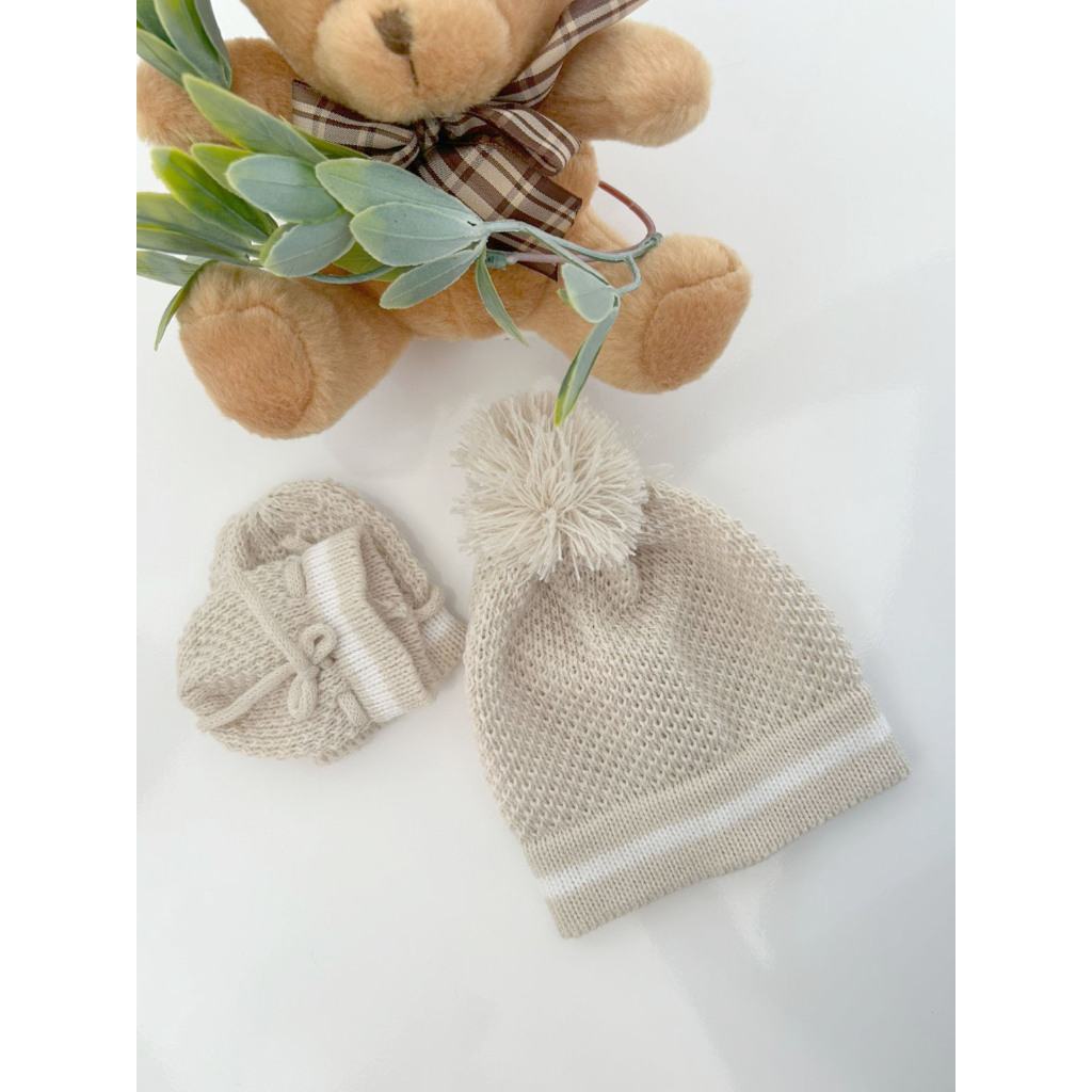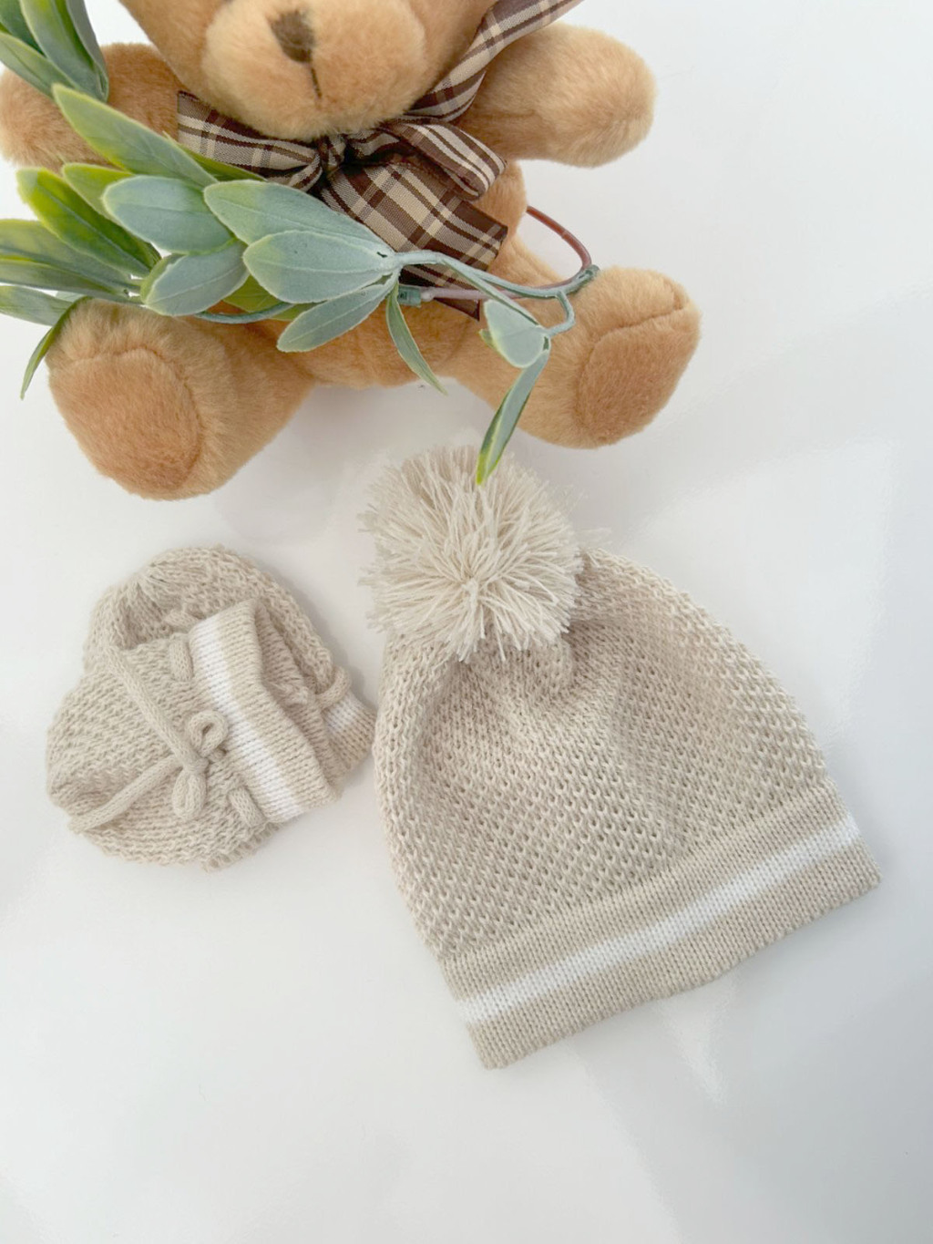 Touca e Luva em tricô para bebê 0 a 3 meses com listra
