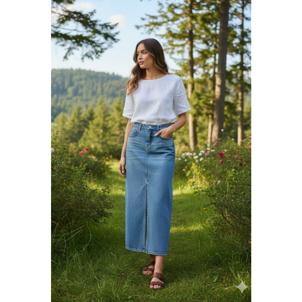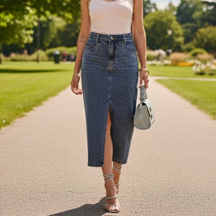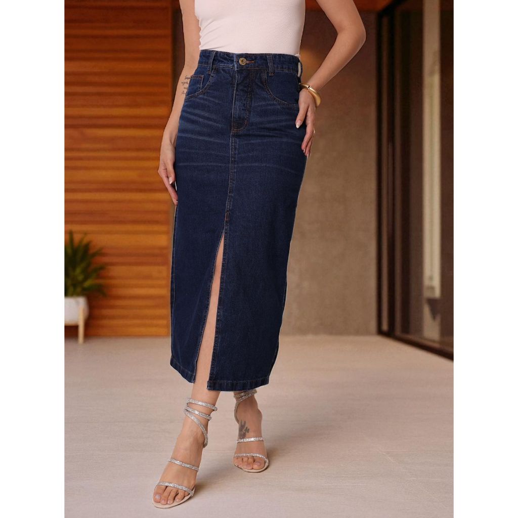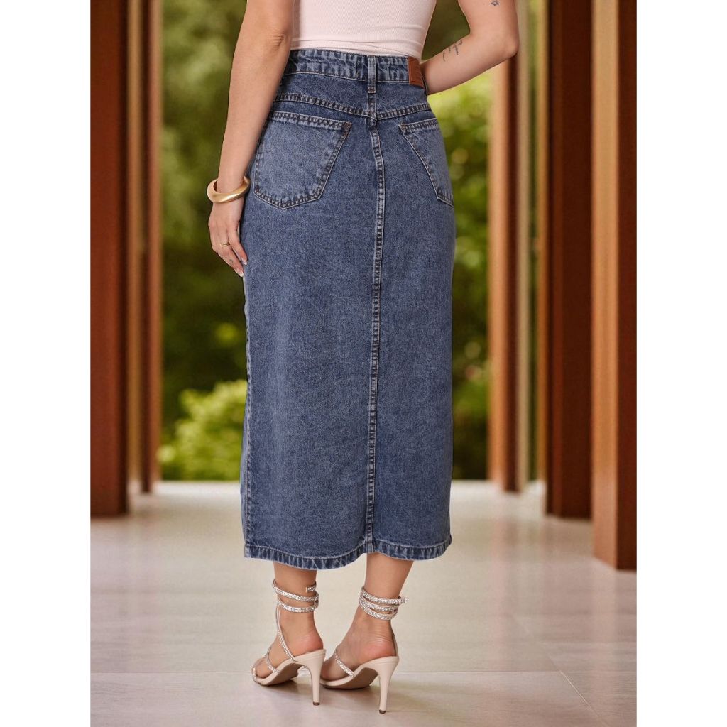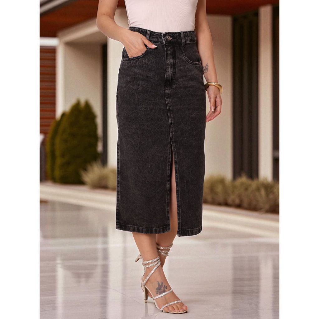 Saia jeans cintura alta modelo fenda tecido esbranquiçados nova 2025