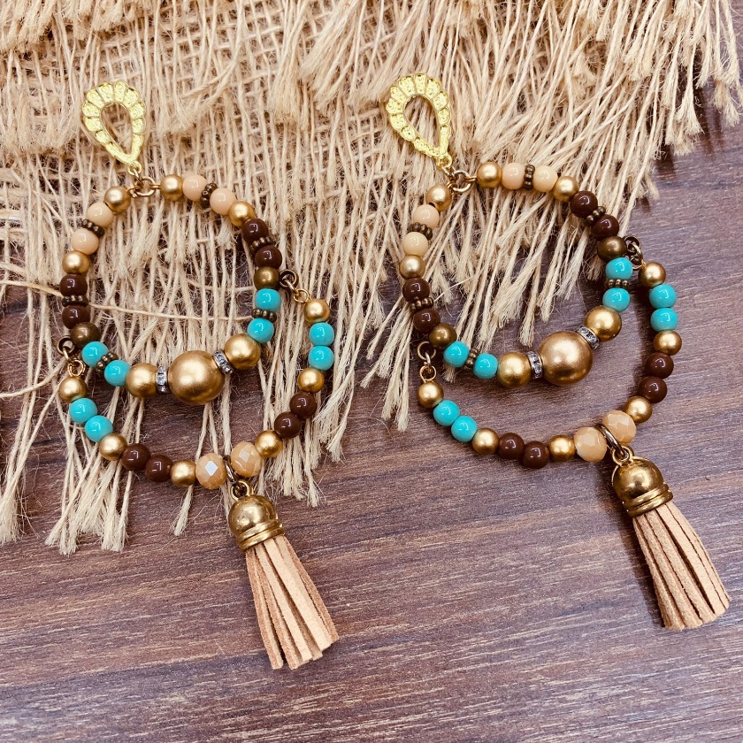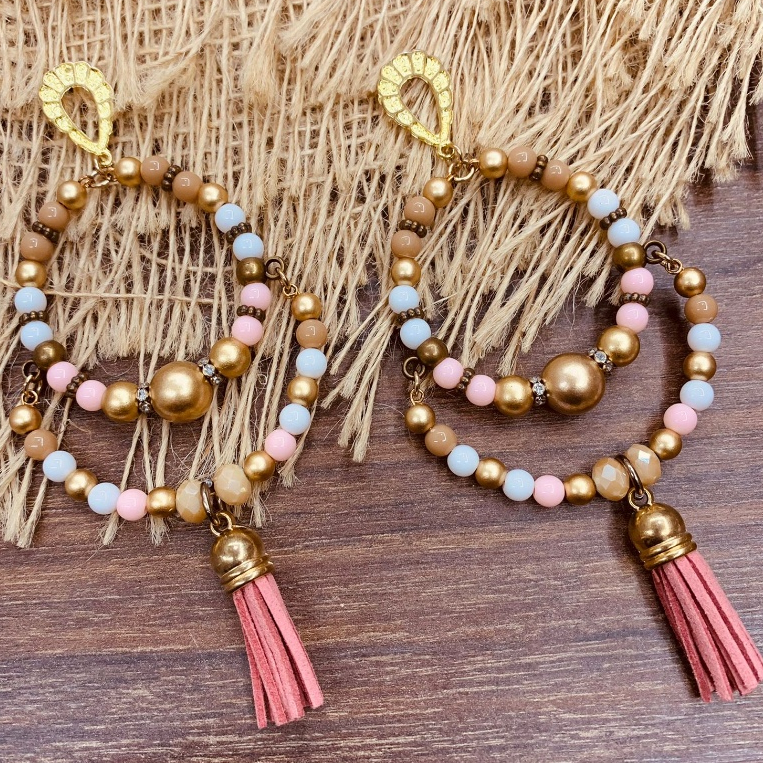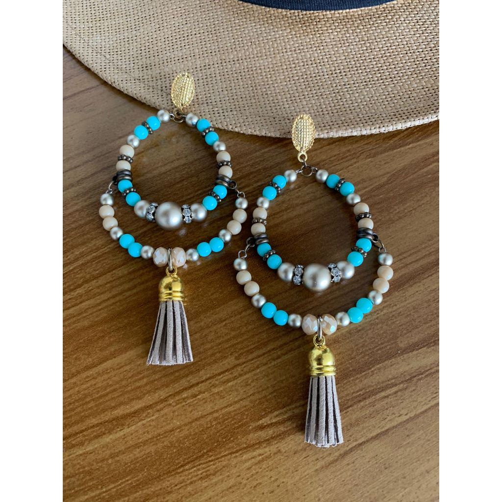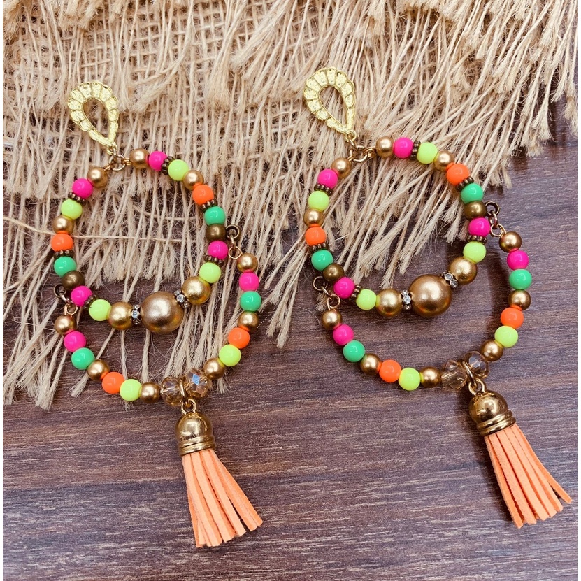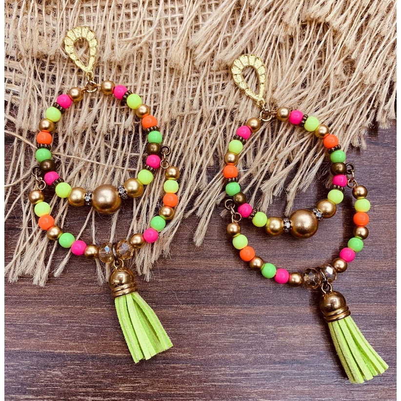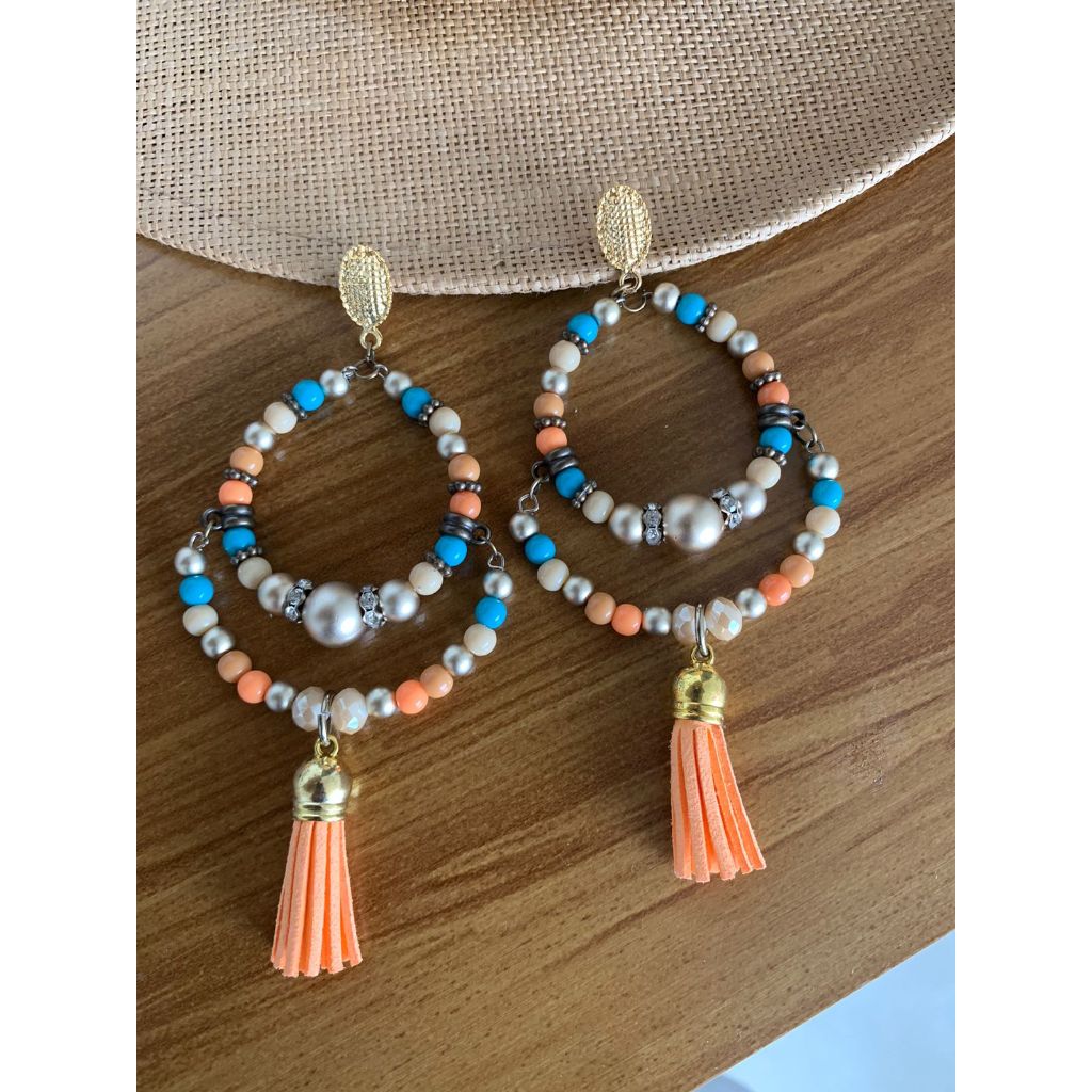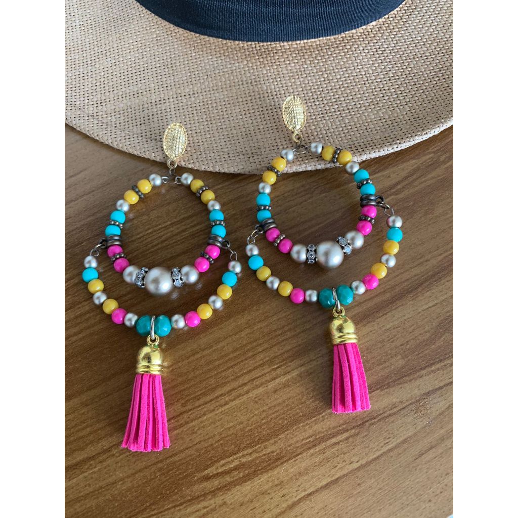 Argola Brinco Bijuterias pompom couro metal missangas Ju