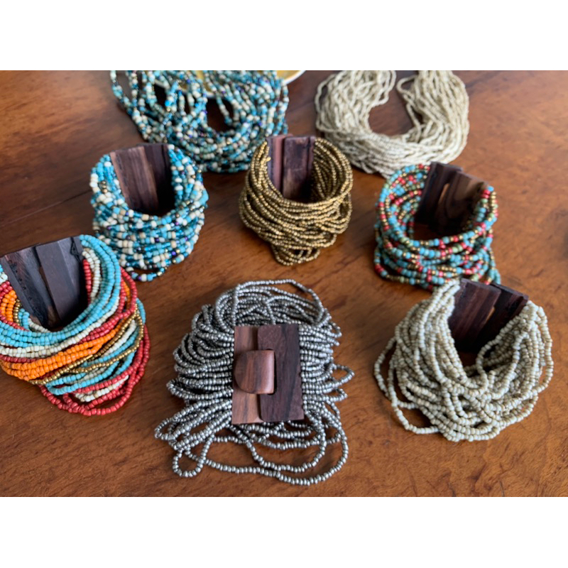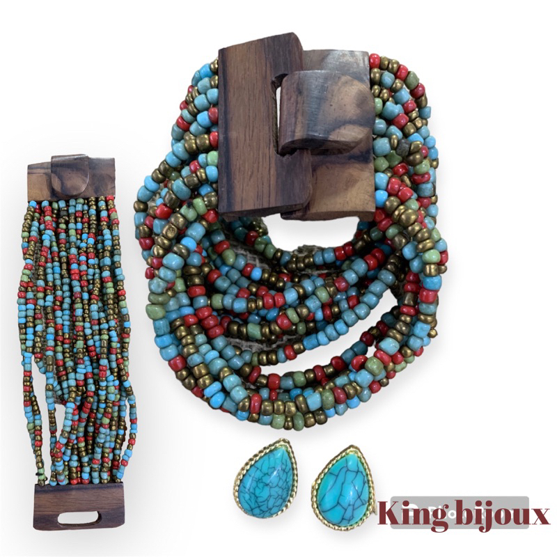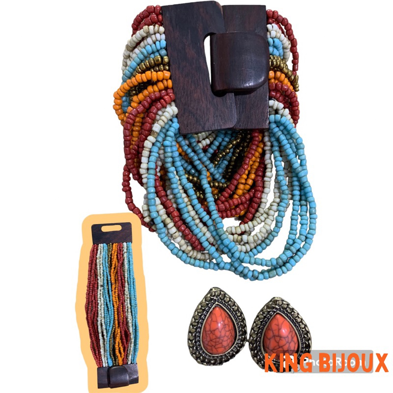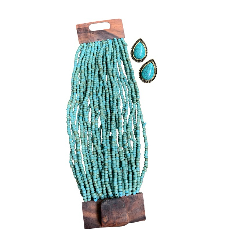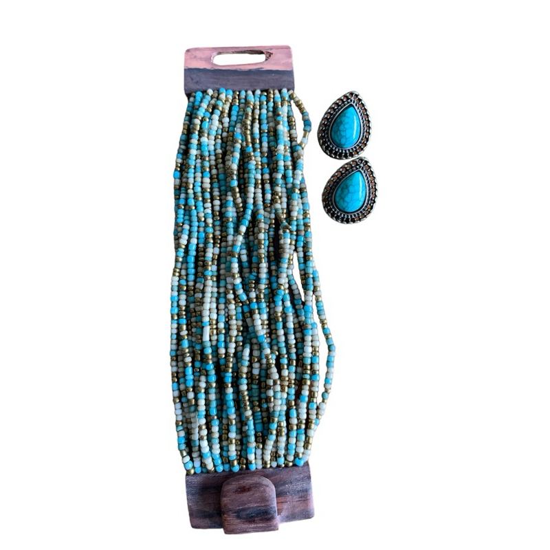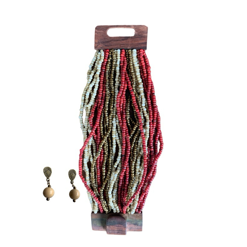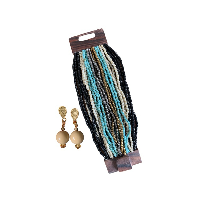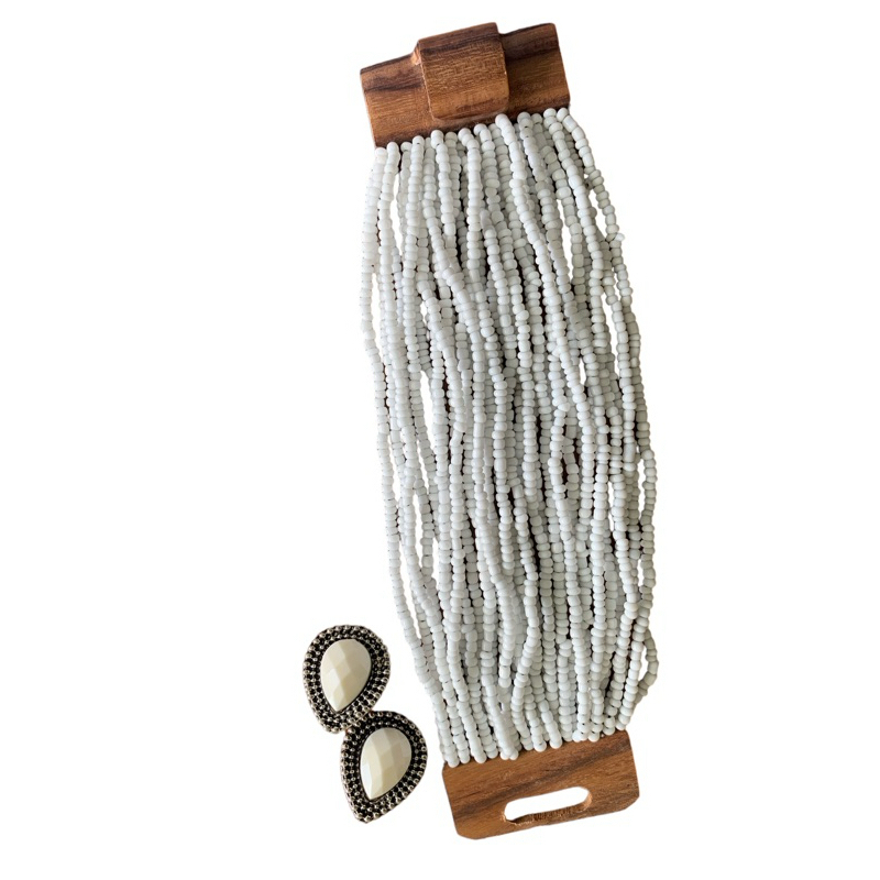 Kit pulseira femininas multicamadas em missangas e fecho madeira + par de brinco