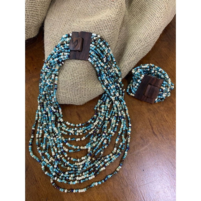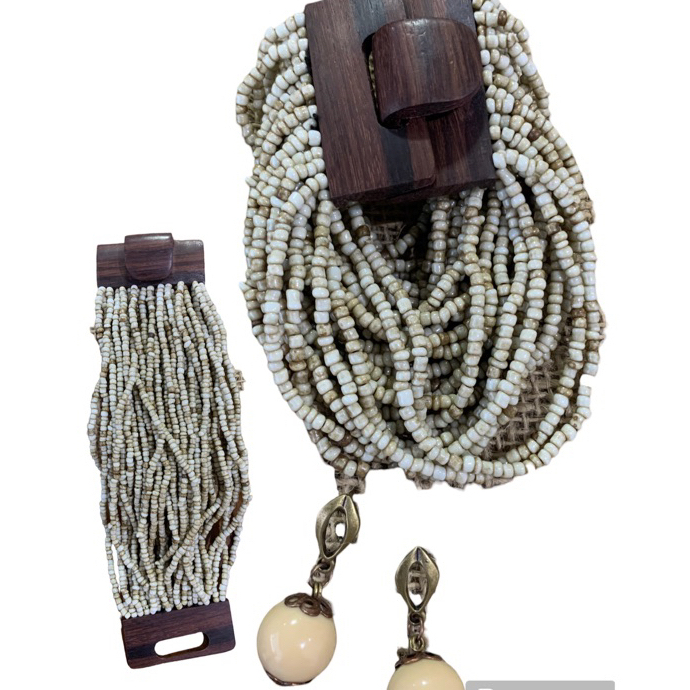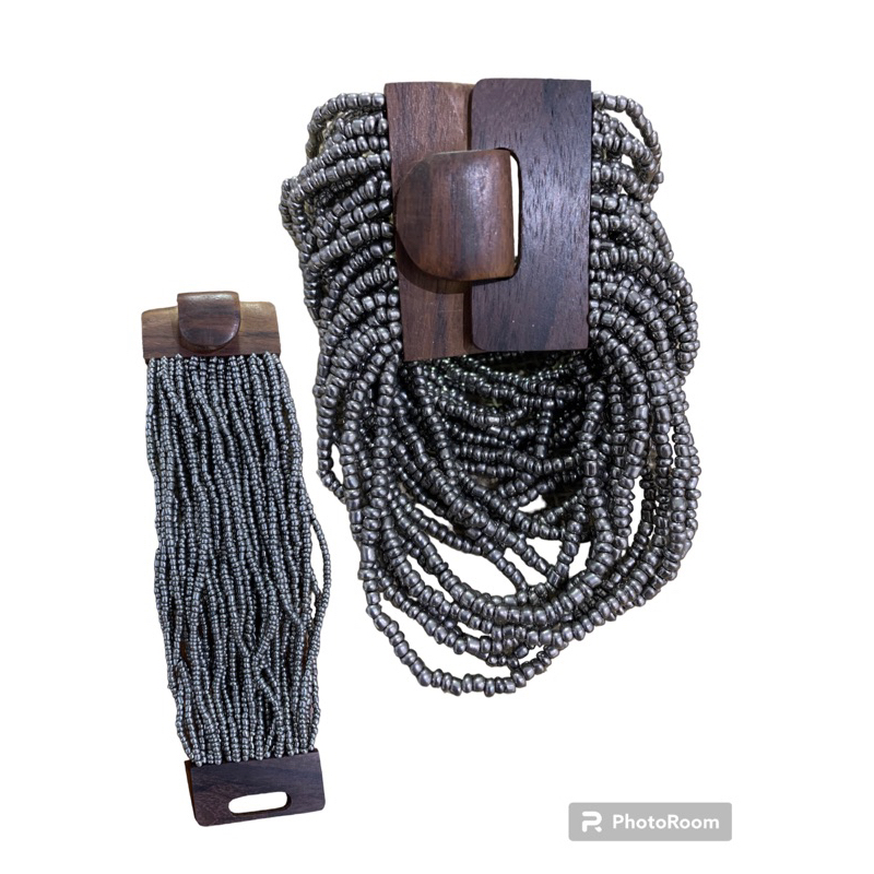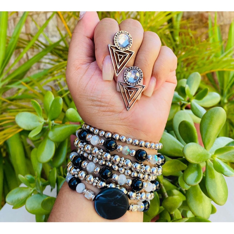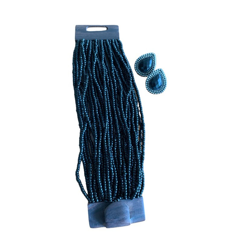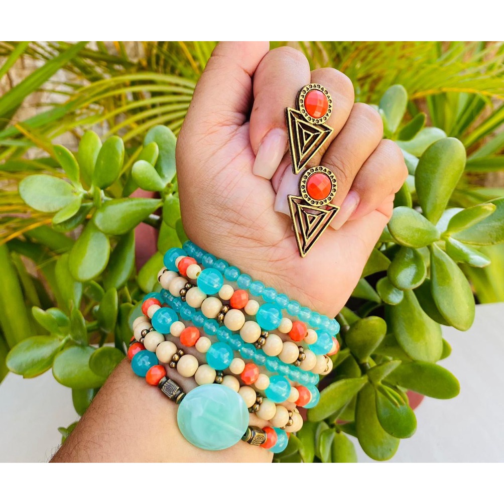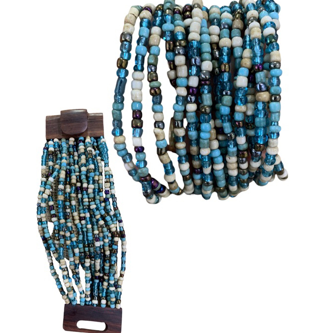 Kit pulseira femininas multicamadas em missangas e fecho madeira + par de brinco