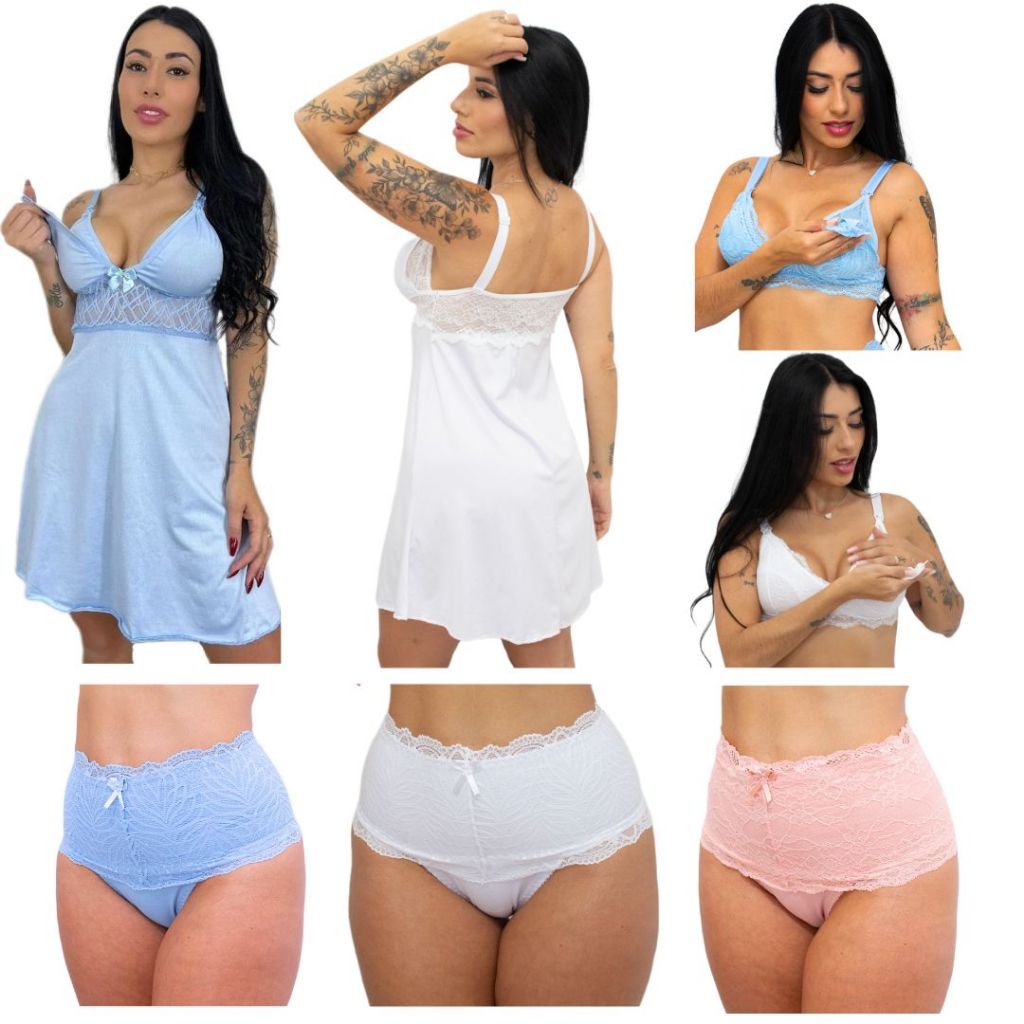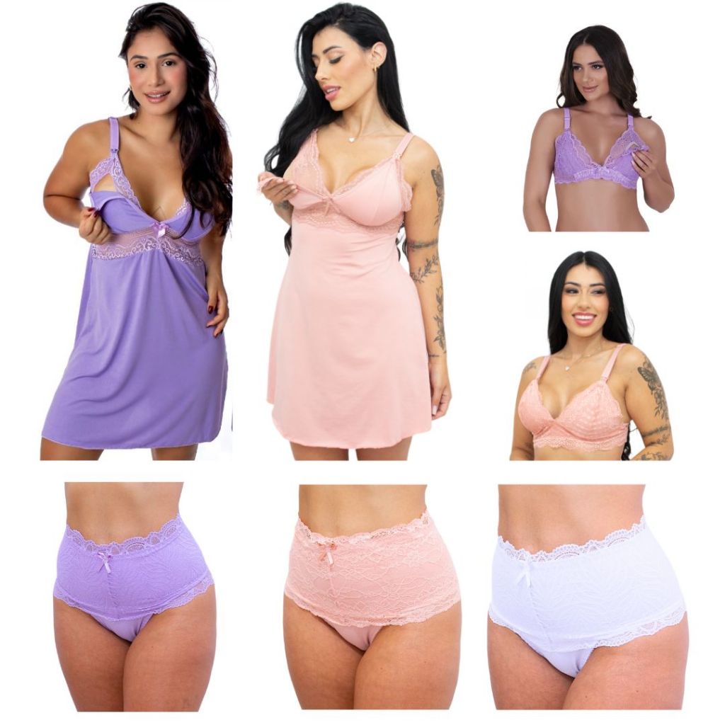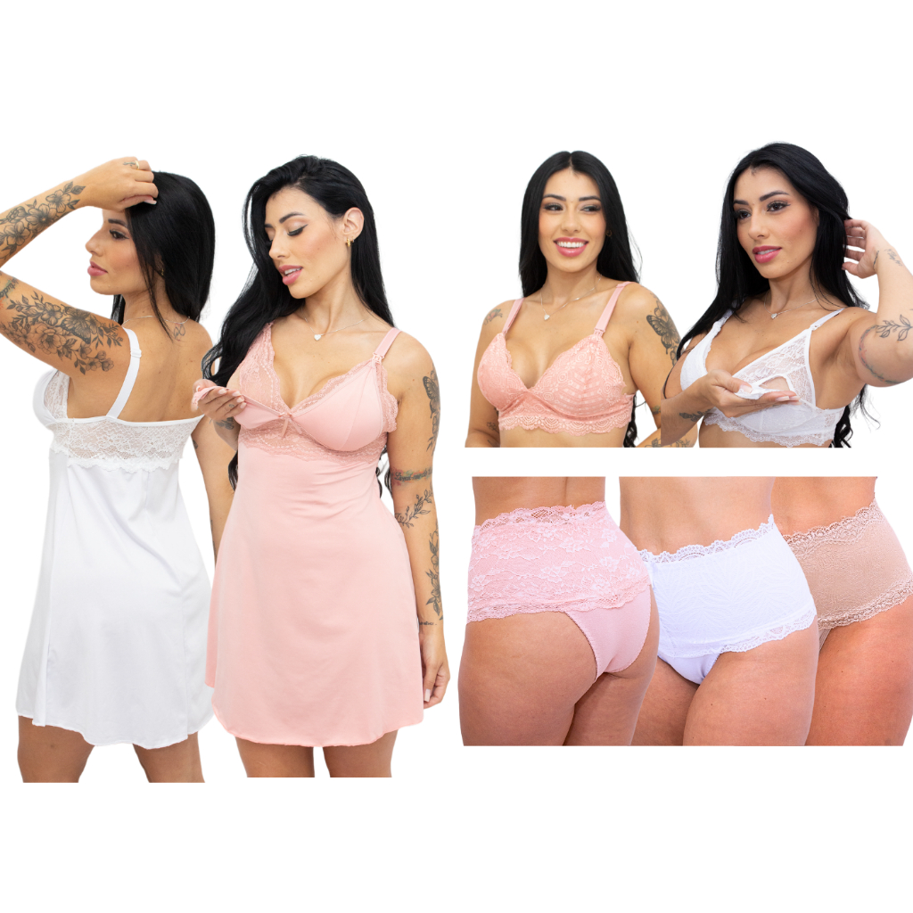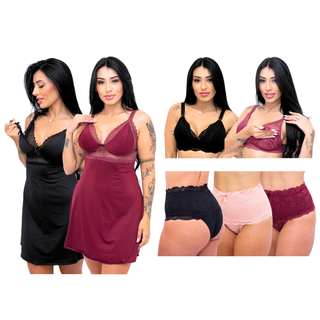 Kit Amamentação 2 Camisola + 2 Sutiã + 3 Calcinha Pós Parto Roupas Para Gestante Lactantes Conjunto