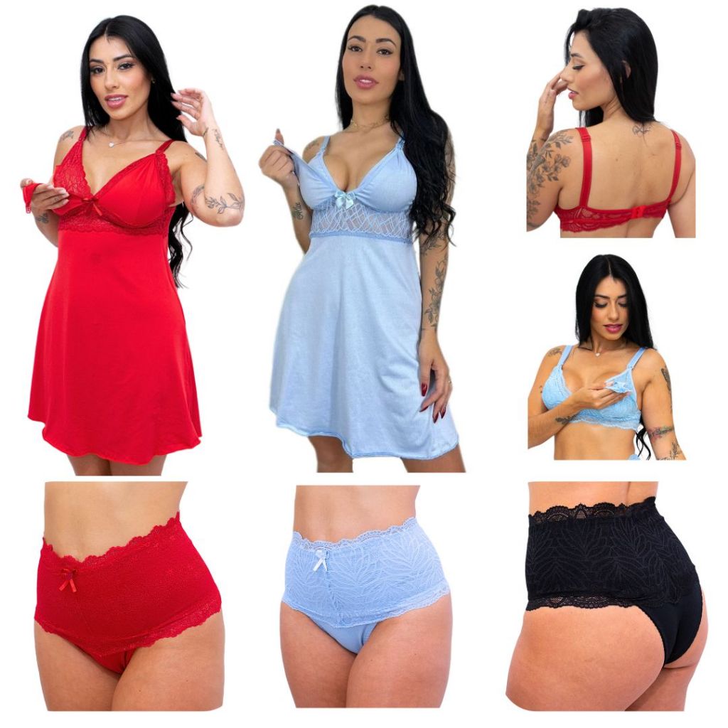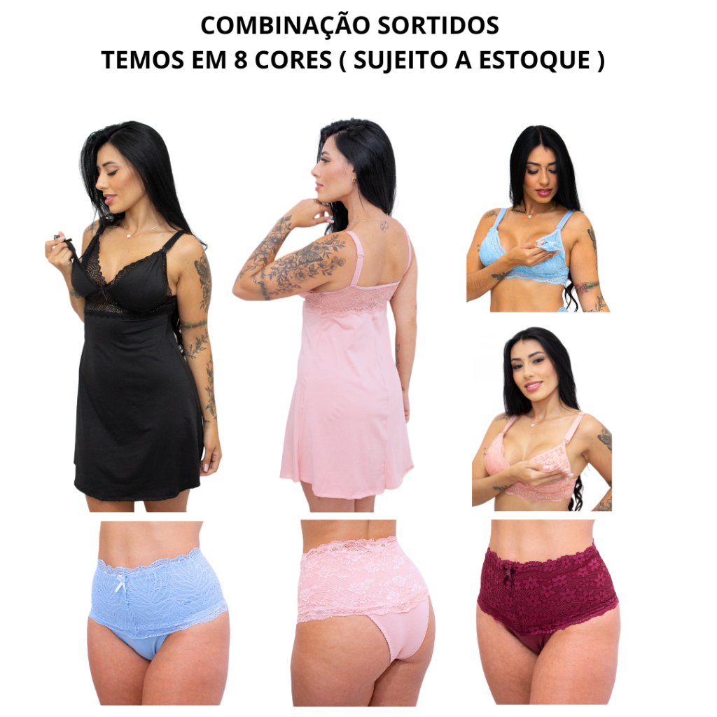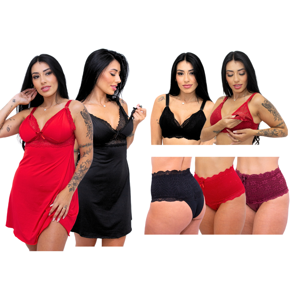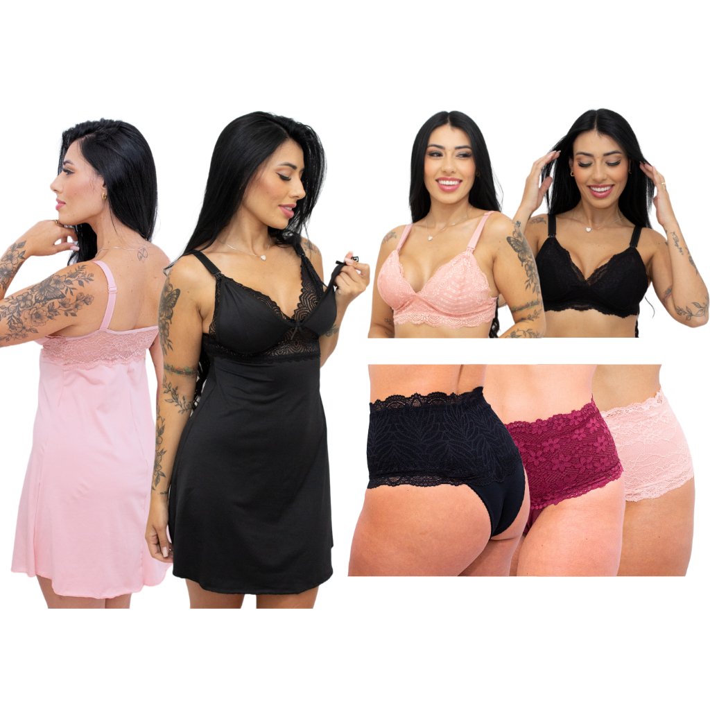 Kit Amamentação 2 Camisola + 2 Sutiã + 3 Calcinha Pós Parto Roupas Para Gestante Lactantes Conjunto