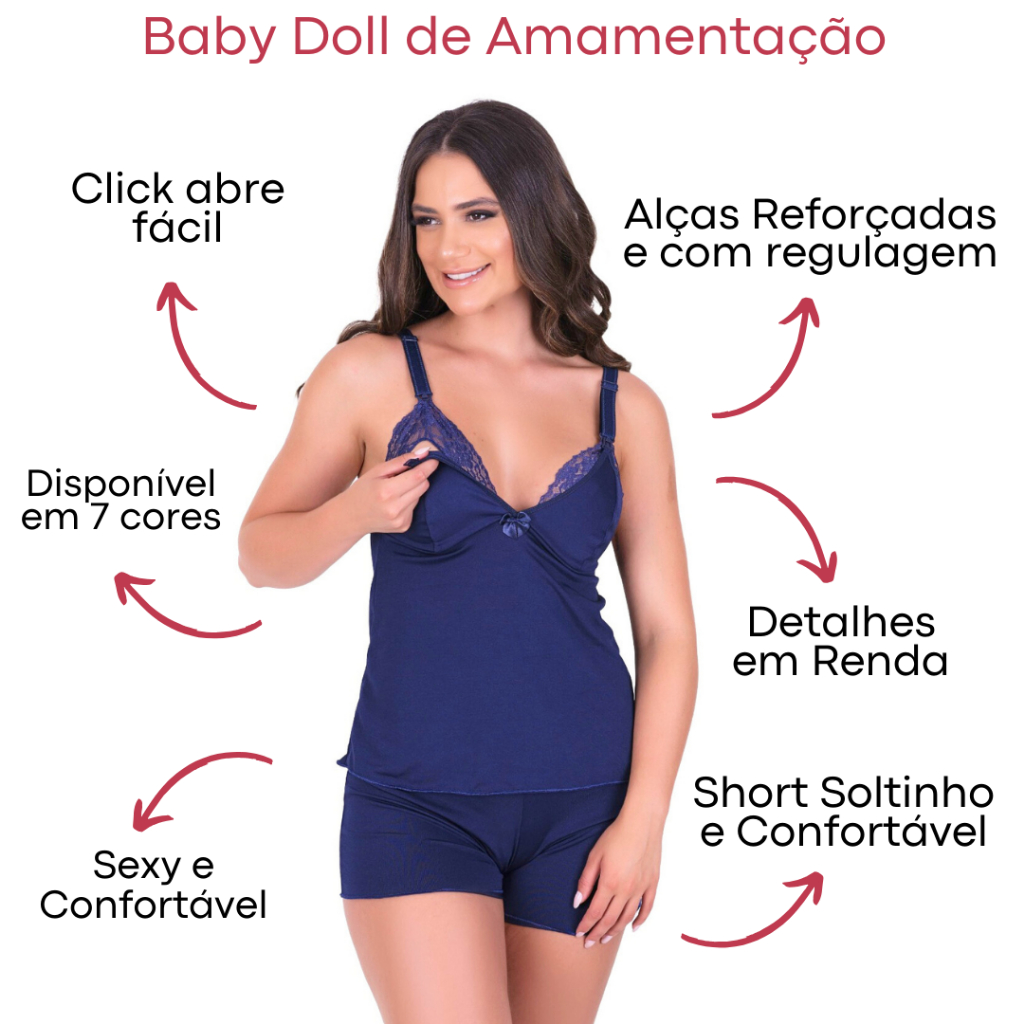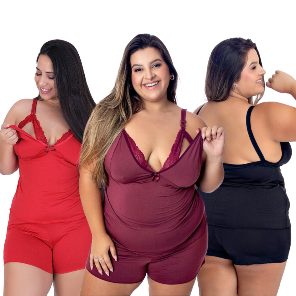 Kit 3 BabyDoll Amamentação Sexy Short Doll Blusinha Regulagem Shortinho Renda Pós Parto maternidade