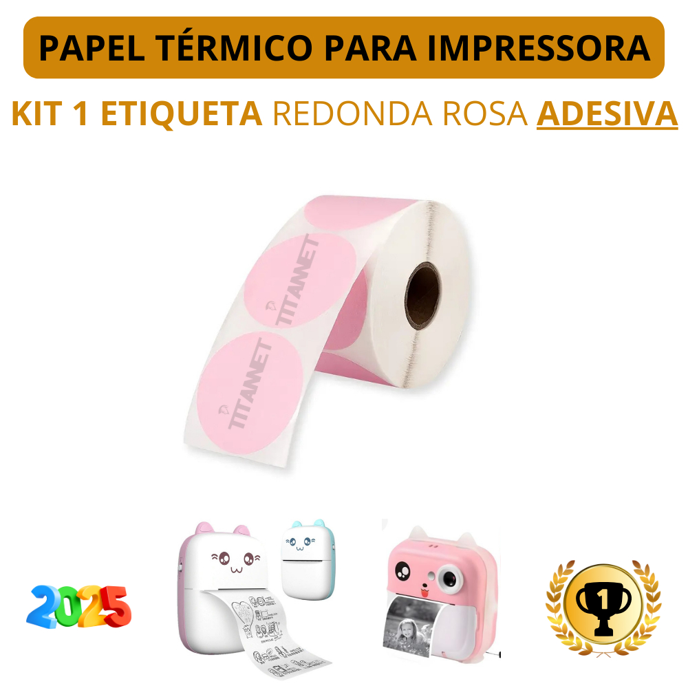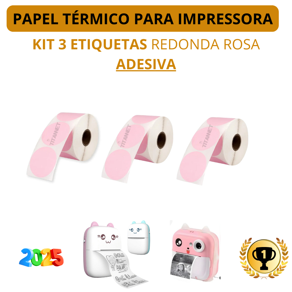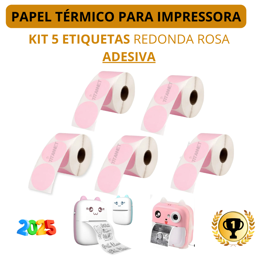 Kit com 1, 3 e 5 Rolos de Etiqueta Adesiva Redonda Rosa para Impressora Gato