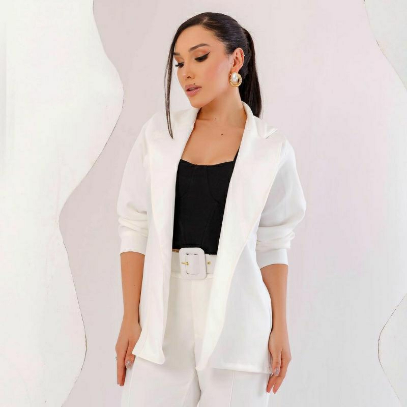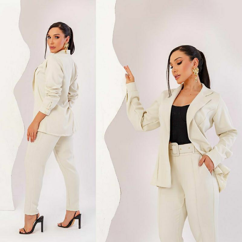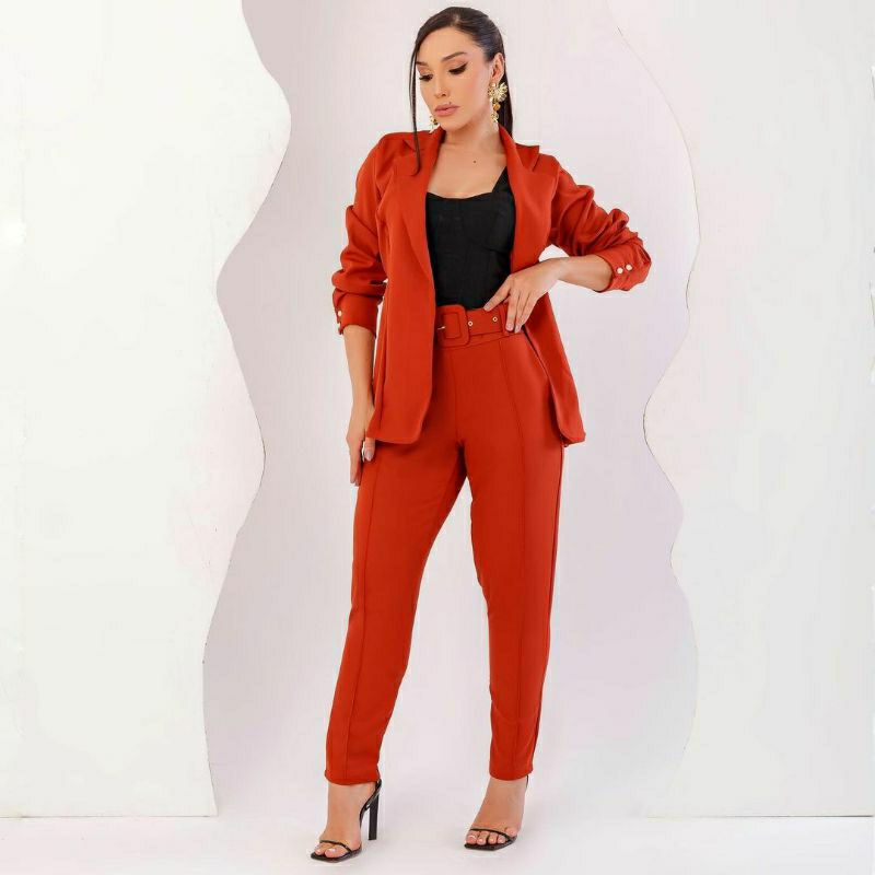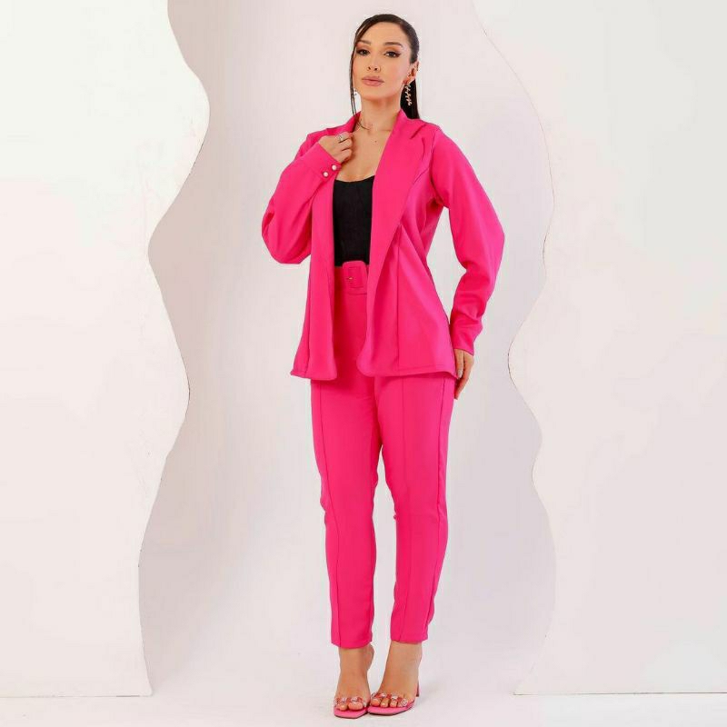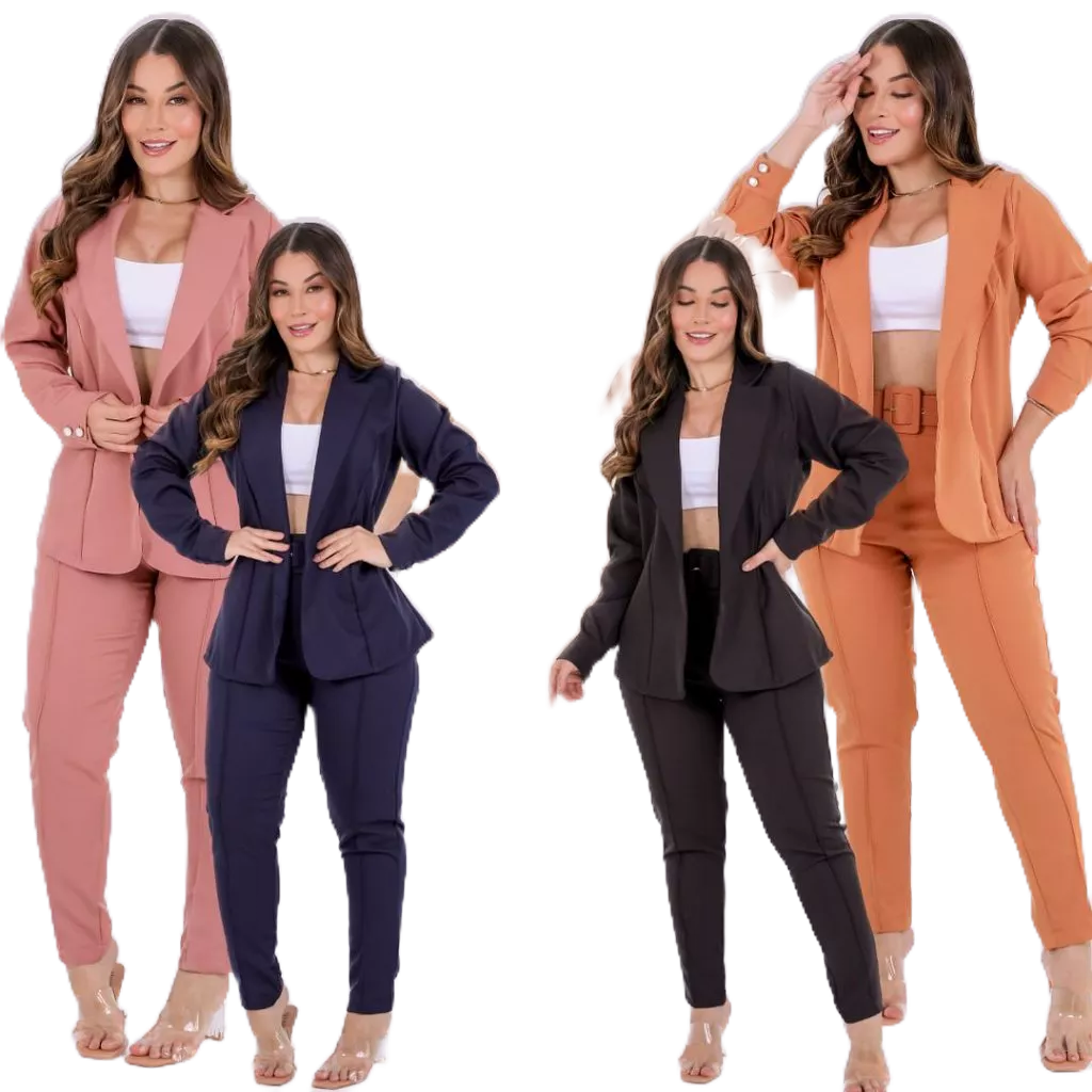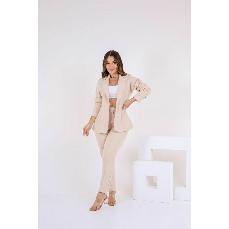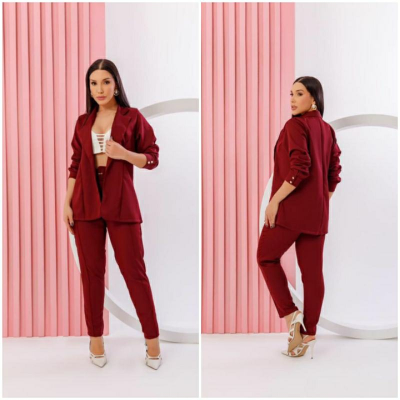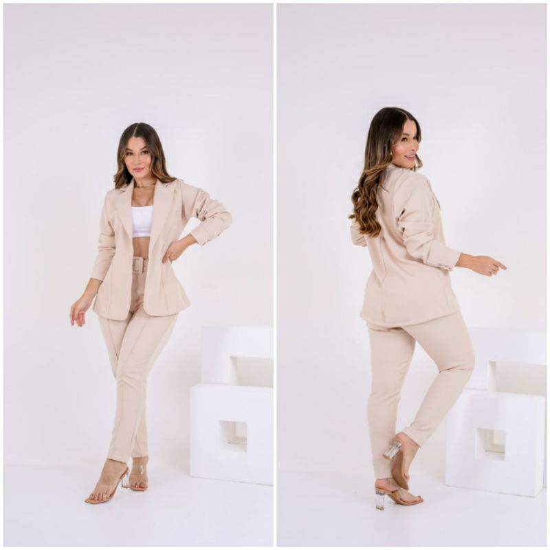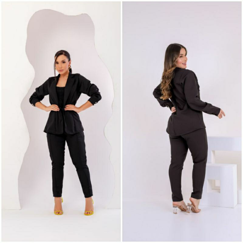 Conjunto Feminino Blazer, Em Alfaiataria Blazer Manga Longa Calça Tipo Skinny e Cropped Em Malha.