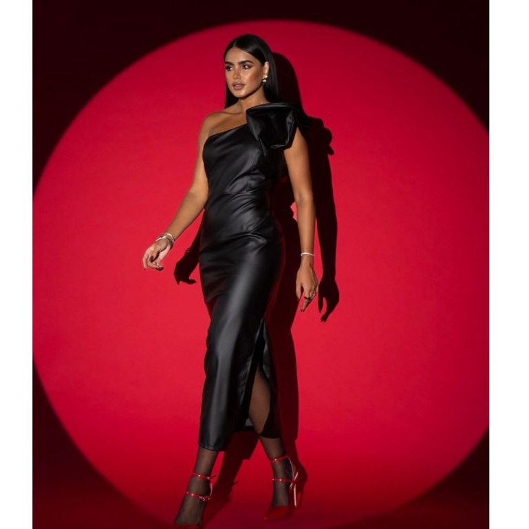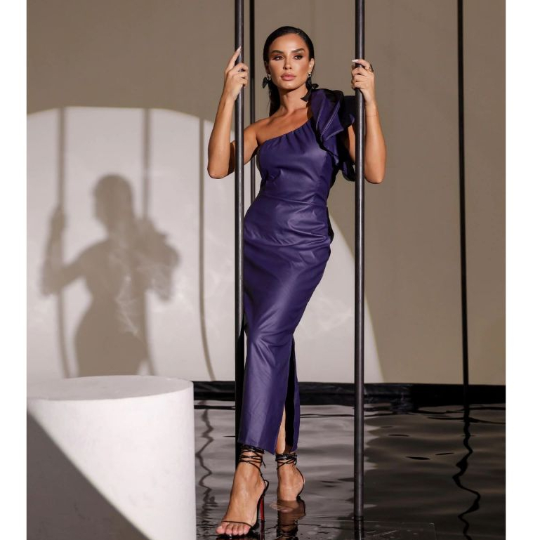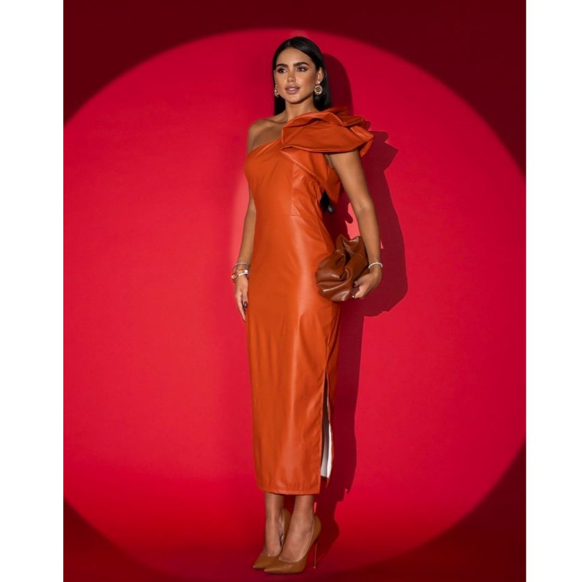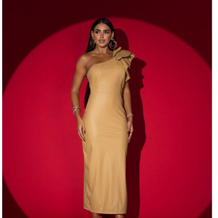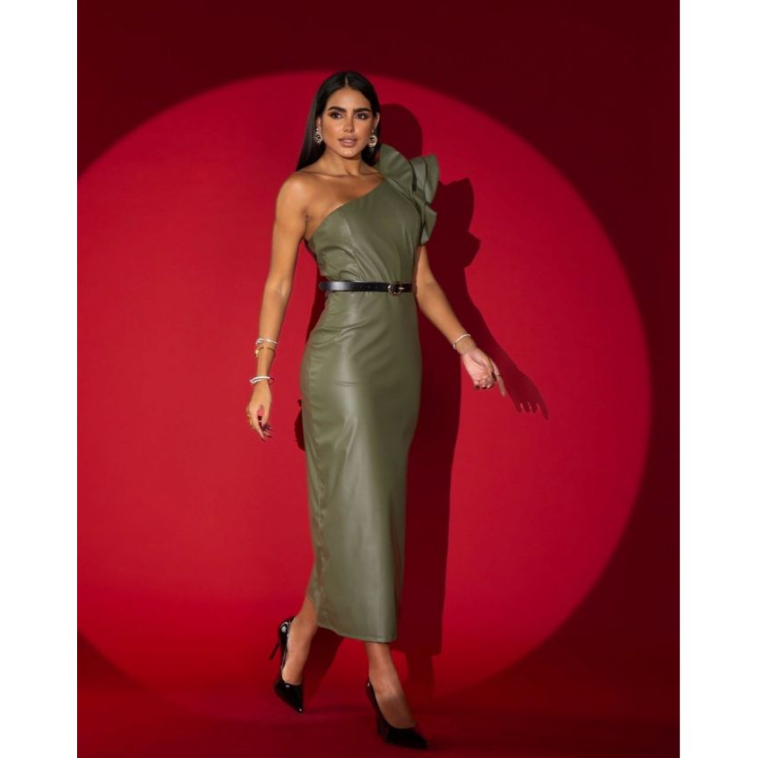 Vestido Feminino Talita, Mídi - Com Decote Assimétrico - Manga Única Com Babado - Zíper Traseiro