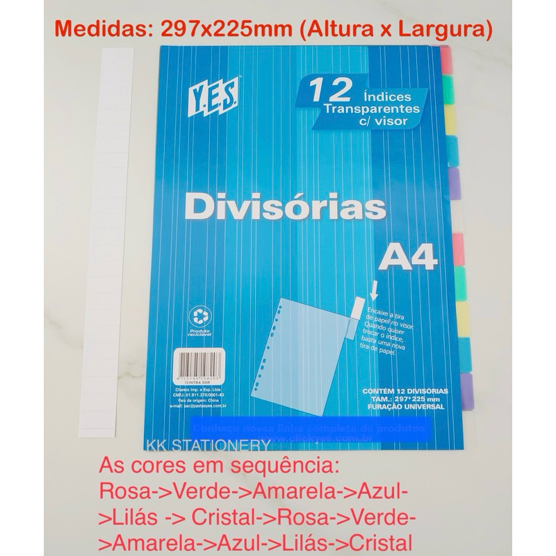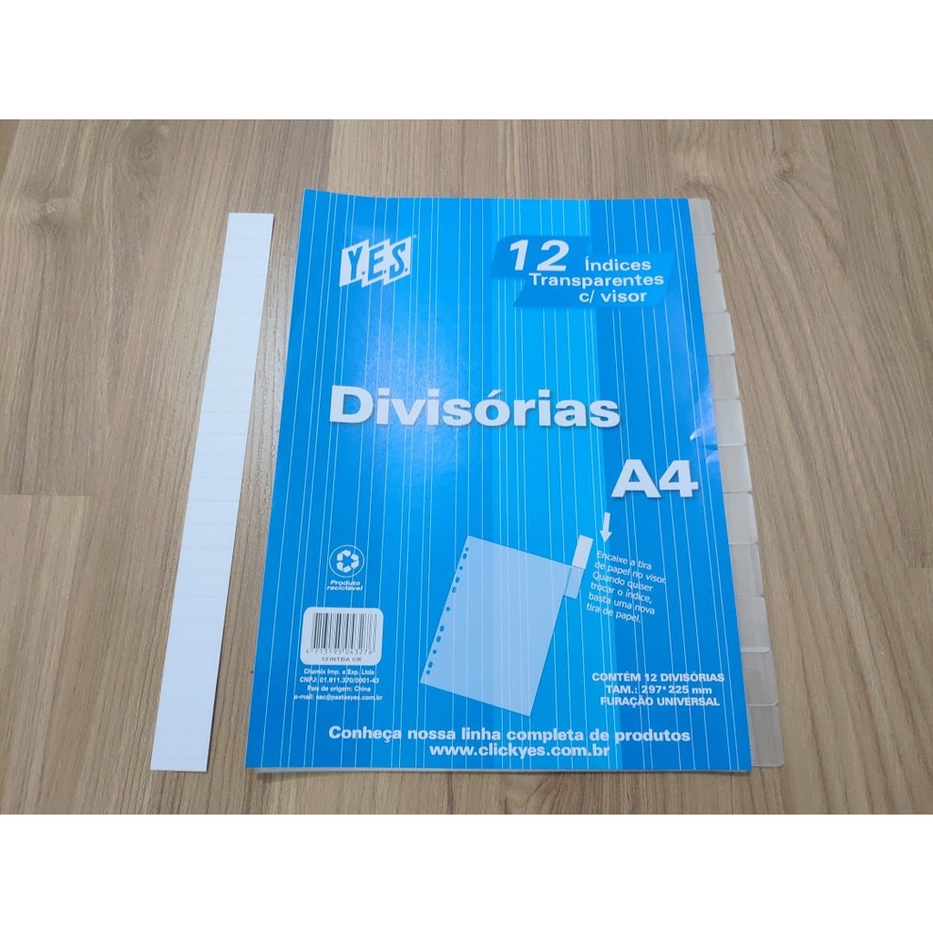 Divisórias de Fichário A4 Furo Universal 12 Divisões c/ Visor Yes