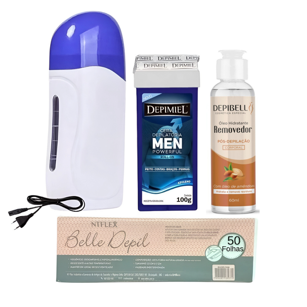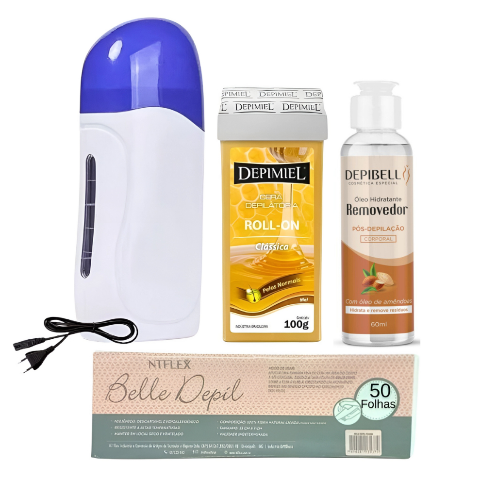 Kit 3 Cera Quente Depimiel 100g + Aquecedor Roll On + Óleo Removedor 50 Folhas Tnt Depilaçao