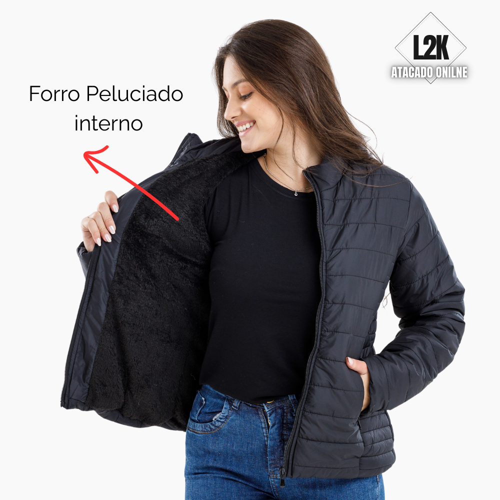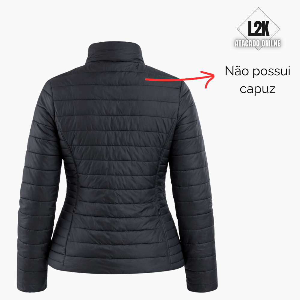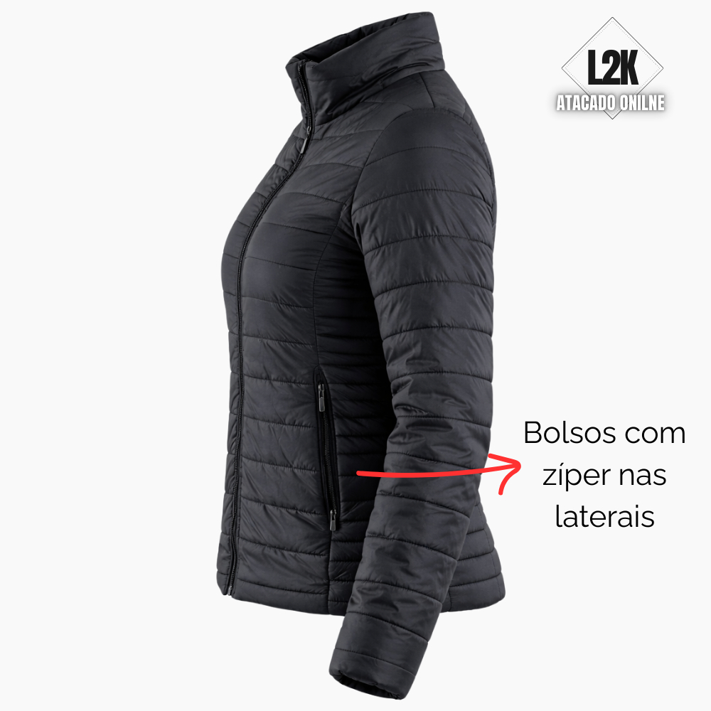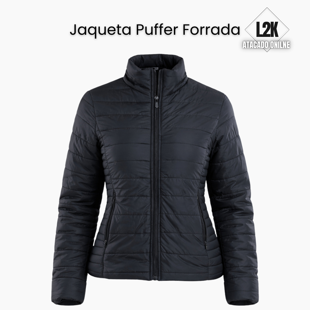 Jaqueta Puffer Preta Feminina Forrada Com Bolsos Laterais Sem Capuz