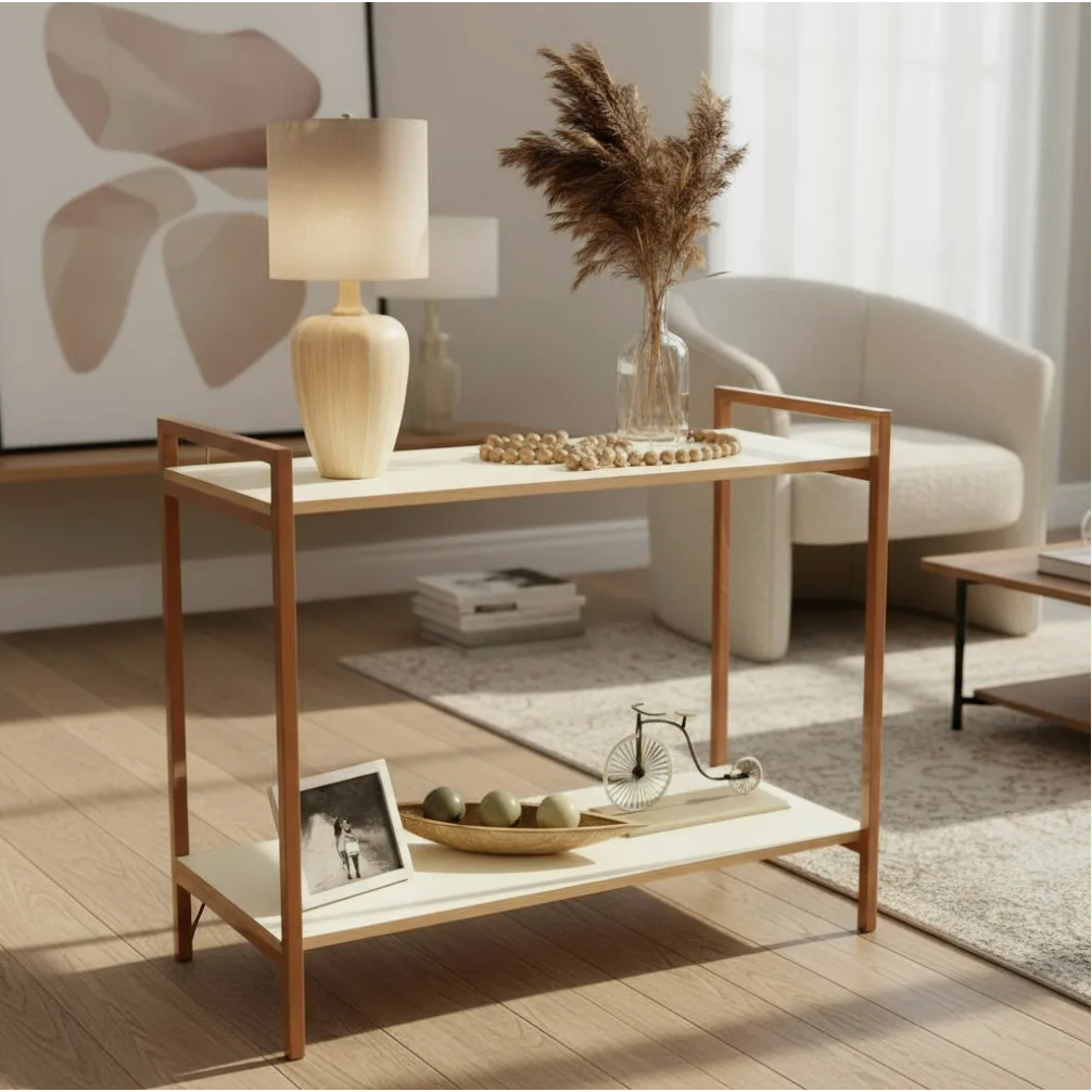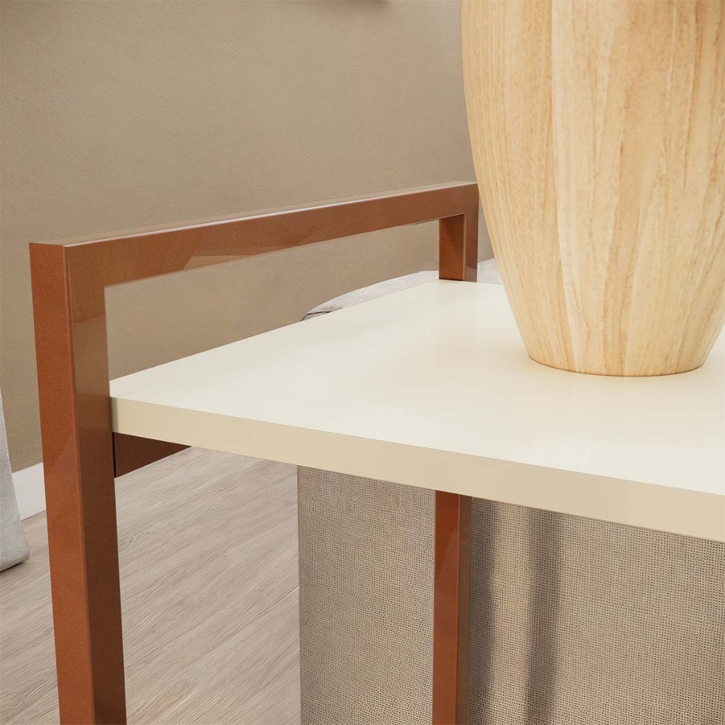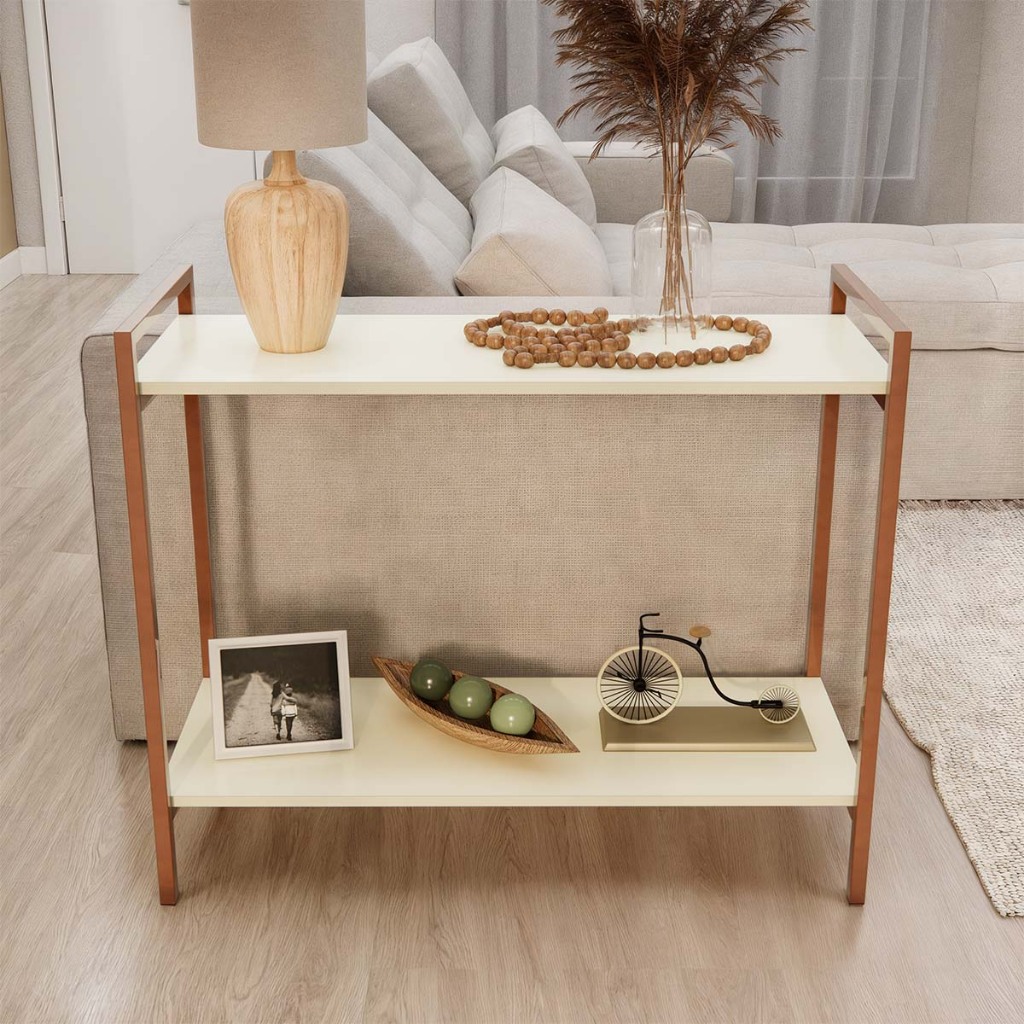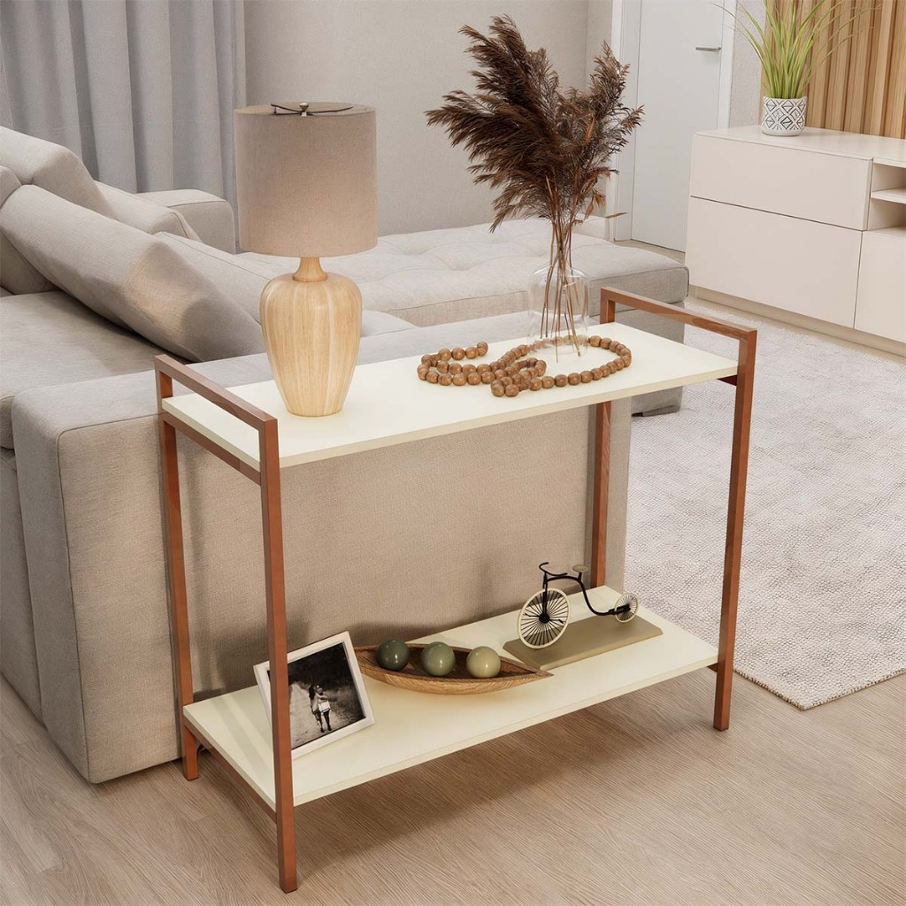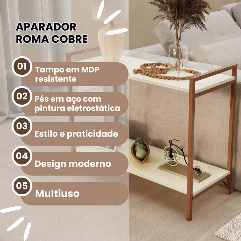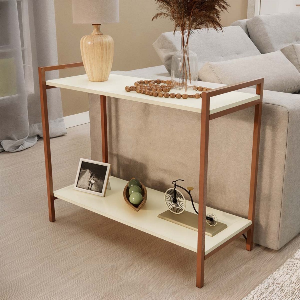Mesa aparador lateral canto sofá cobre decoração sala buffet cantinho café duas prateleiras industrial