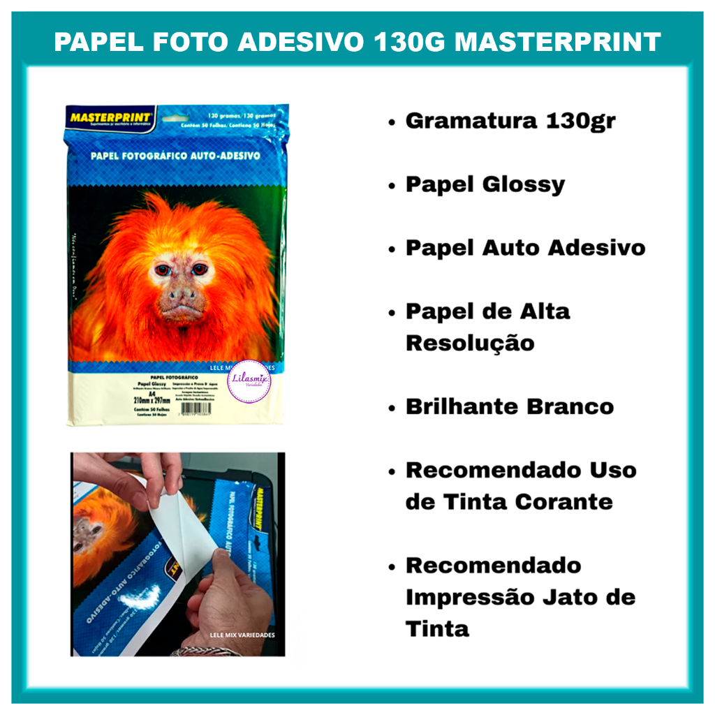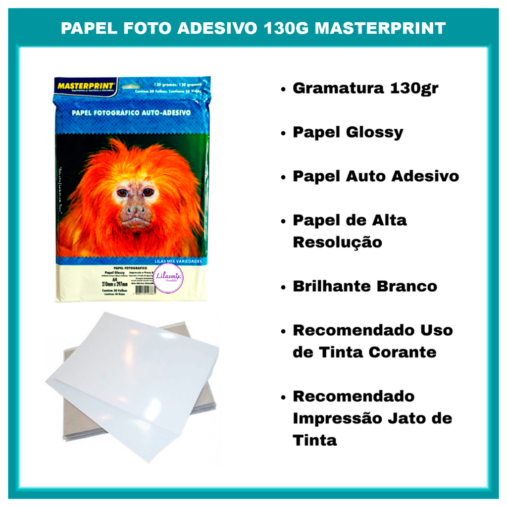 Papel Fotográfico Adesivo 130g A4 Brilhante Glossy Secagem Rápida Artesanato MASTERPRINT - 50 Folhas
