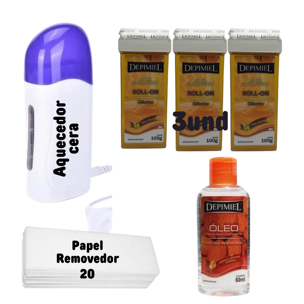 KIT Aparelho Aquecedor De Cera Quente Roll On + 3 Refil De Cera Rolon + Oleo Removedor + Papel