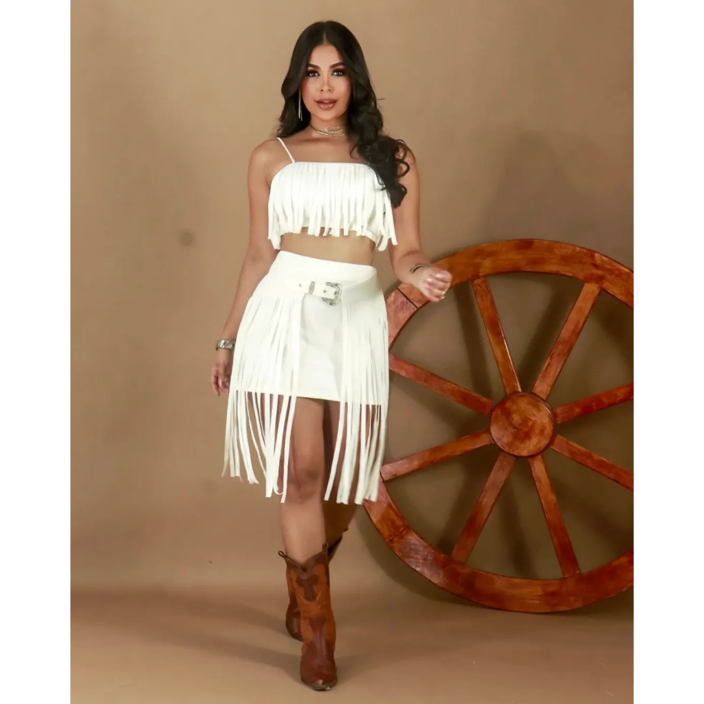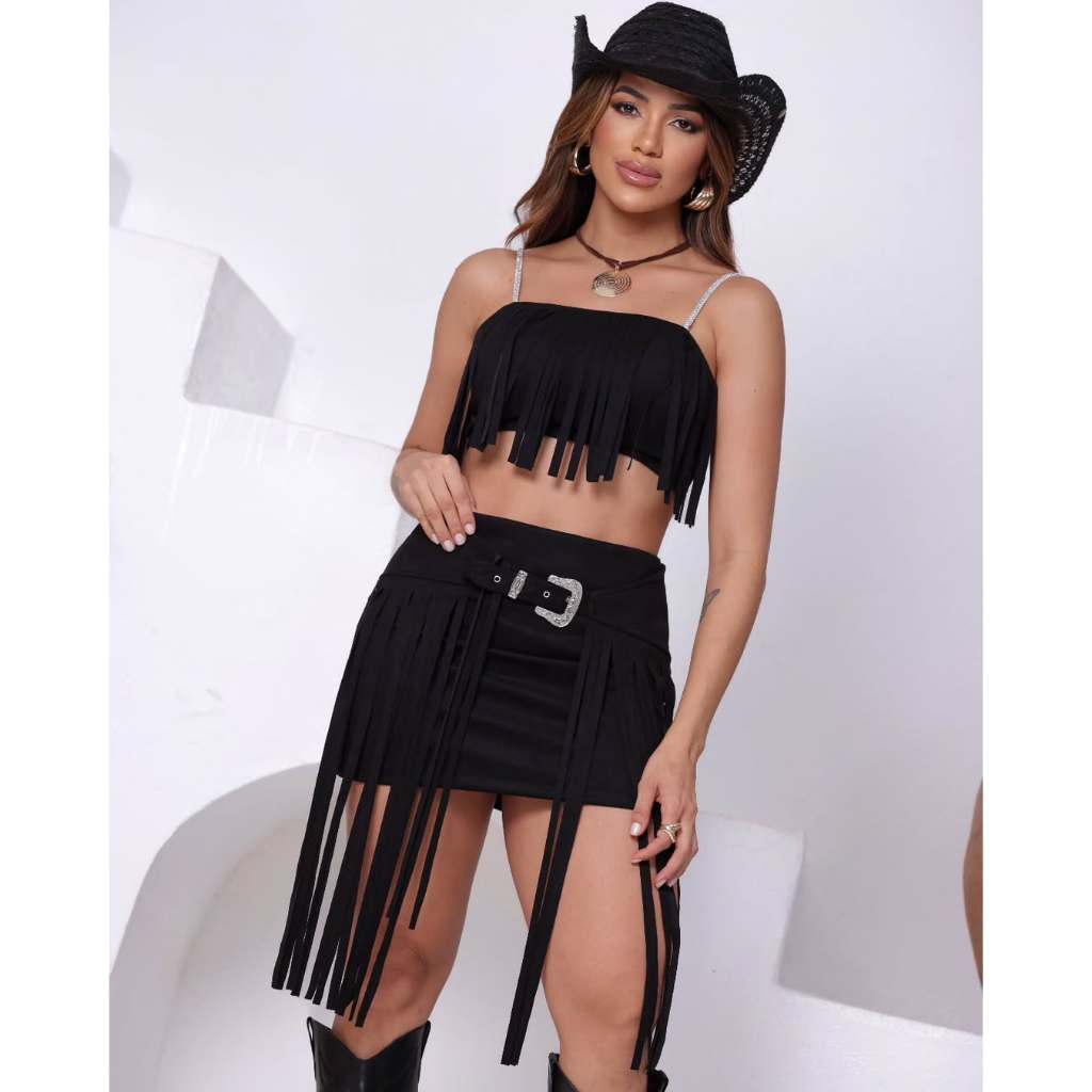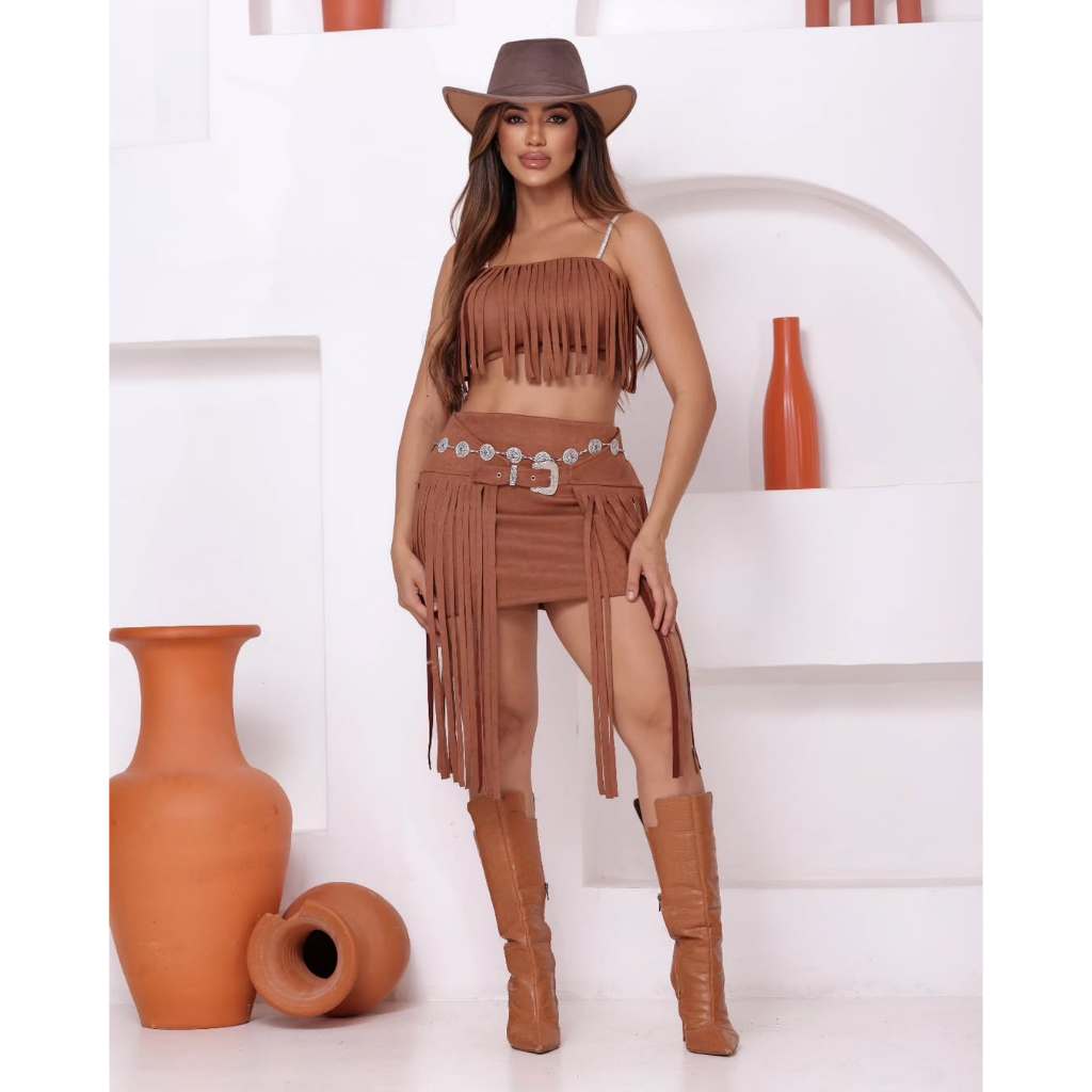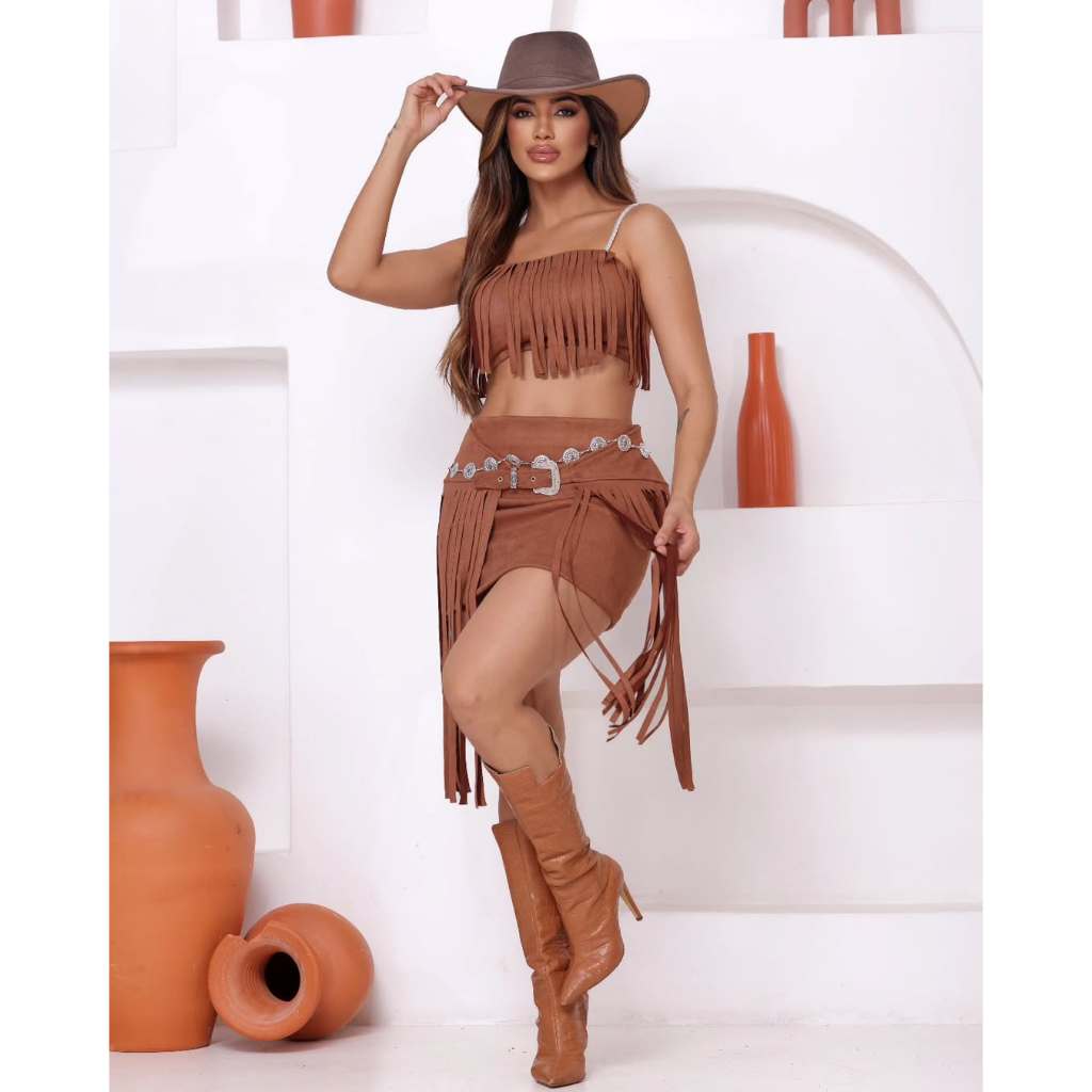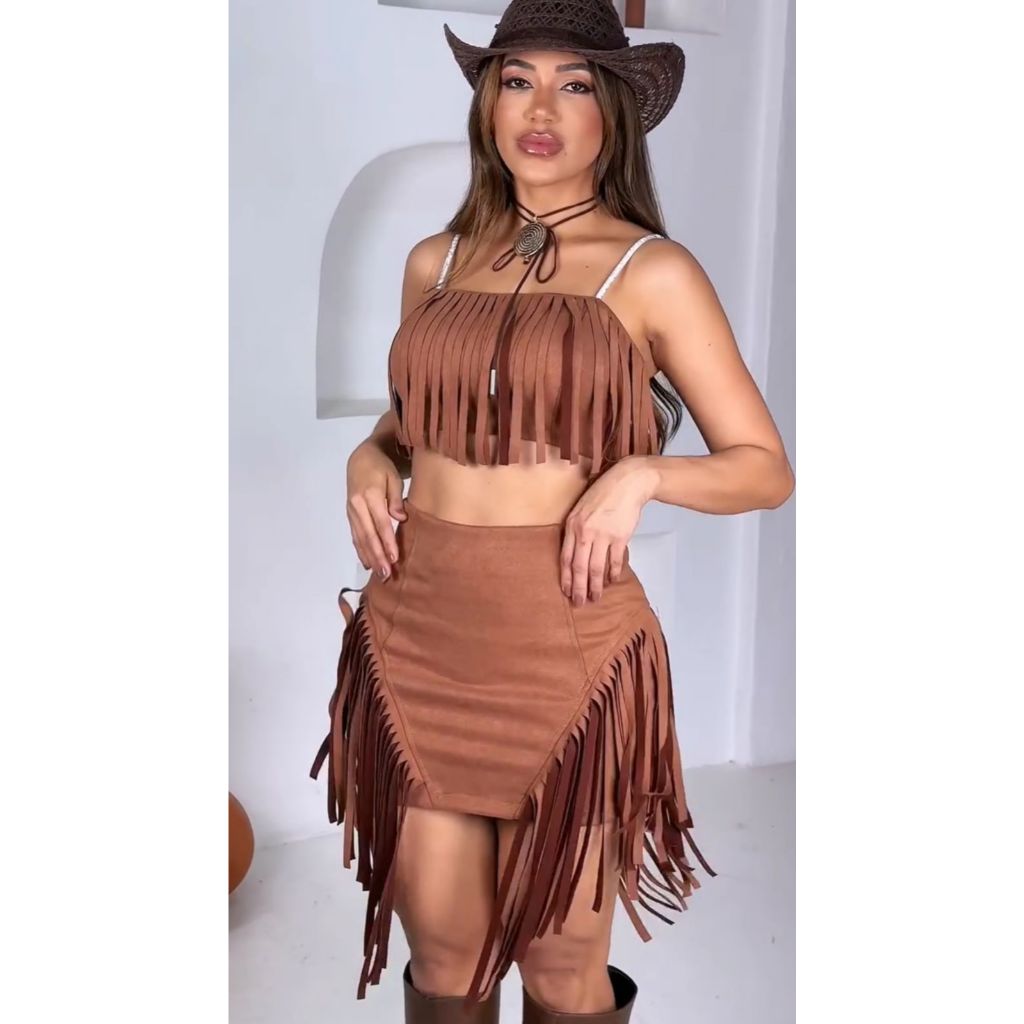 Conjunto Mini Saia + Cropped Com Franja Em Suede Outono Luxo