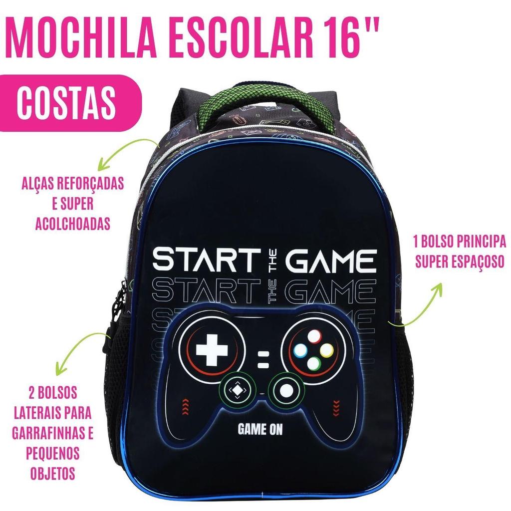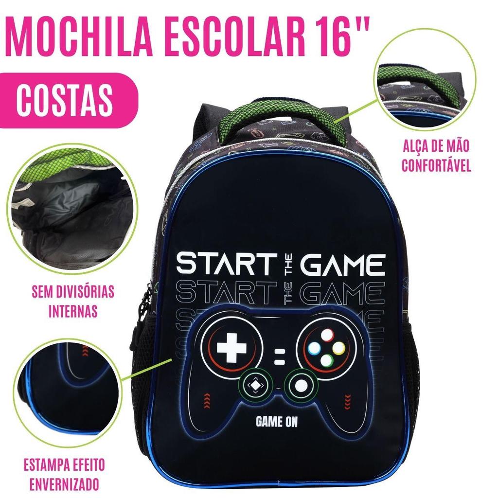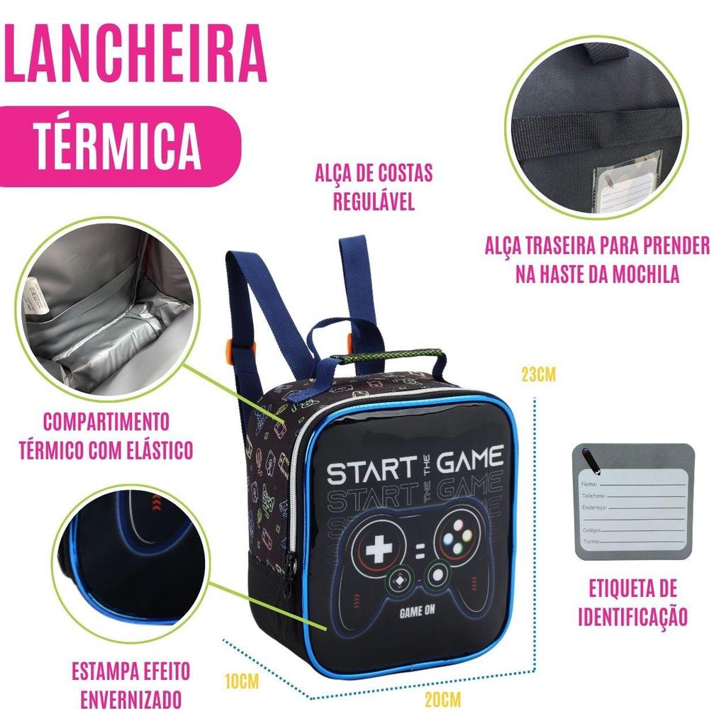 Kit Mochila de Costas Escolar Menino Gamer C/ Estojo Lancheira Térmica Material Resistente Acolchoada Estudo