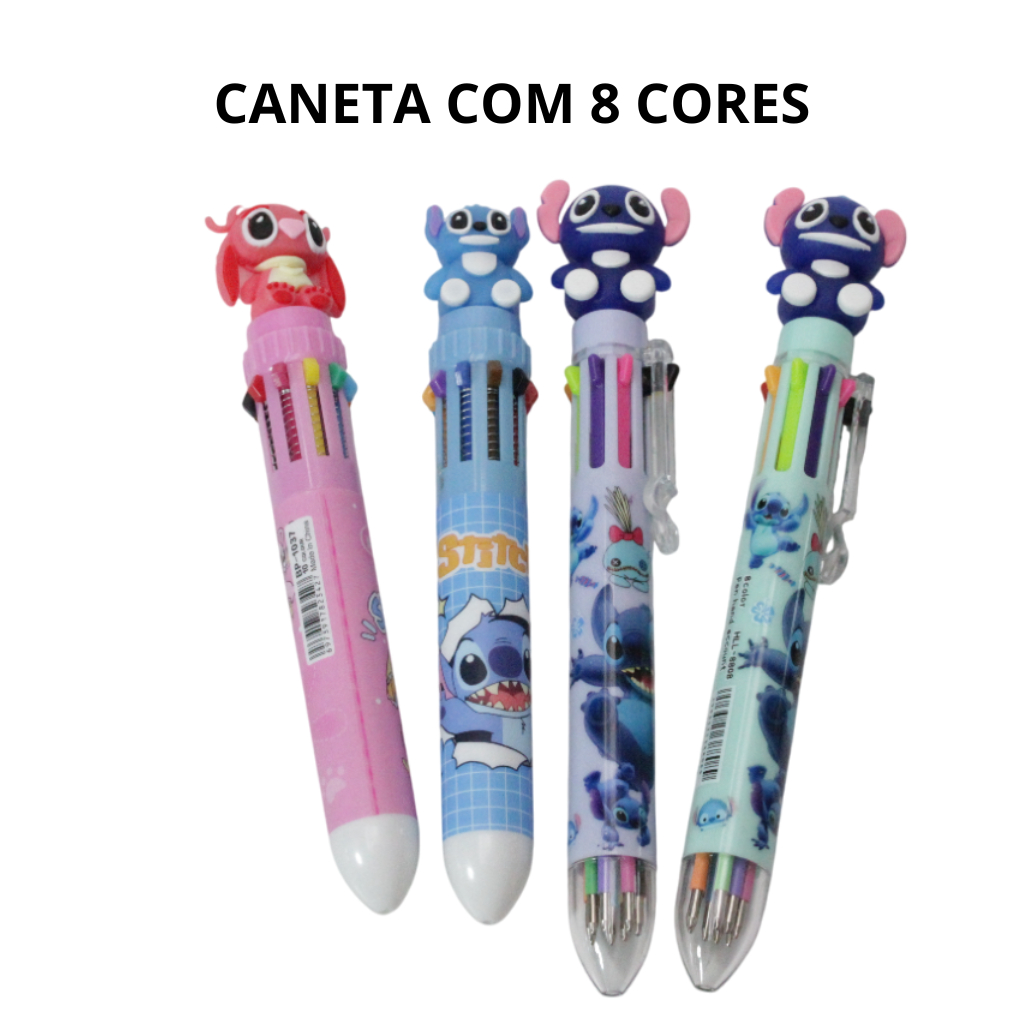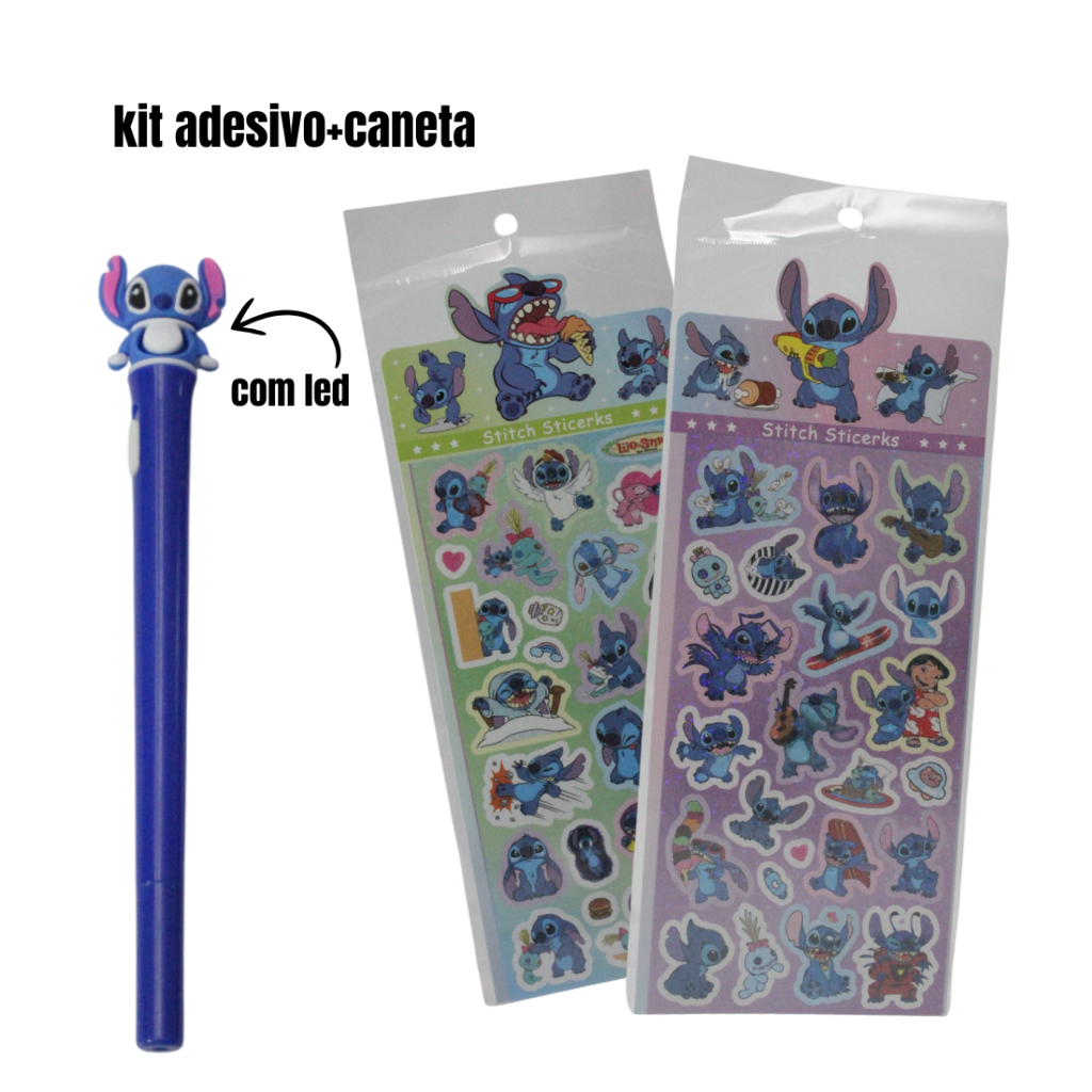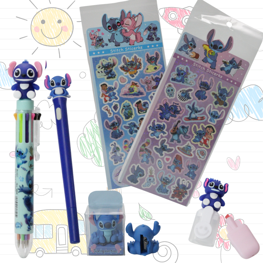 Caneta Escolar e Escritório 8 Cores com Led, Apontador e Marca Texto, e Adesivos do Stitch, Kit 6 Itens