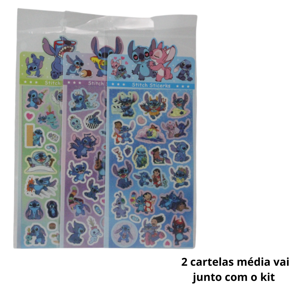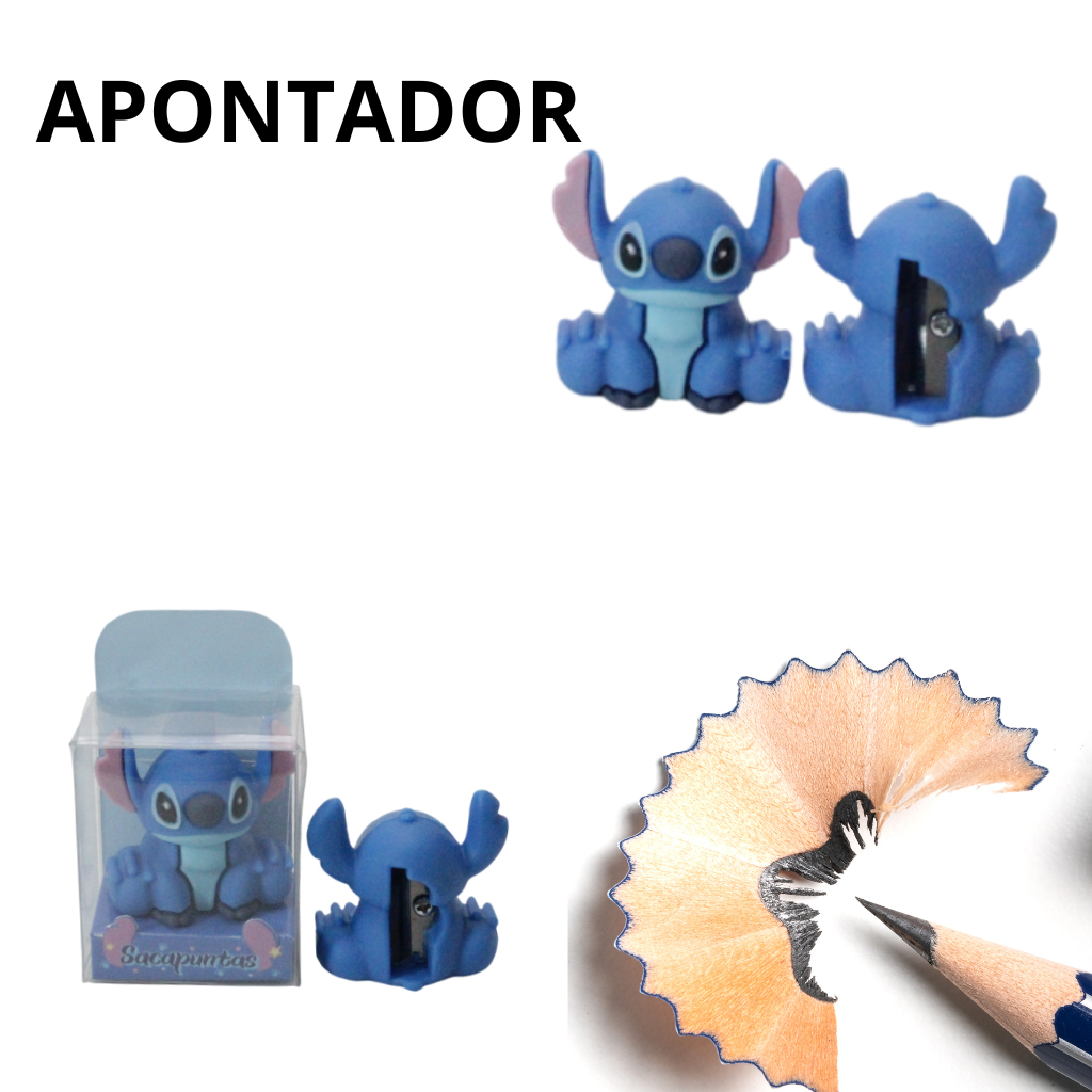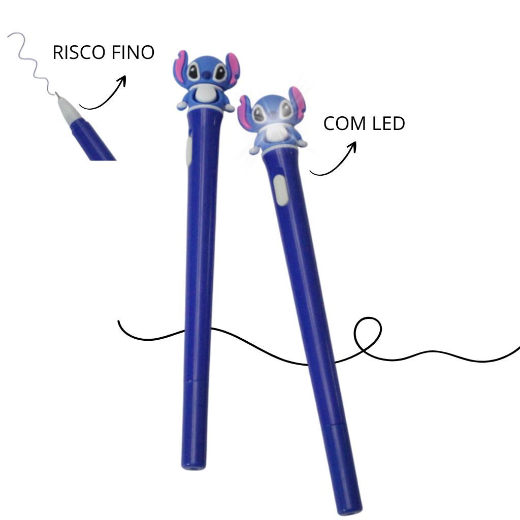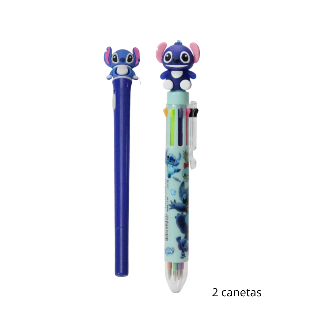 Caneta Escolar e Escritório 8 Cores com Led, Apontador e Marca Texto, e Adesivos do Stitch, Kit 6 Itens