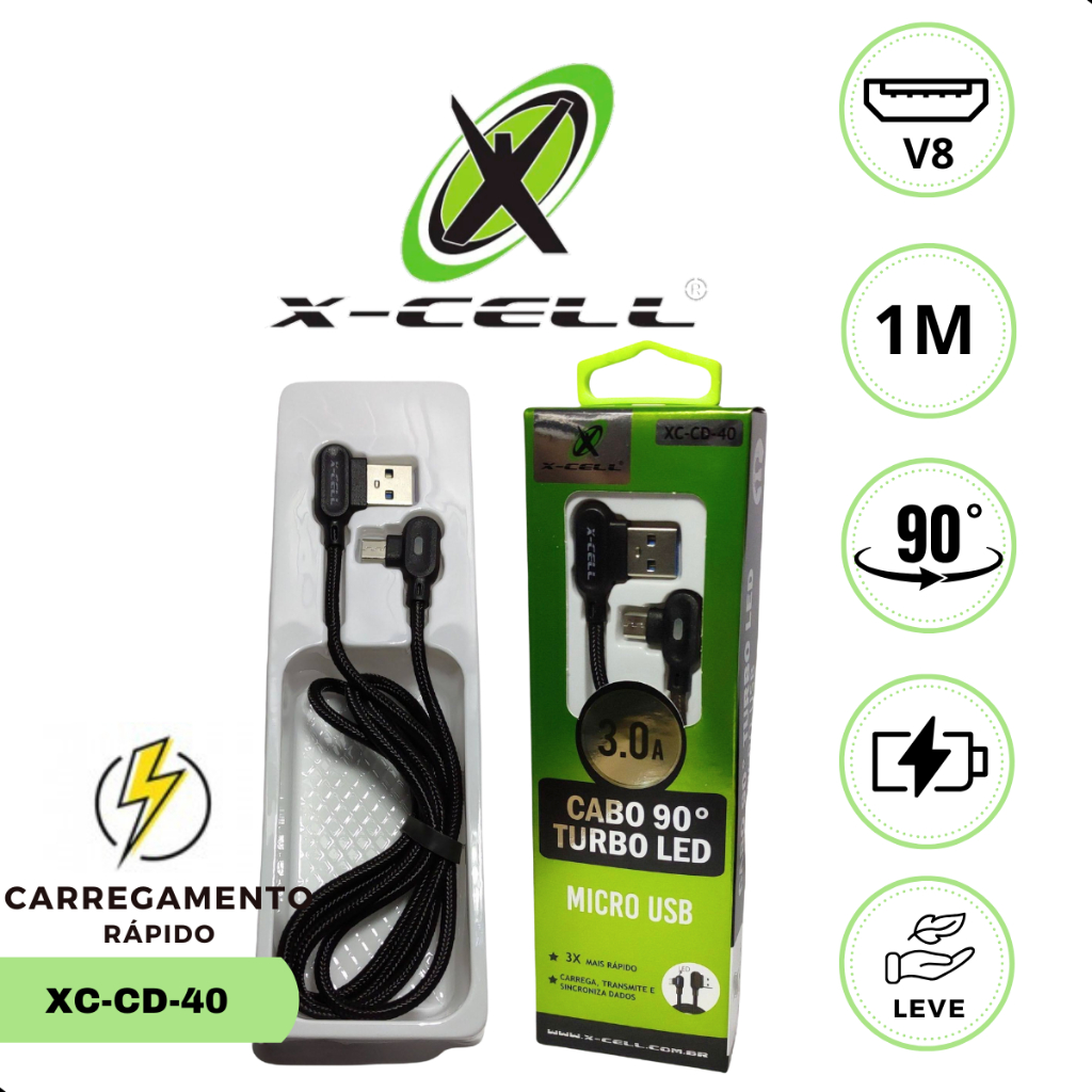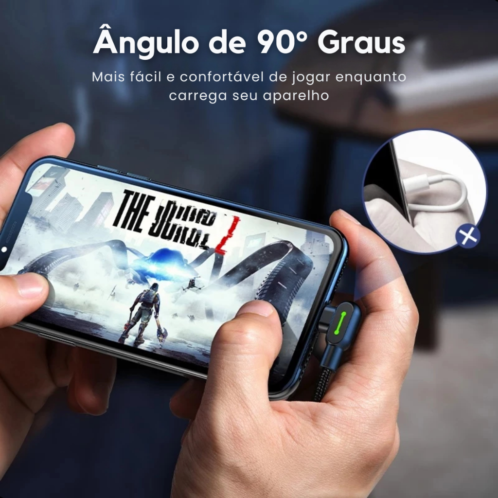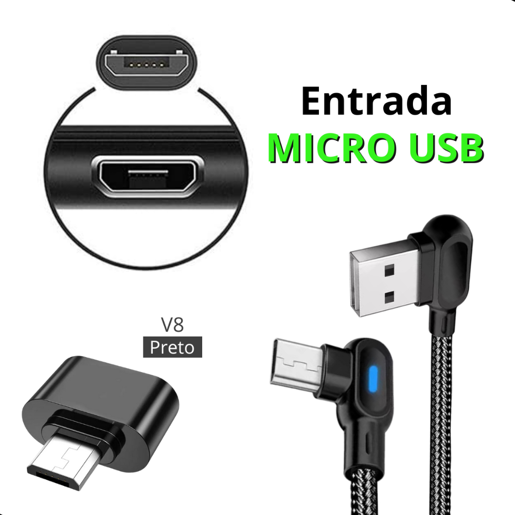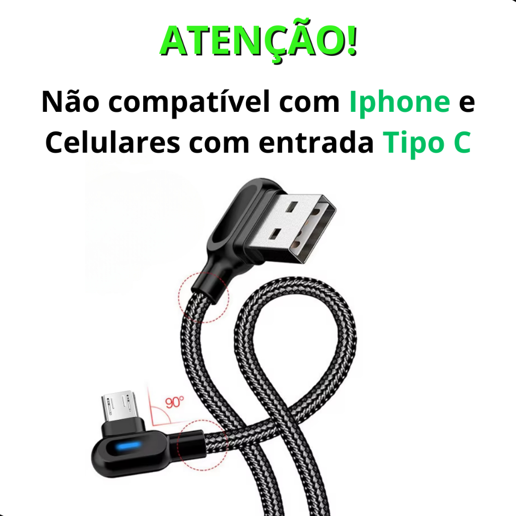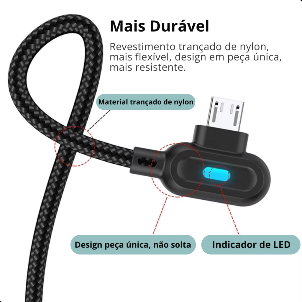 Cabo Usb V8 Carregador Turbo E Dados Led Em L90 Graus 3.0a