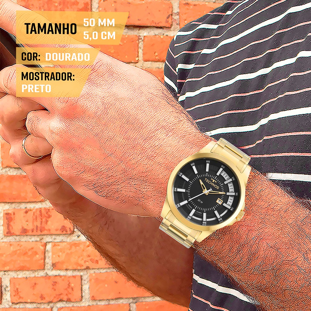 Relógio Technos Masculino Dourado Preto Original 1 Ano de Garantia