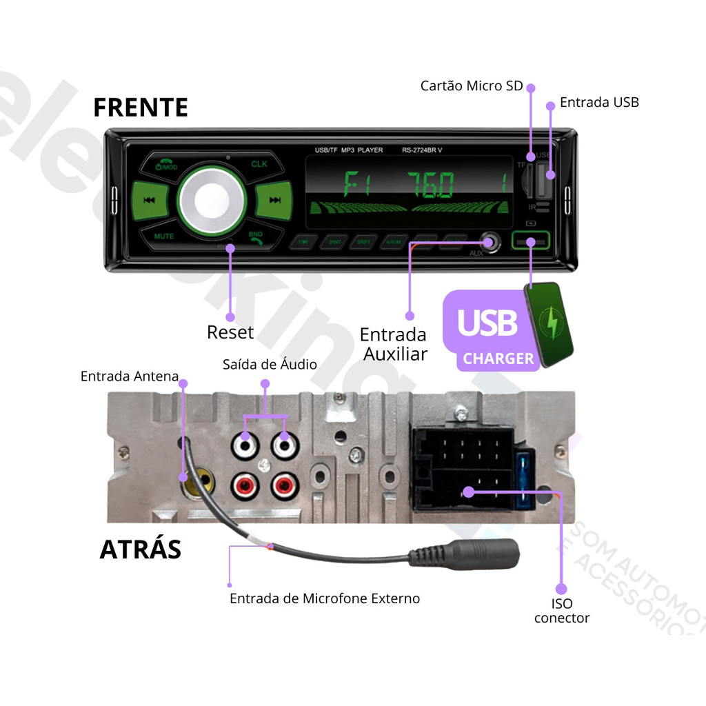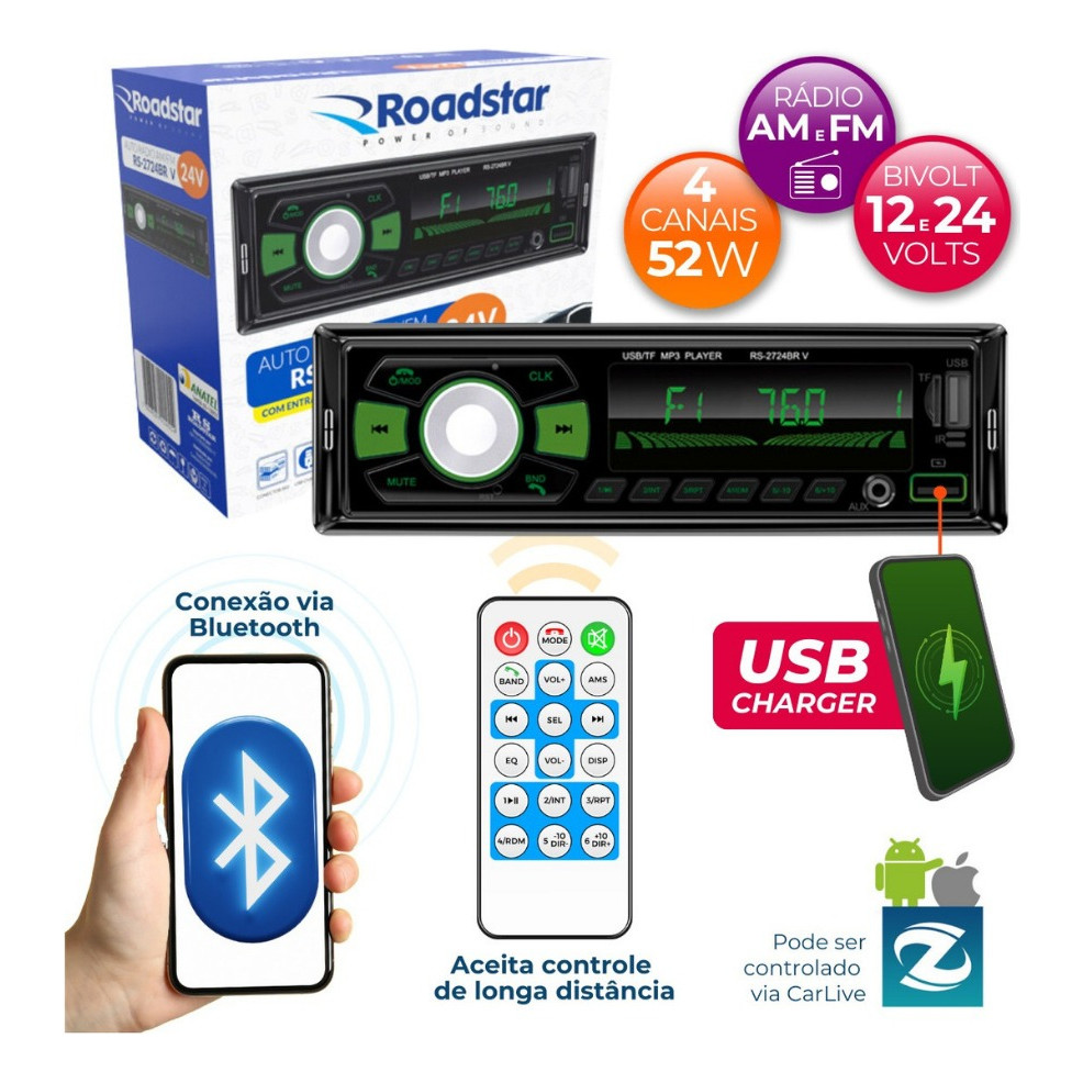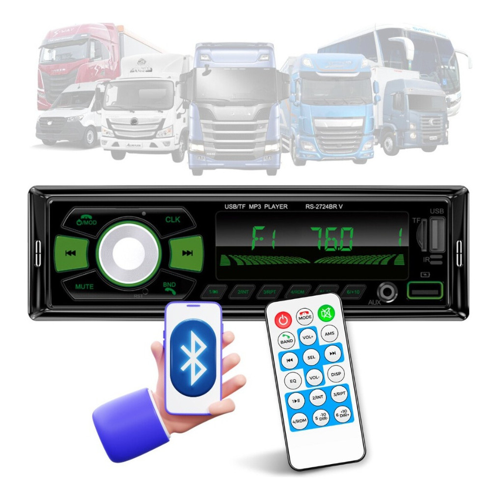 Rádio MP3 Player Roadstar RS2724BR 24V BT/2 USB/SD/AM/FM/Auxiliar C/Controle - 4 x 52w