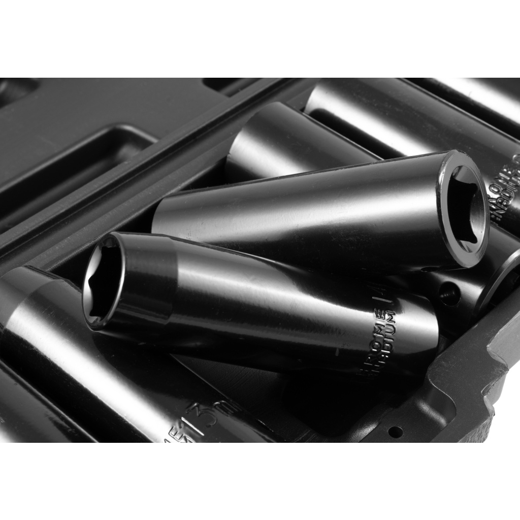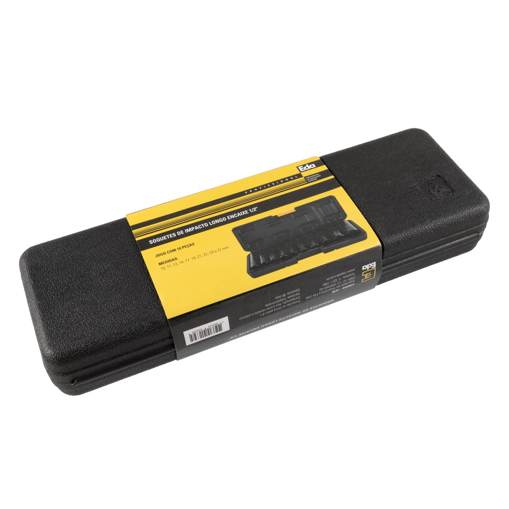 Jogo de Soquete Impacto Longo encaixe 1/2'' 10 A 27mm Com 10 peças e maleta - Aço Cromo Vanádio CRV - Eda Profissional