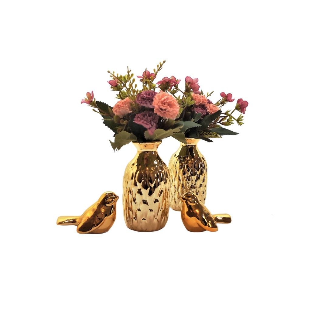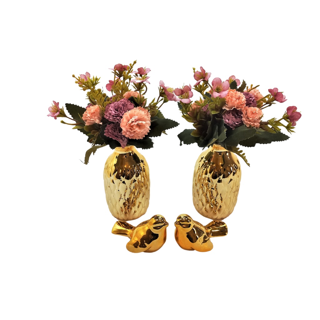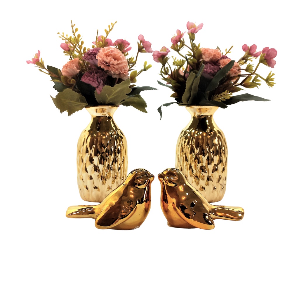 Kit Decoração 2 Vasos Dourados + 2 Pássaros + Flores Artif.