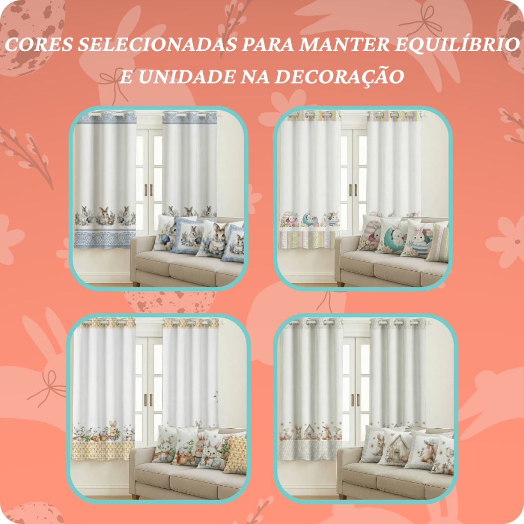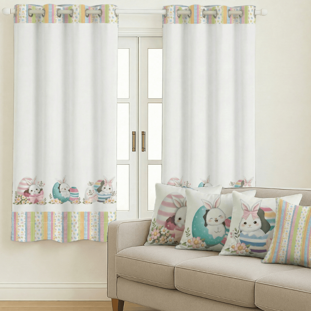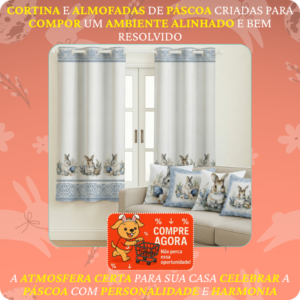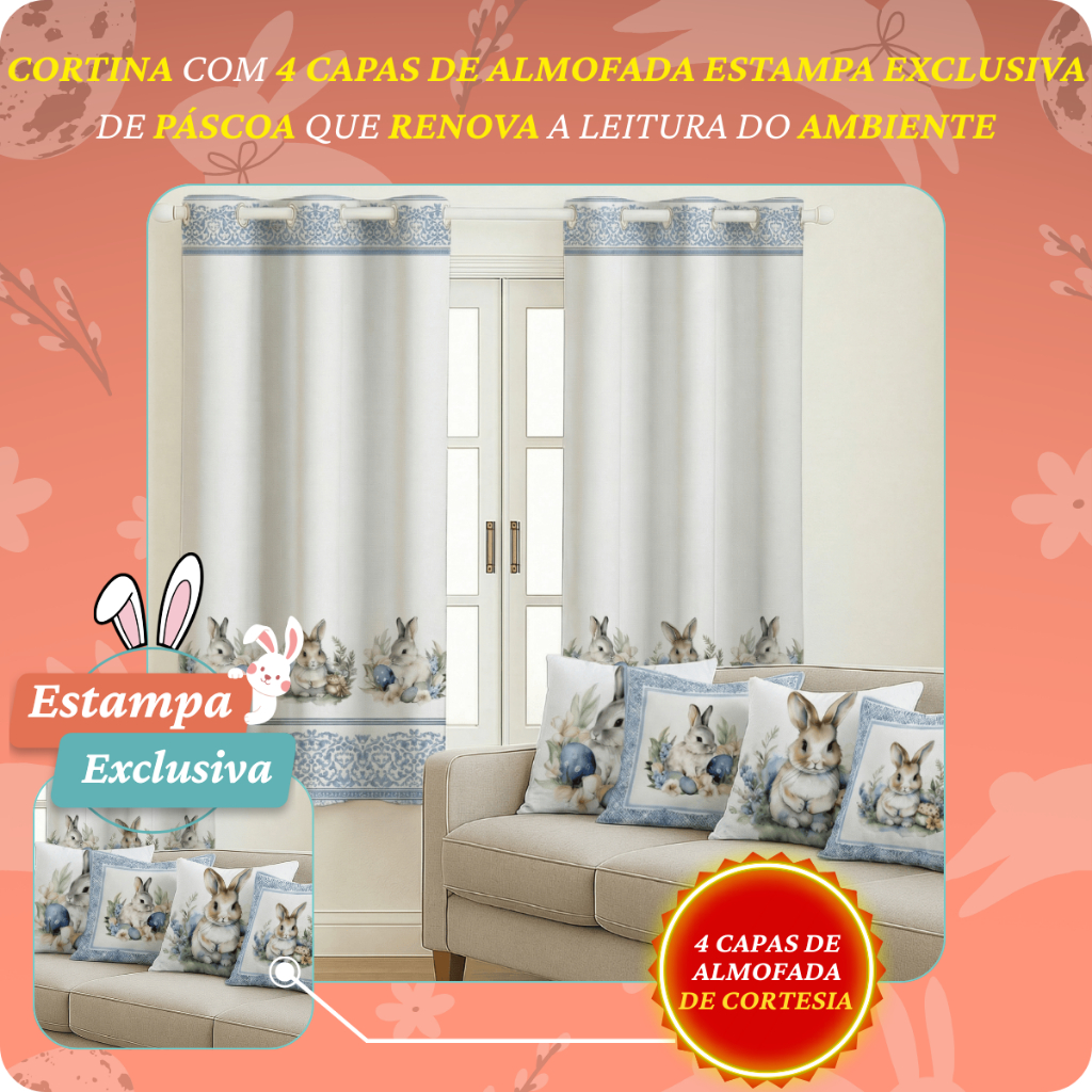 Kit Cortina Pascoa 2,00x1,50 + 4 Capas de Almofada Estampadas Temas De Pascoa