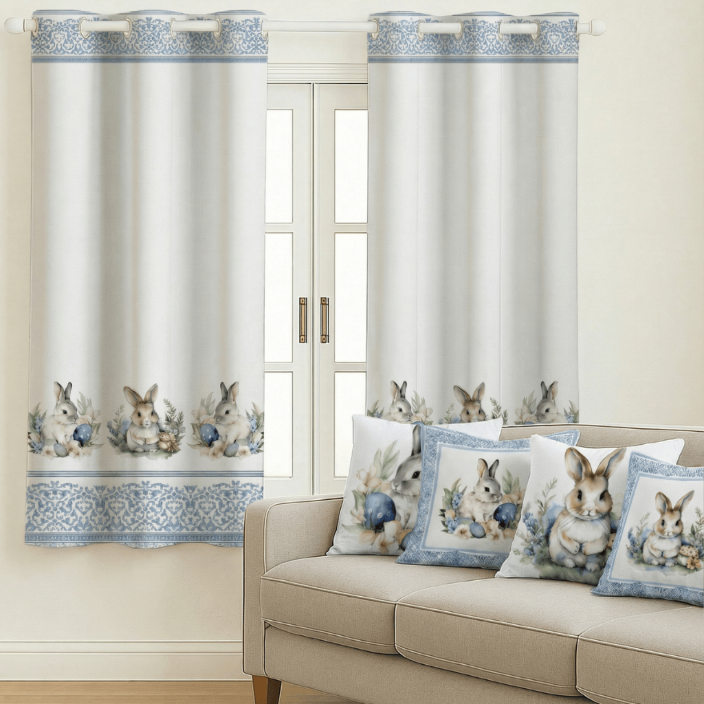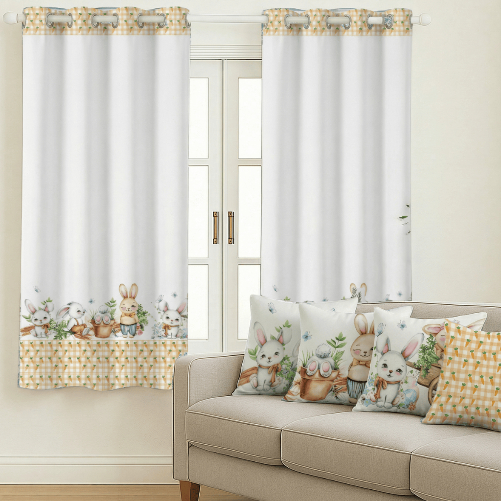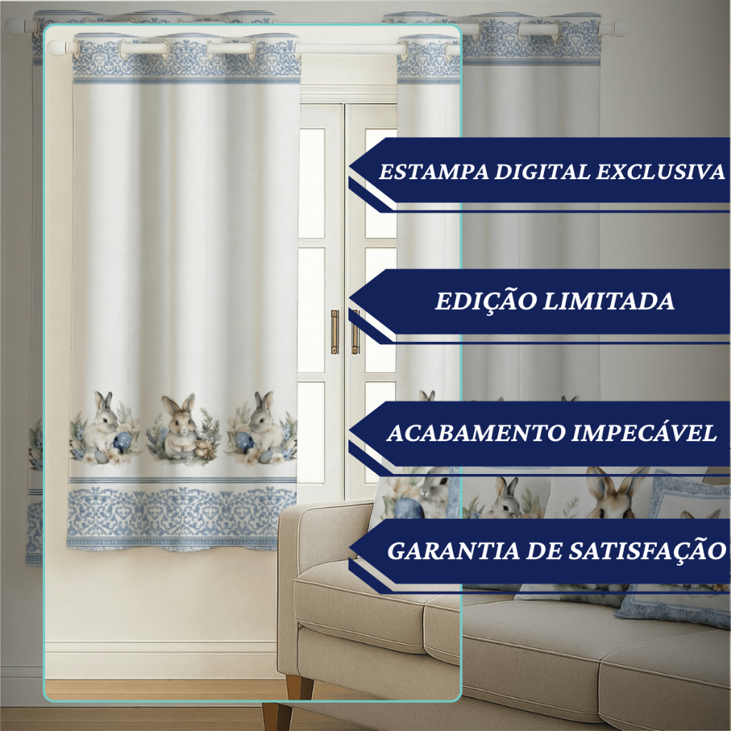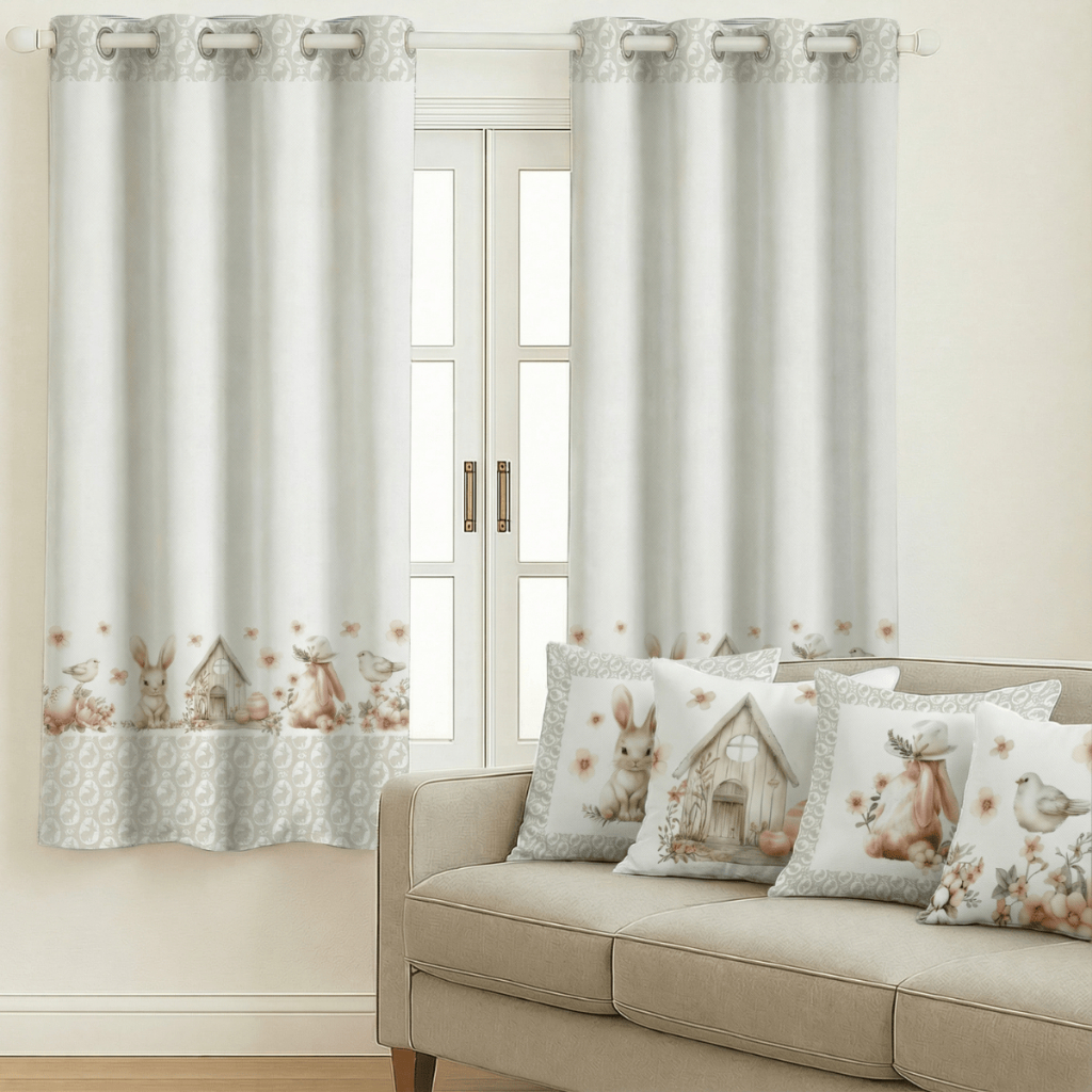 Kit Cortina Pascoa 2,00x1,50 + 4 Capas de Almofada Estampadas Temas De Pascoa