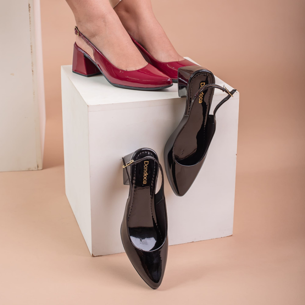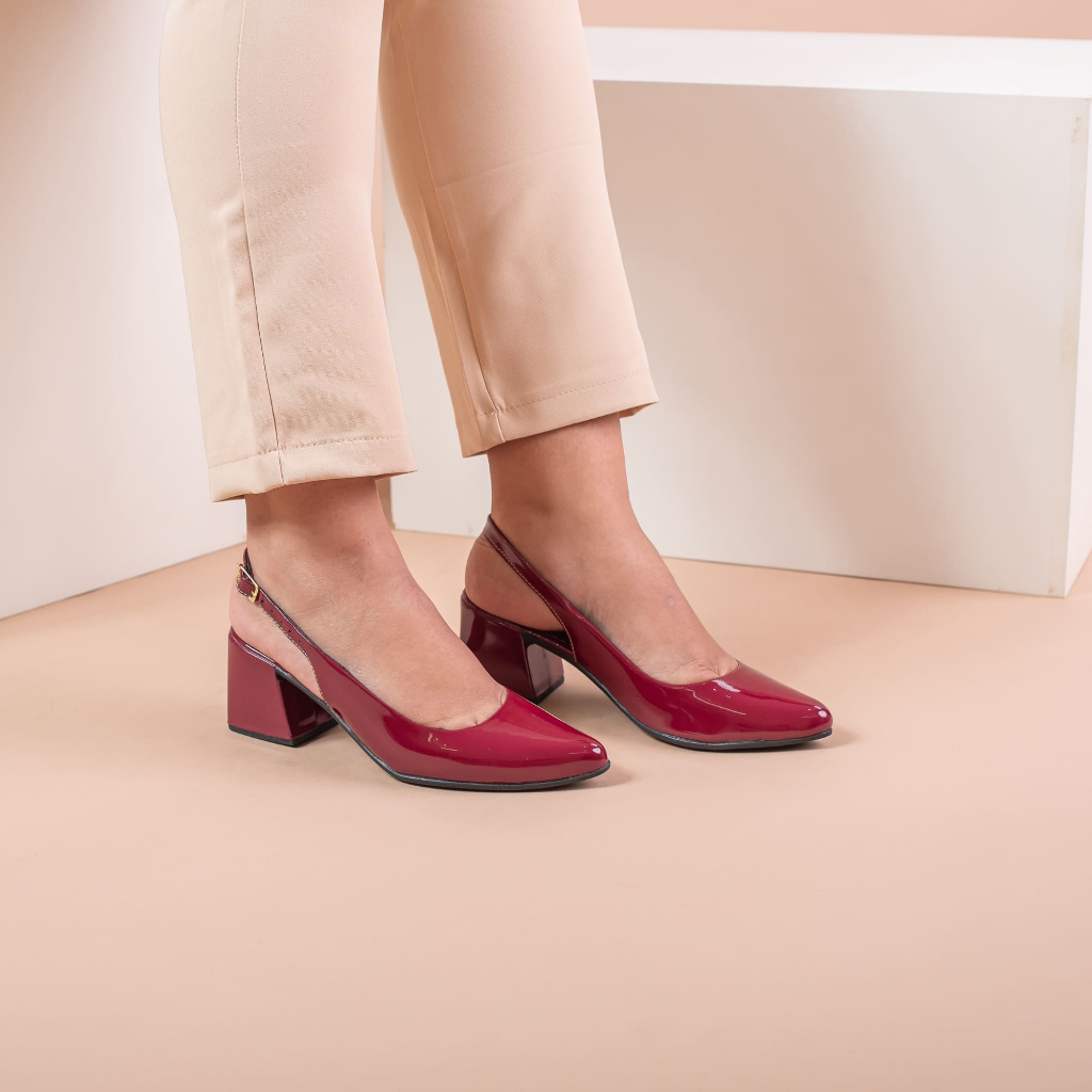 Sapato Scarpin feminino Slingback Moda Boho Fivela Social Bico Fino Salto Grosso Confortavel