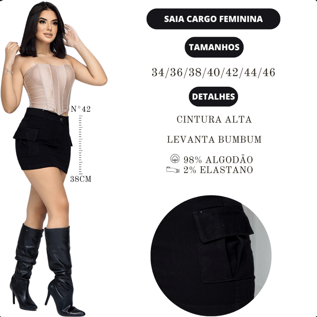 Saia Cargo Preta Feminina Cintura Alta Bolso Lateral