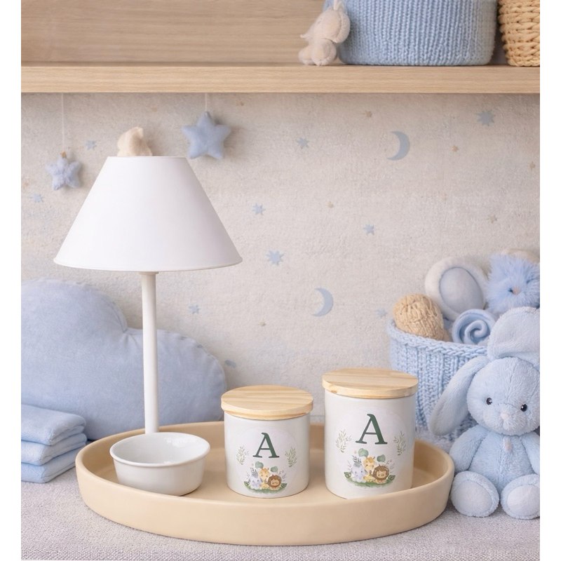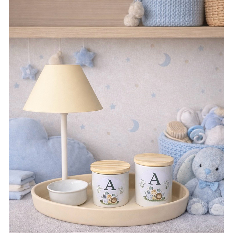 Kit Higiene Bebê com Abajur 5 Peças – Bandeja + Potes de Porcelana com Tampa de Madeira+ Abajur clean