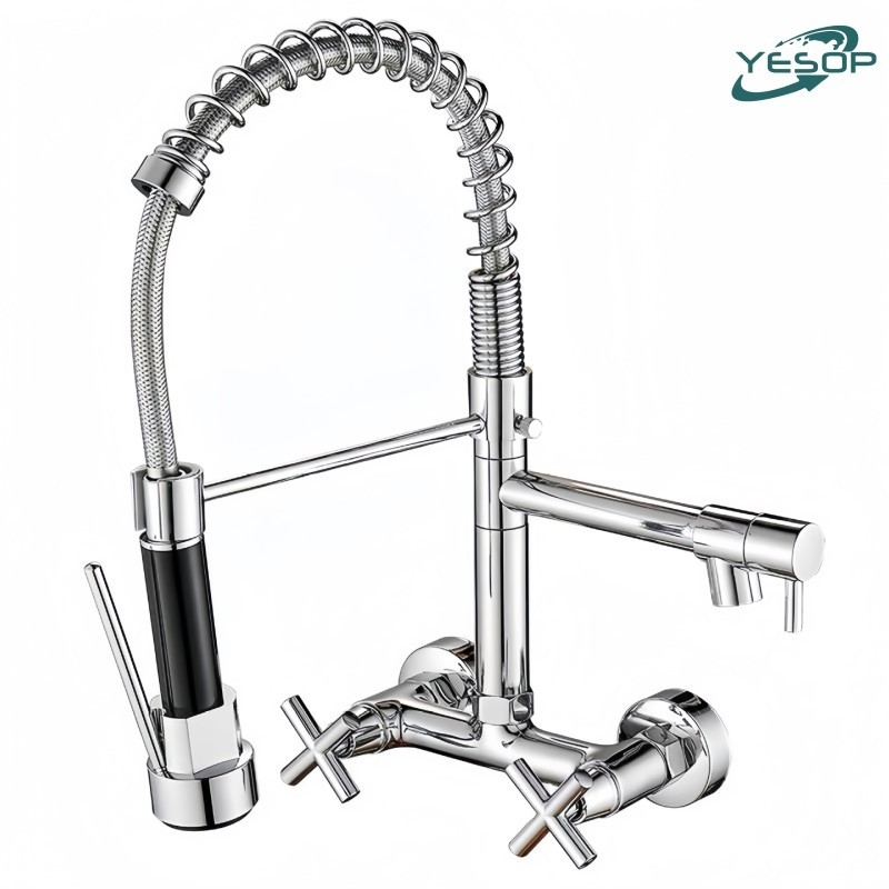 Torneira Cozinha Gourmet De Parede Com Bica Flexível Cor Prata Escovado Yesop