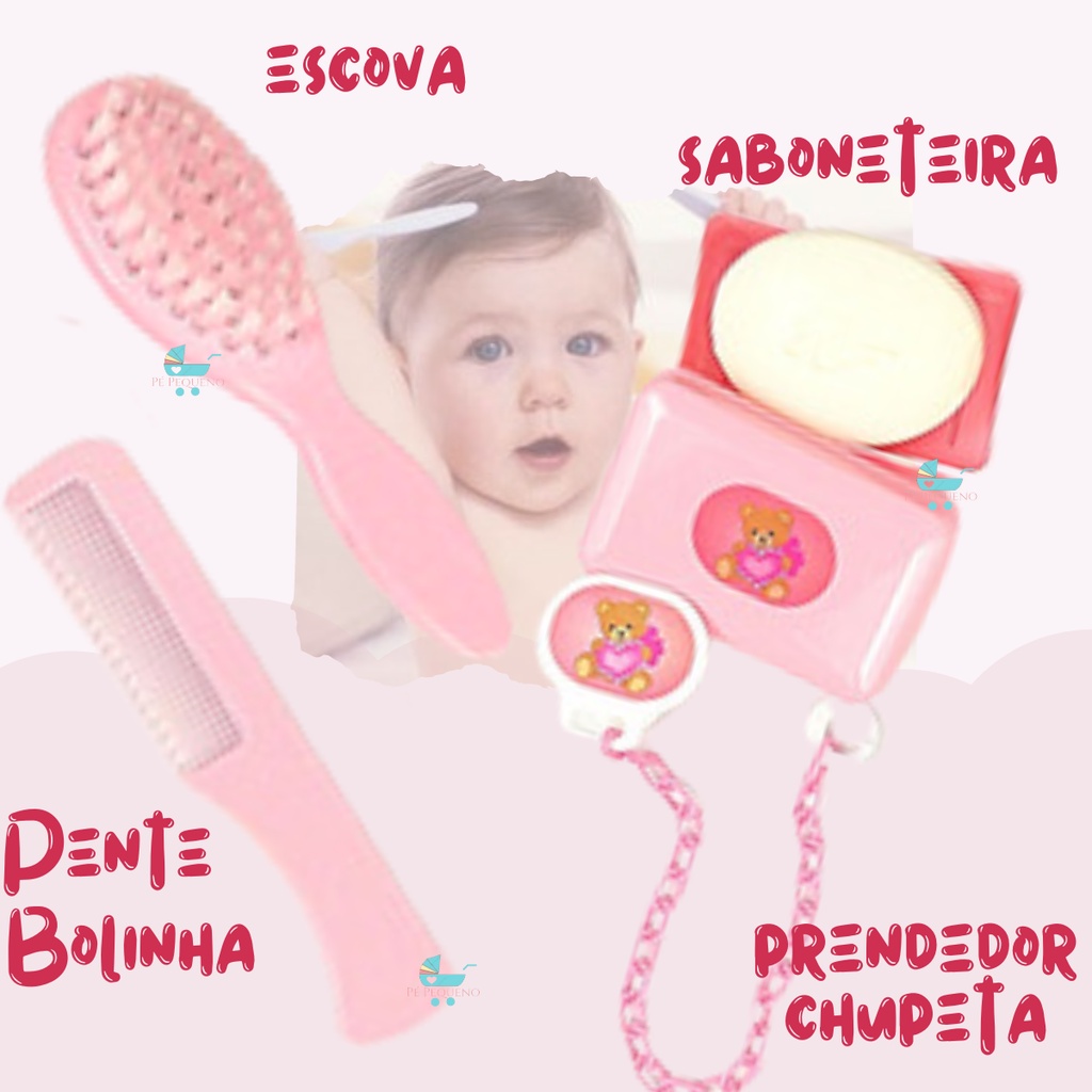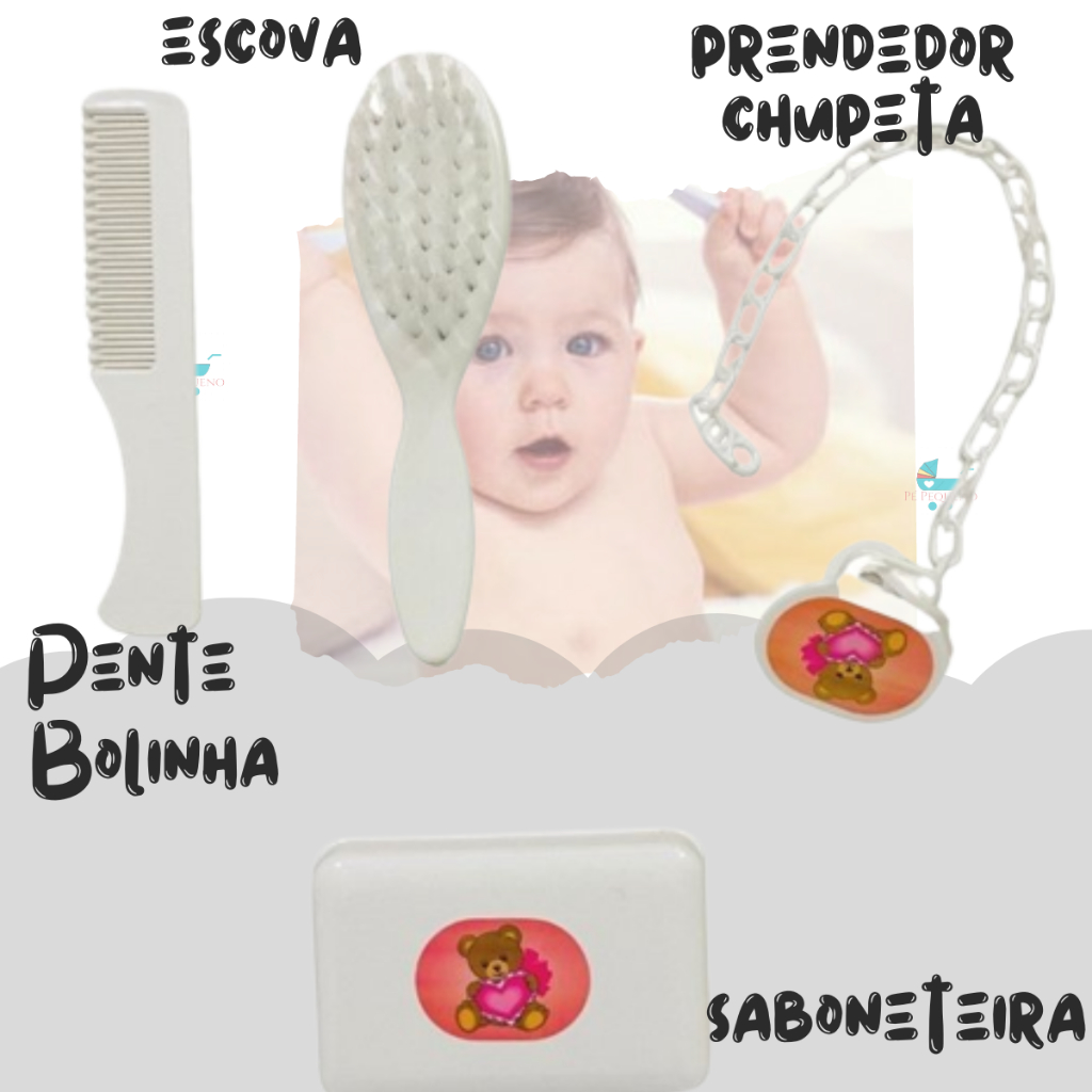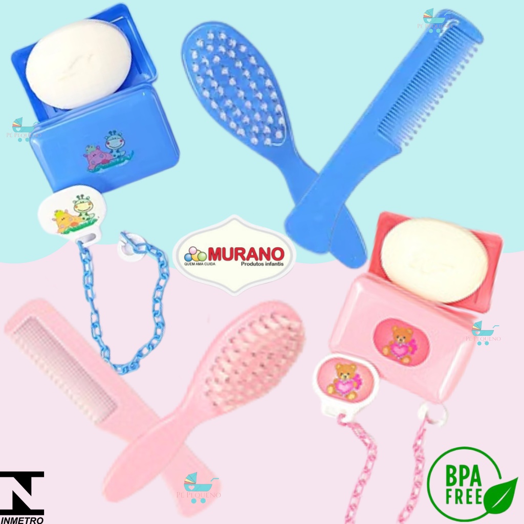kit Higiene bebe 4 itens Pente,Escova de cabelo,Saboneteira,Prendedor chupeta MURANO-Envio imediato