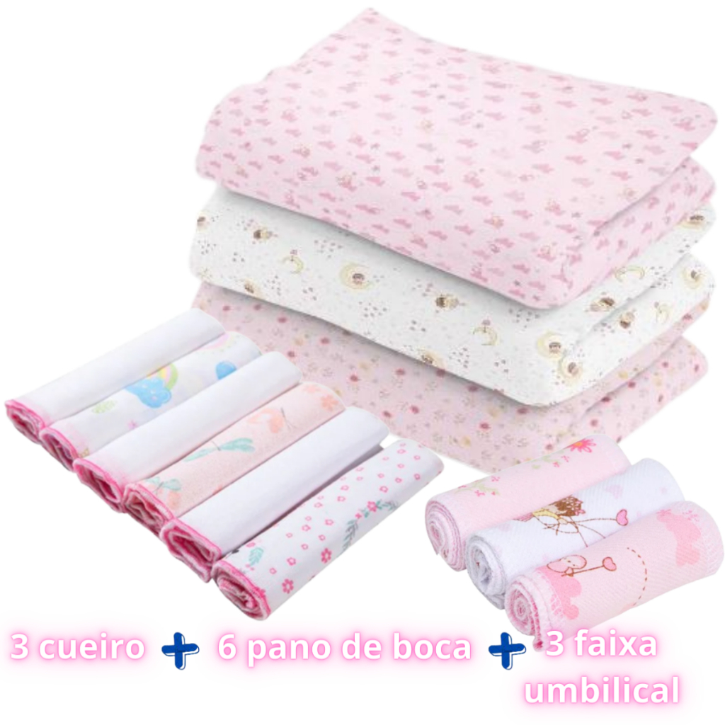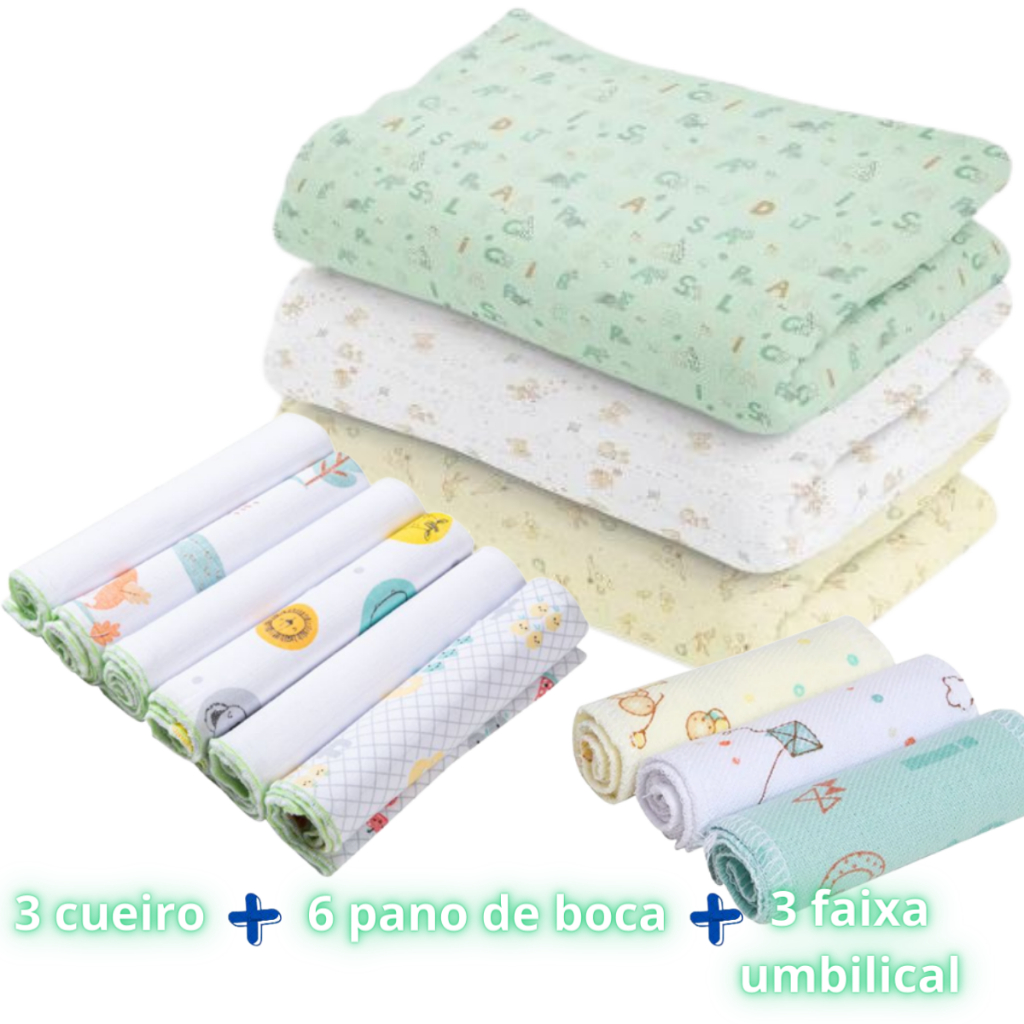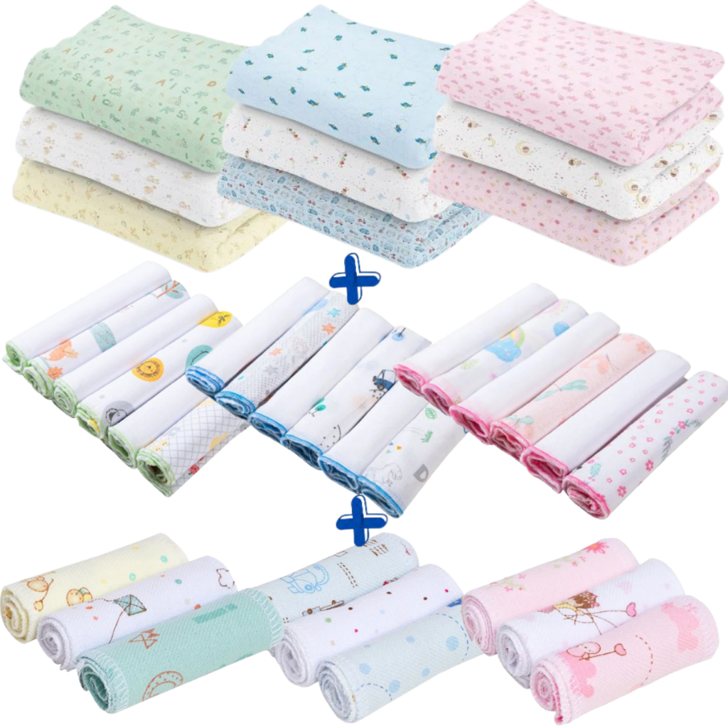 Kit 12 Peças Enxoval bebe – 3 Cueiros Flanelados Estampados + 6 Pano de Boca + 3 Faixa Umbilical.