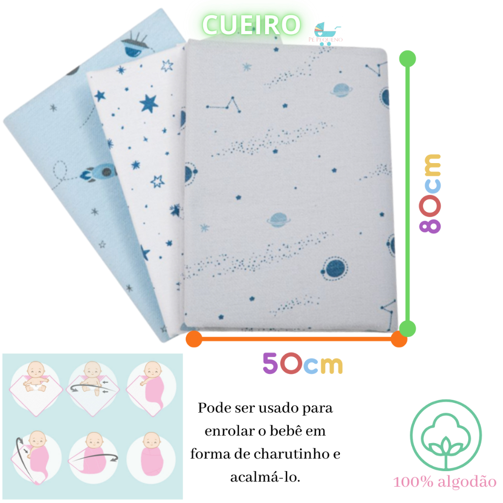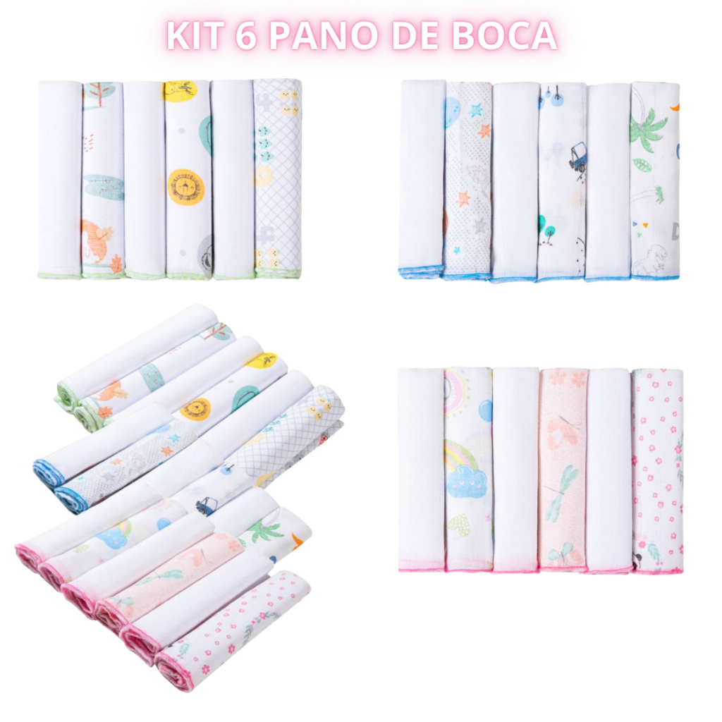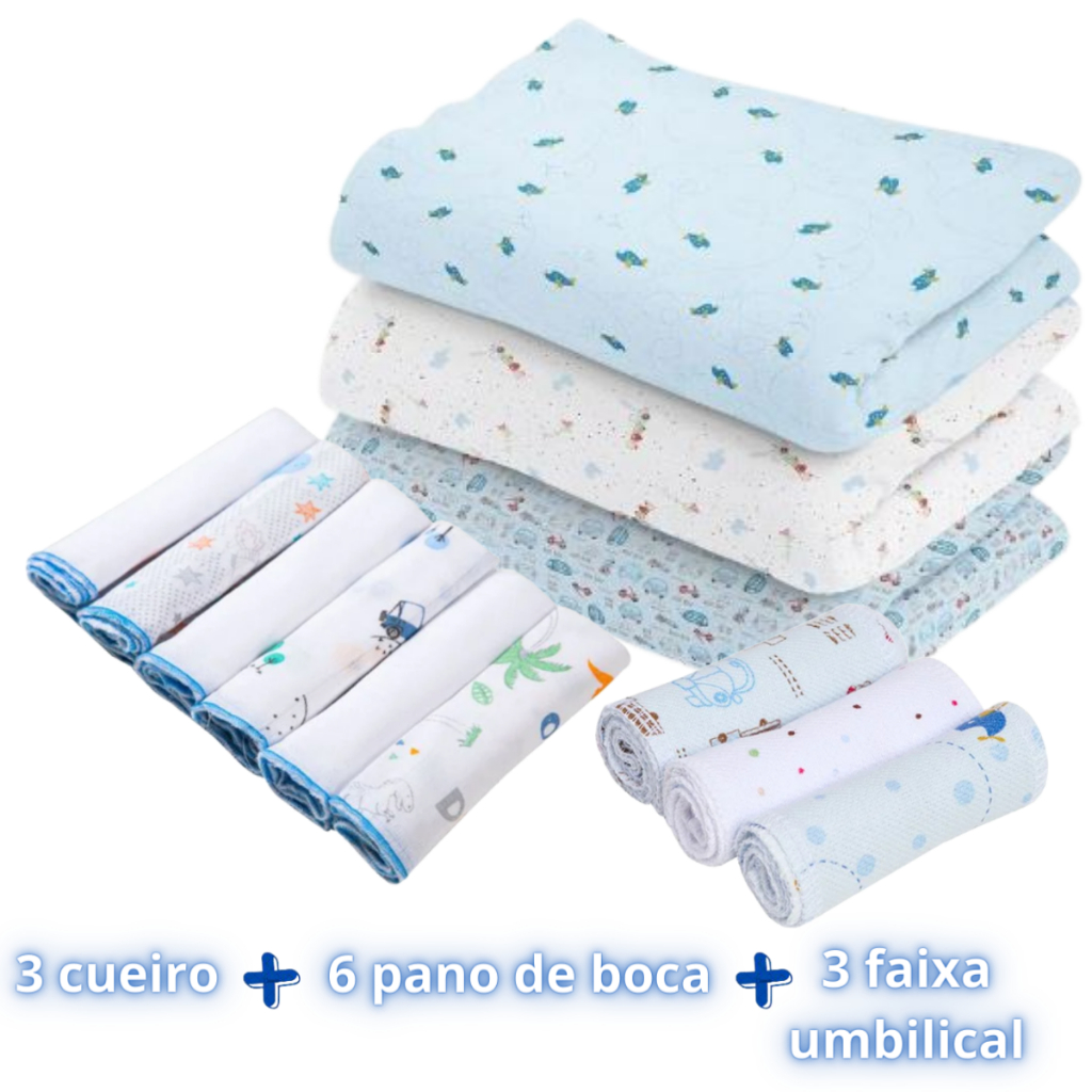 Kit 12 Peças Enxoval bebe – 3 Cueiros Flanelados Estampados + 6 Pano de Boca + 3 Faixa Umbilical.