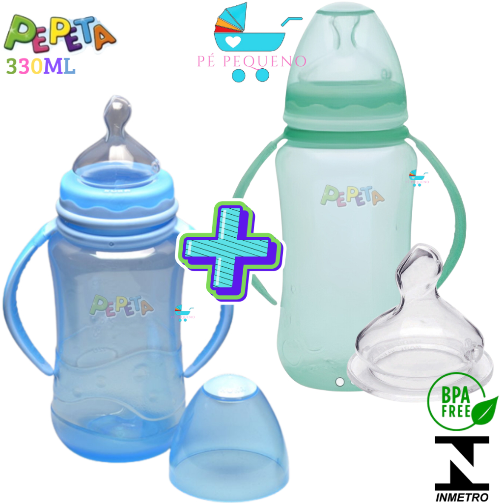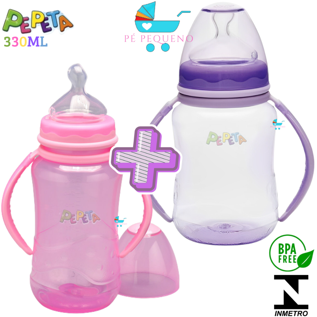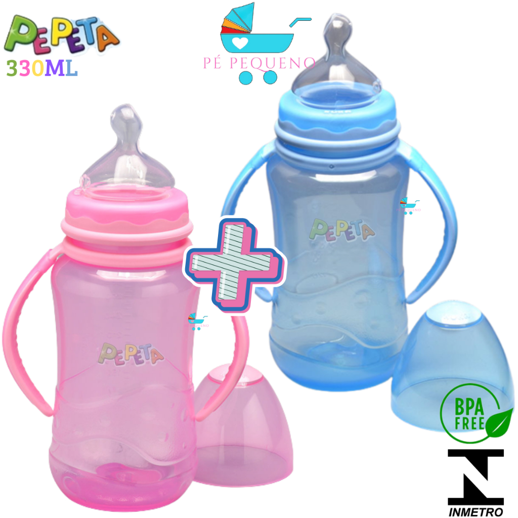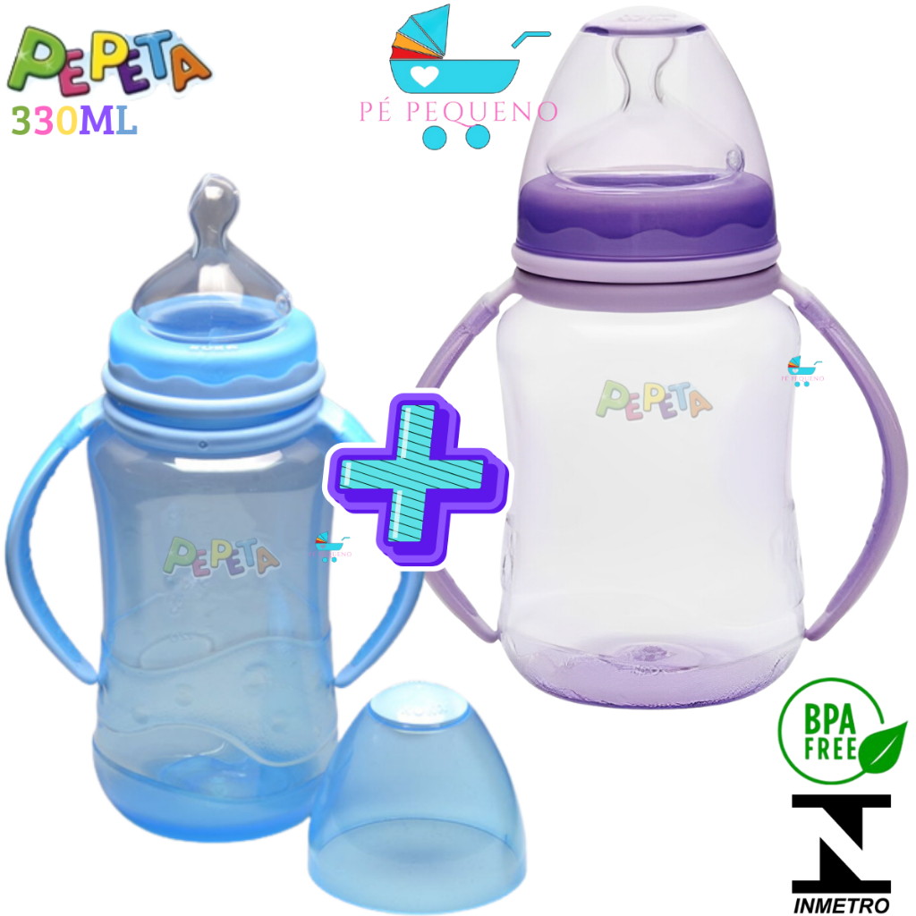 Kit 2 mamadeira 330ml bico de silicone transição infantil com alça.