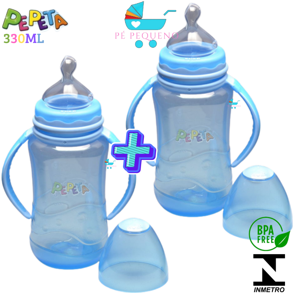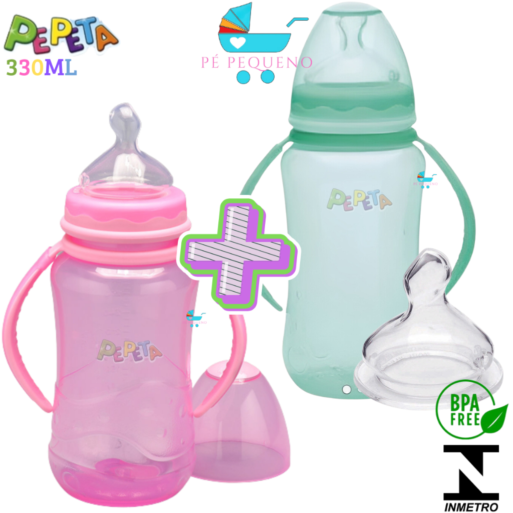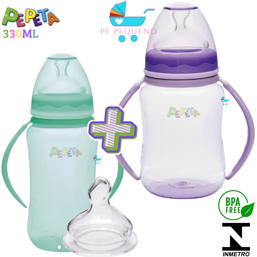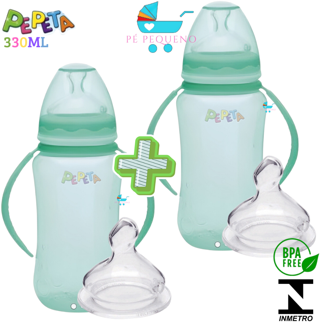 Kit 2 mamadeira 330ml bico de silicone transição infantil com alça.