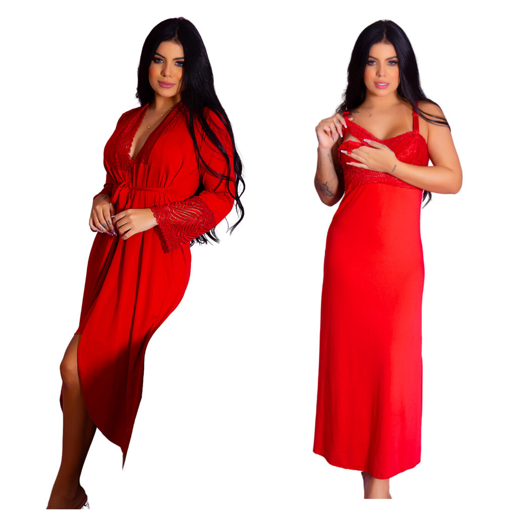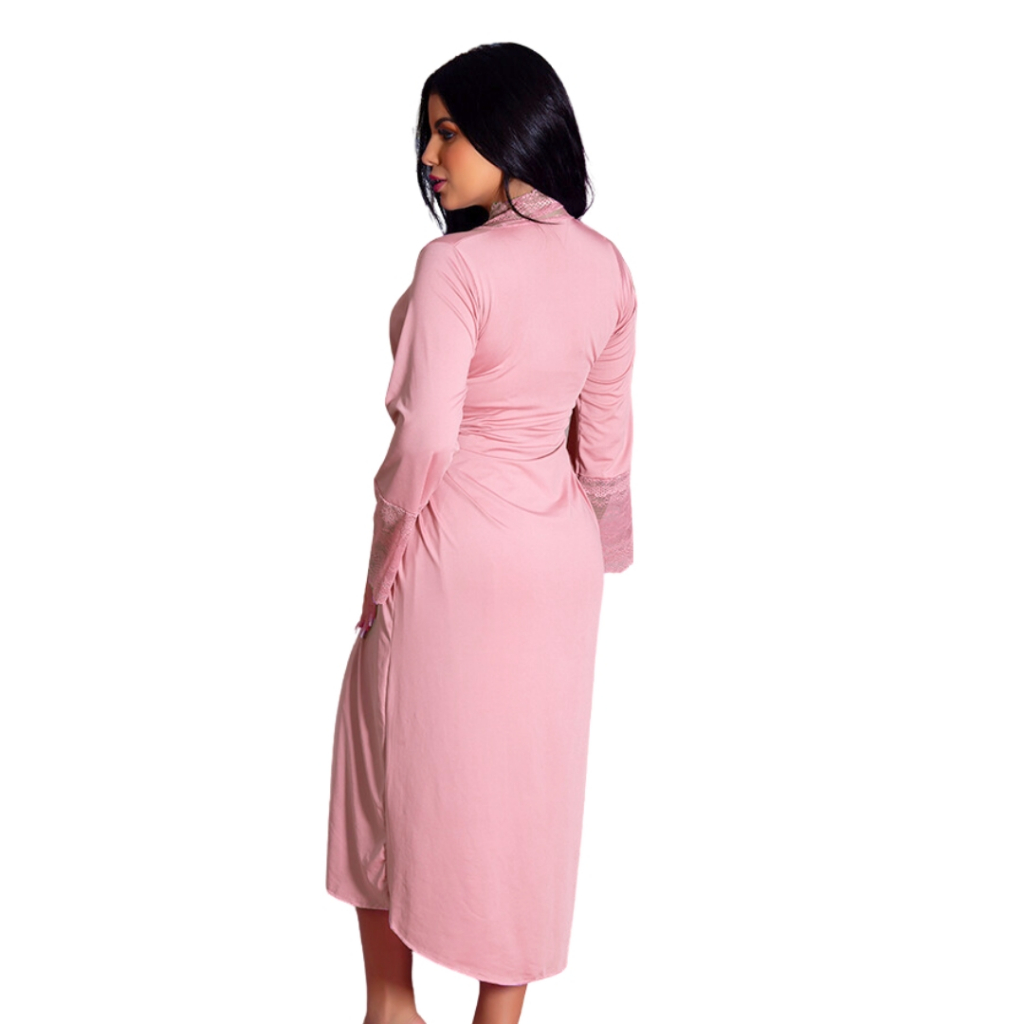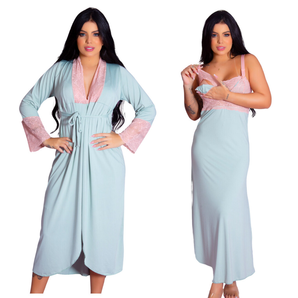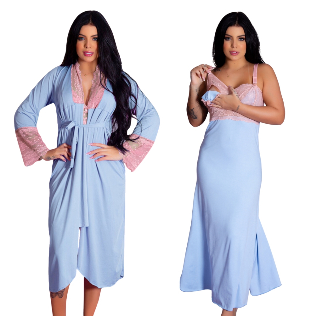 Kit Robe Roupão e Camisola Amamentação Longos Maternidade Gestante Recorte Lateral