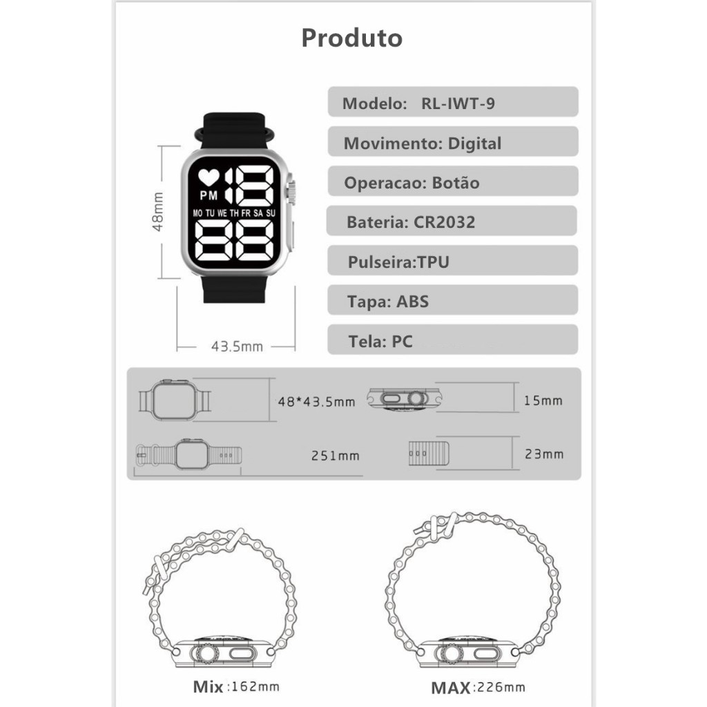 Relógio À Prova D'água LED Digital de Pulso Esportivo feminino Masculino Ultra9 Esporte Pulseira De Silicone