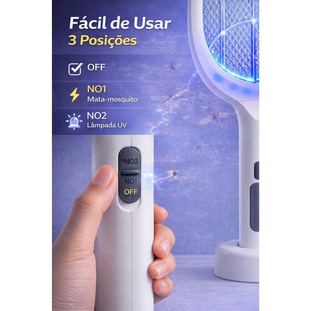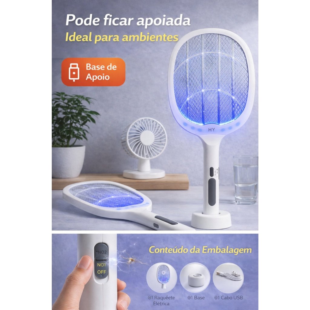 Raquete Elétrica Mata Mosquito Recarregável USB Luz UV Alta Voltagem com Base