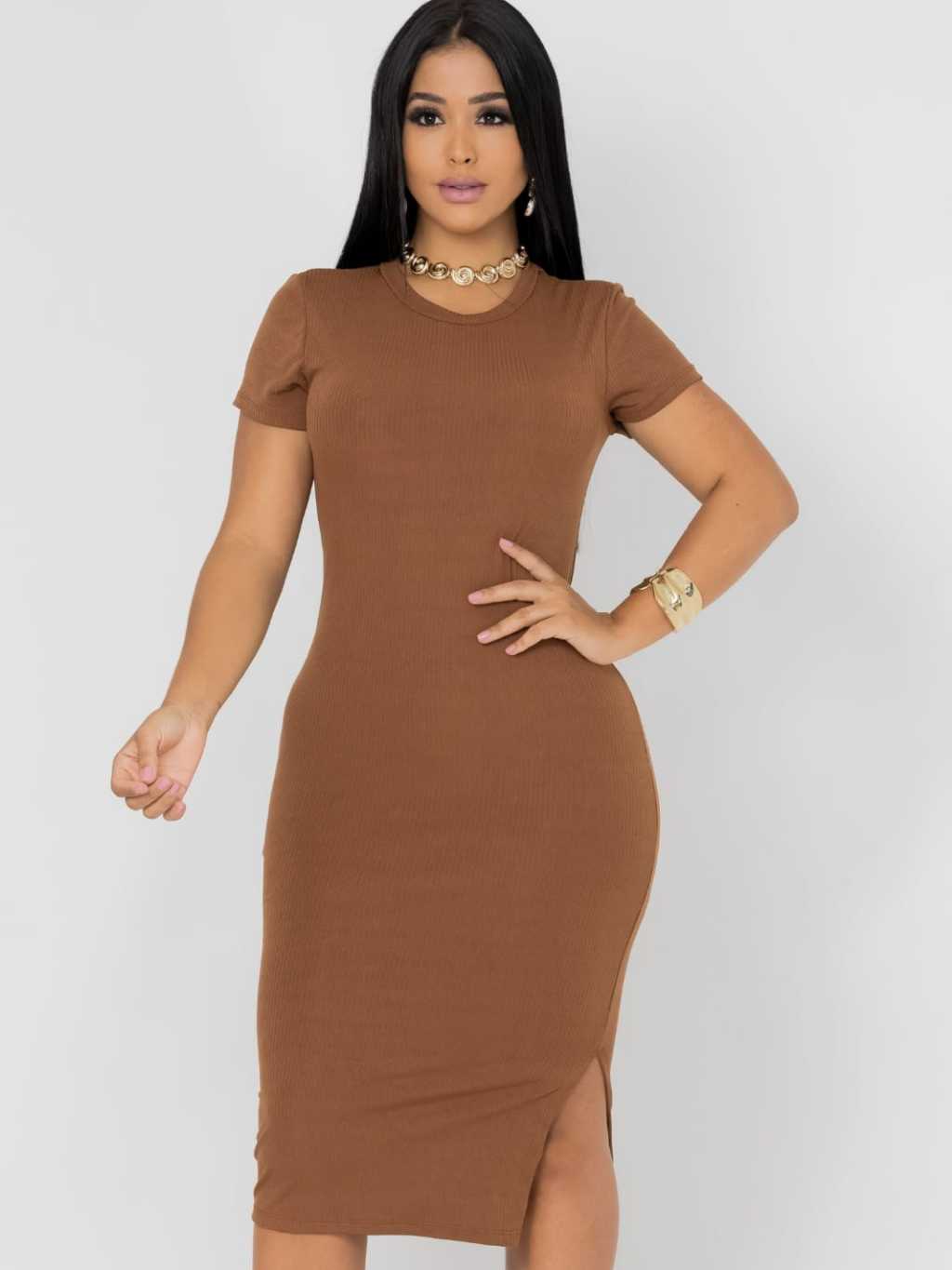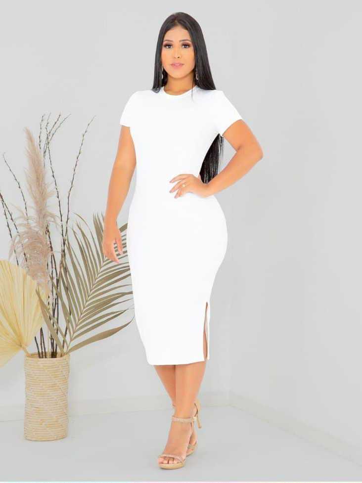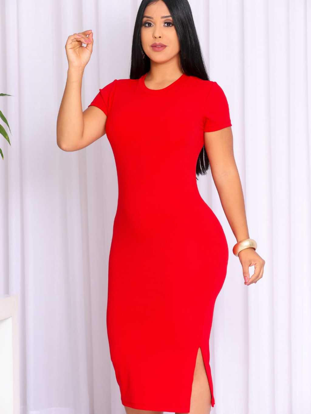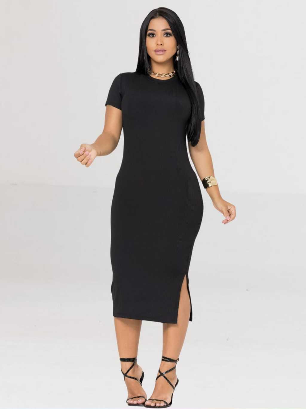 vestido feminino midi canelada com fenda lateral de manga curta coladinho