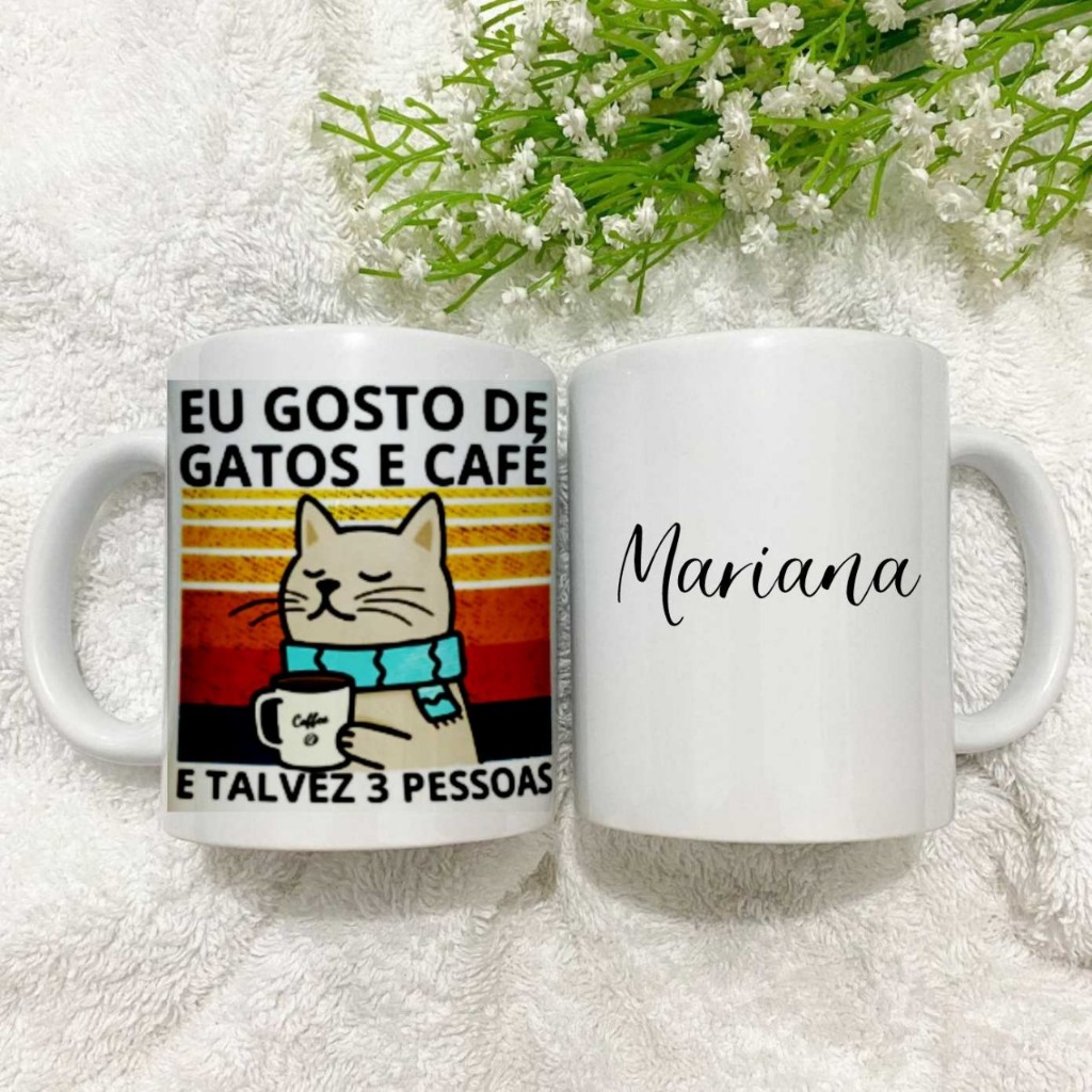 Caneca eu gosto de gatos e café, talvez 3 pessoas COM NOME