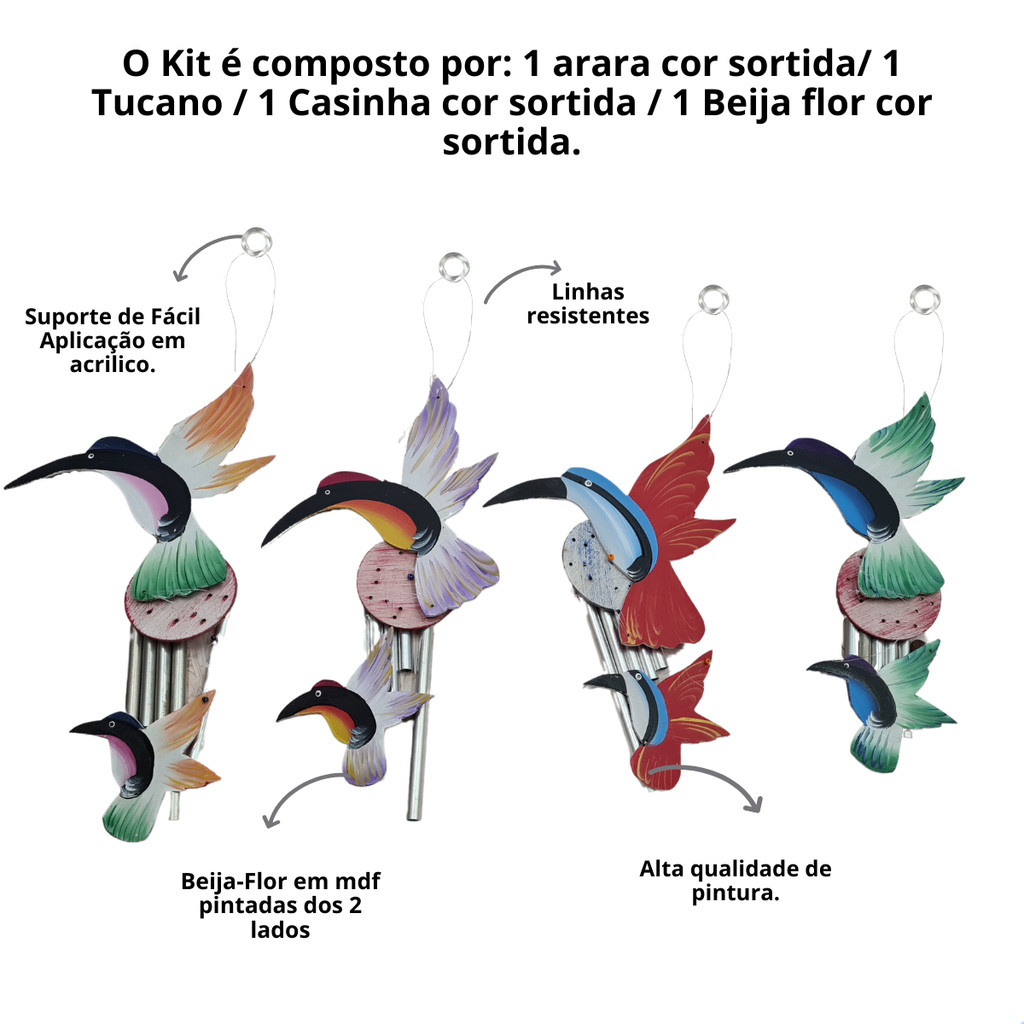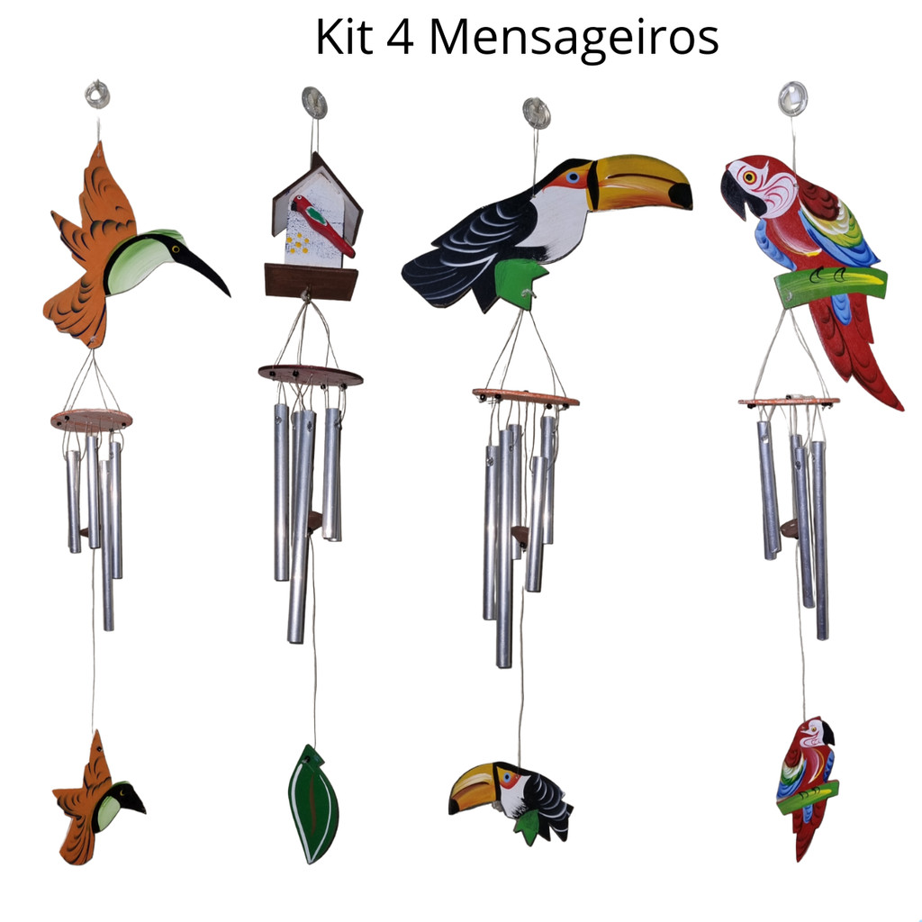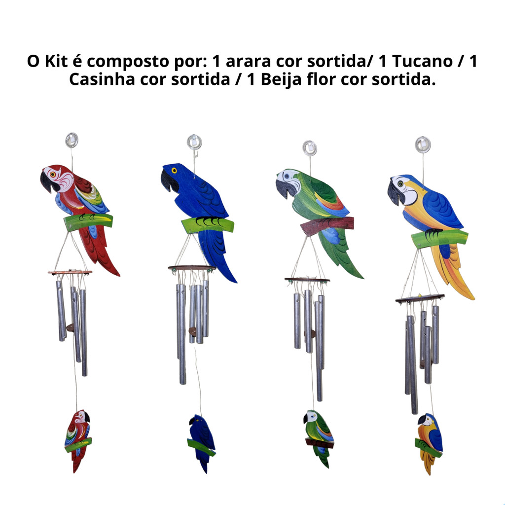 Kit 4 Sino dos Ventos Arara, Tucano, Beija-Flor, Passarinho
