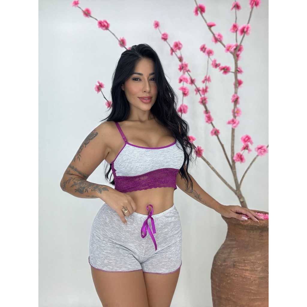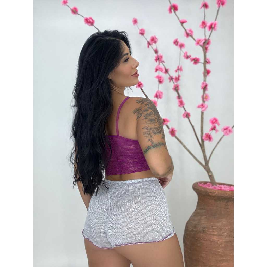 Baby Dool Pijama com renda Short Dool Blogueirinha Adulto feminino canelado toque macio