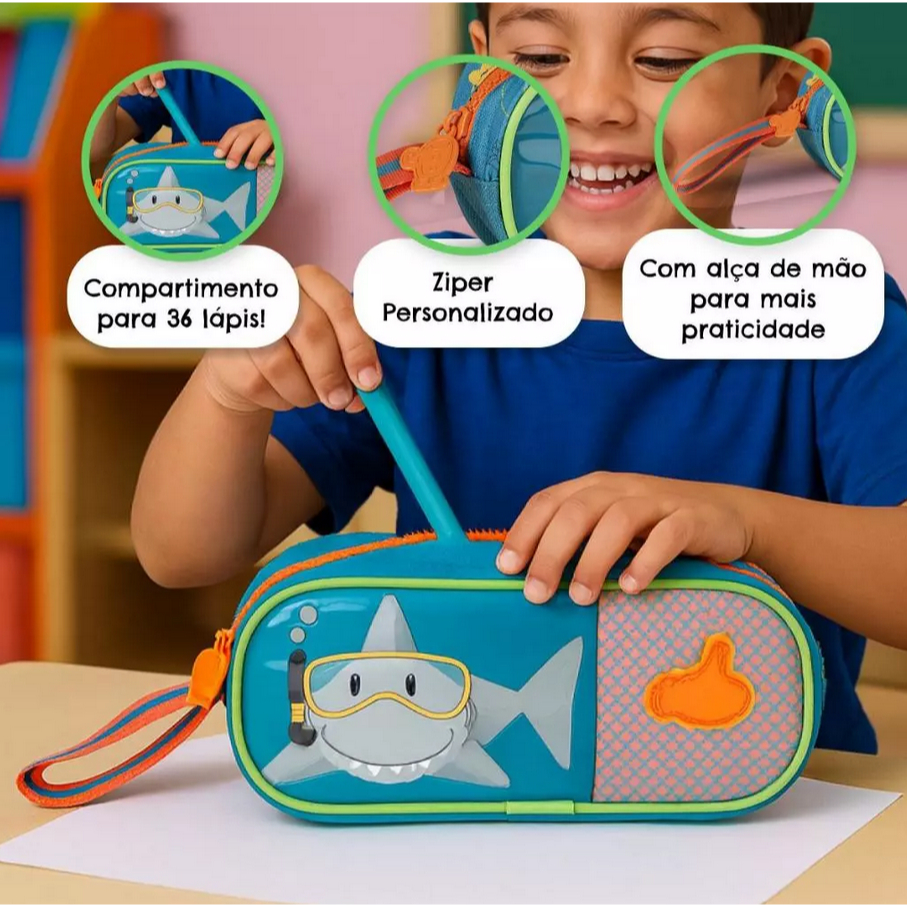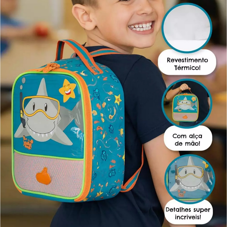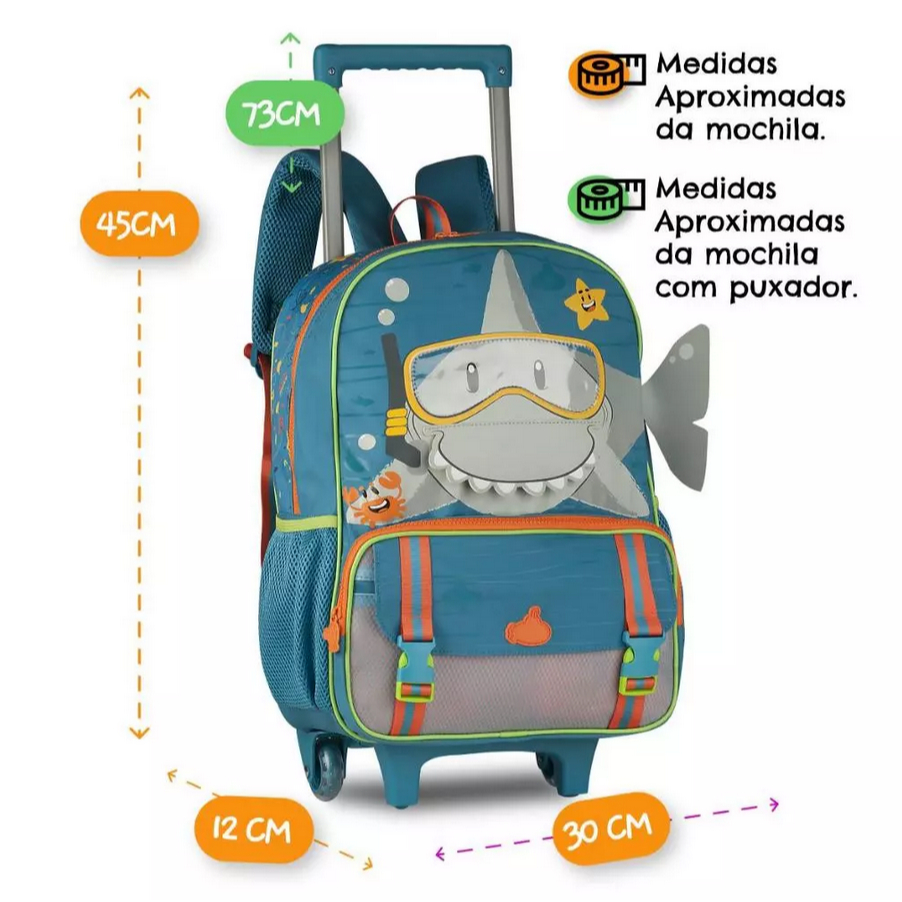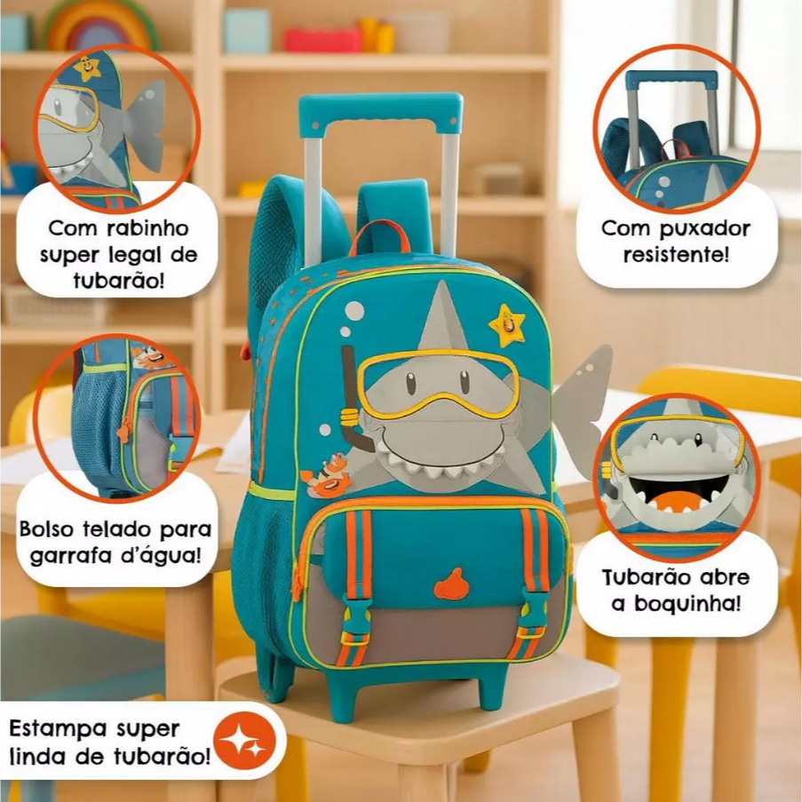 Kit Mochila de Rodinhas Tubarão Infantil Escolar Lancheira Estojo Menino Clio