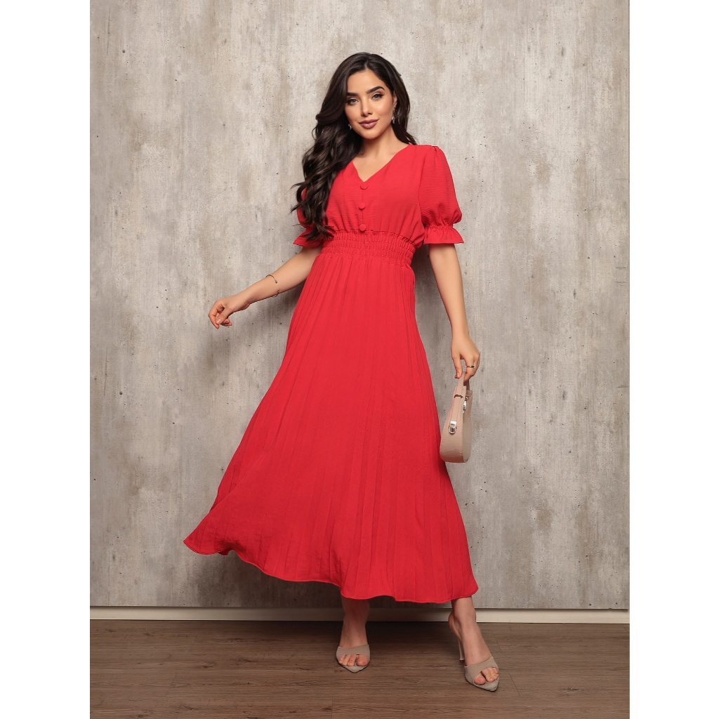 Vestido longo Plissada Gola V com botão manga princesa duna #16