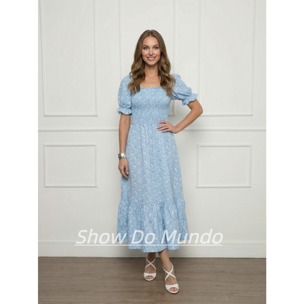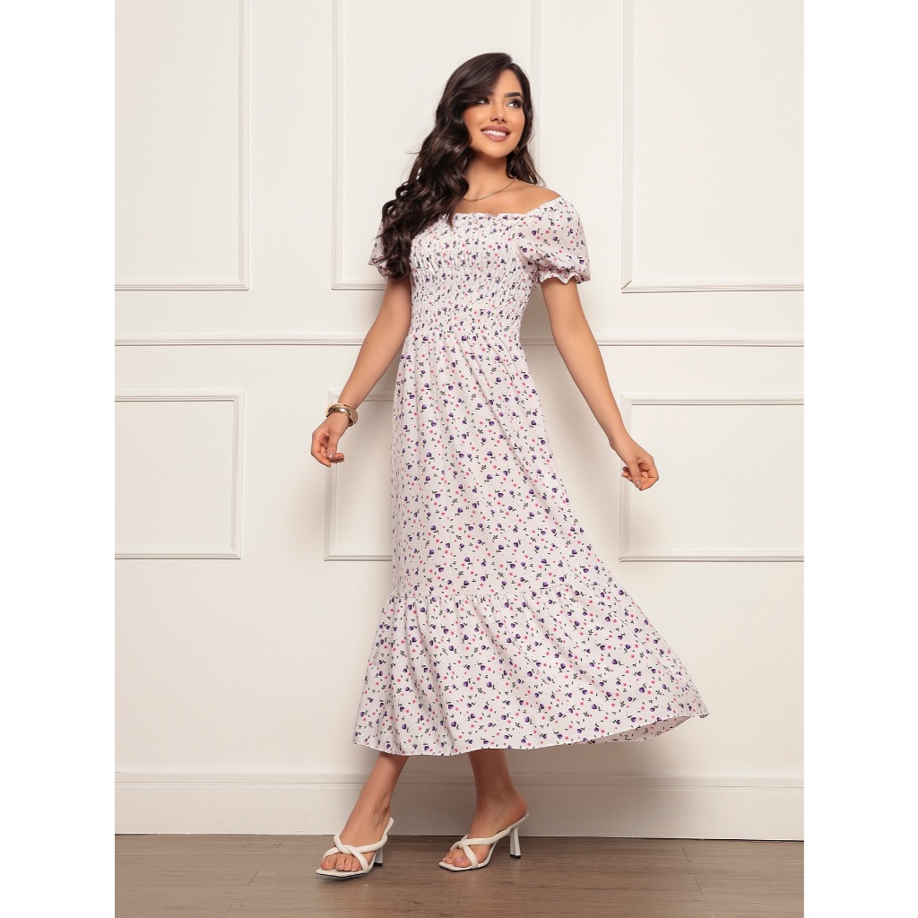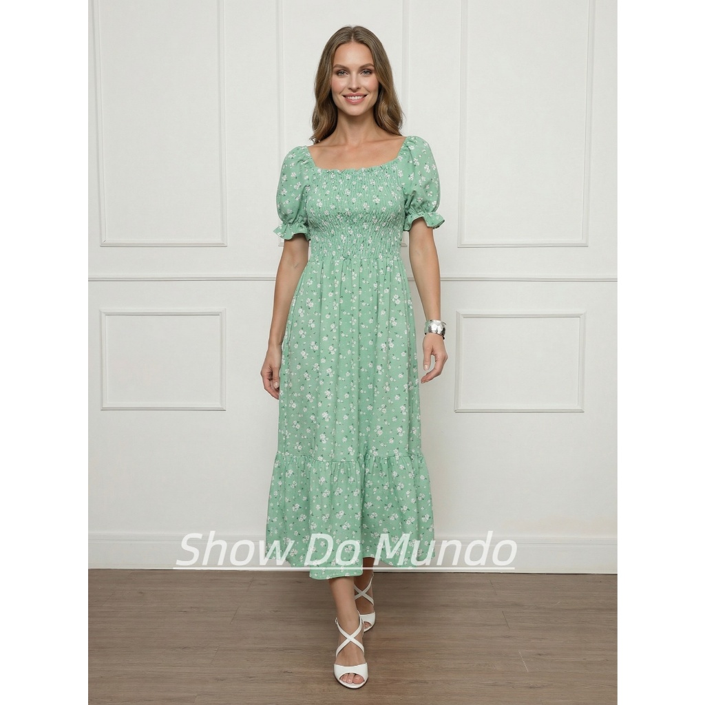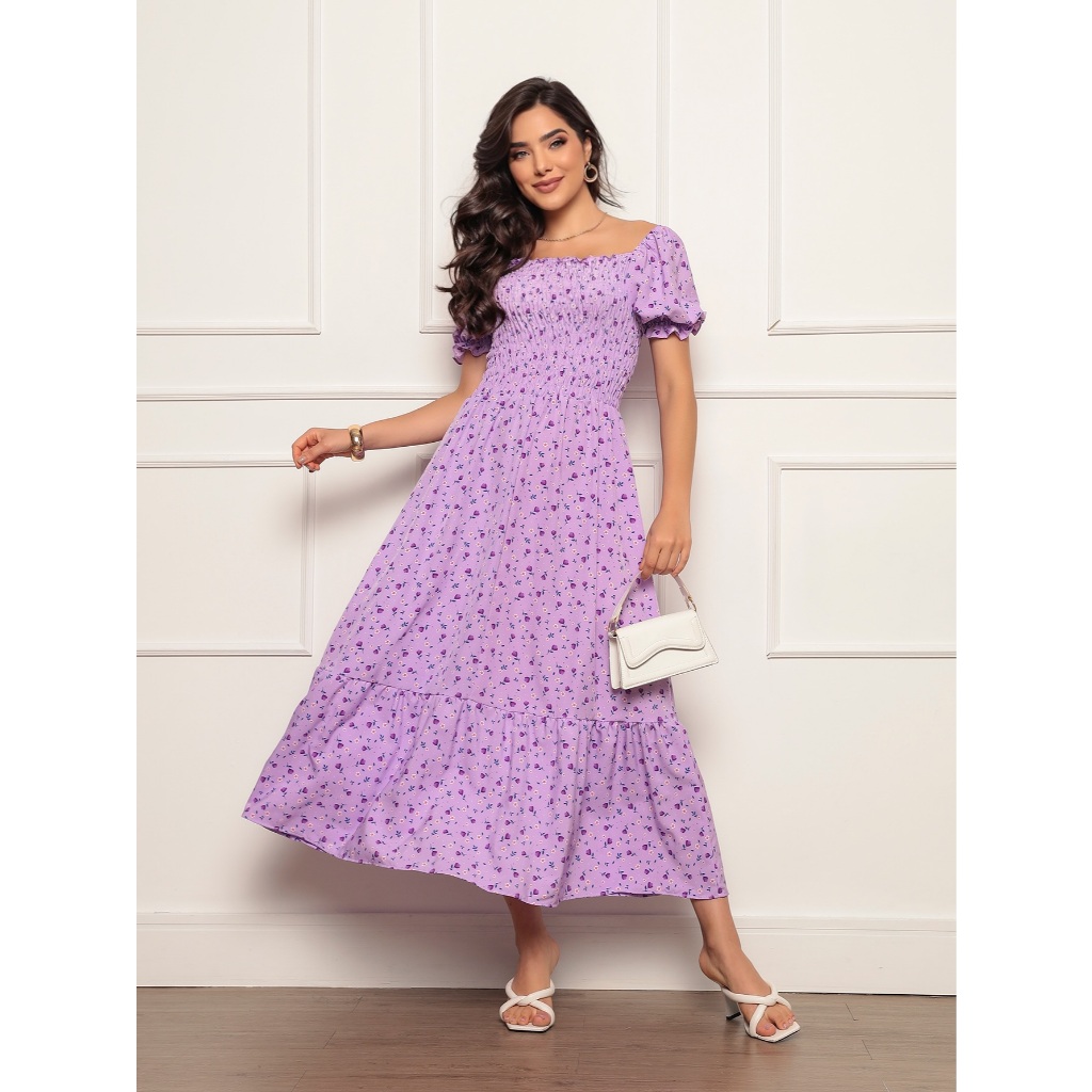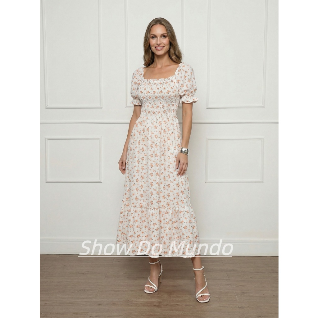 Vestido Longo elastex Feminino Manga curto estampado floral