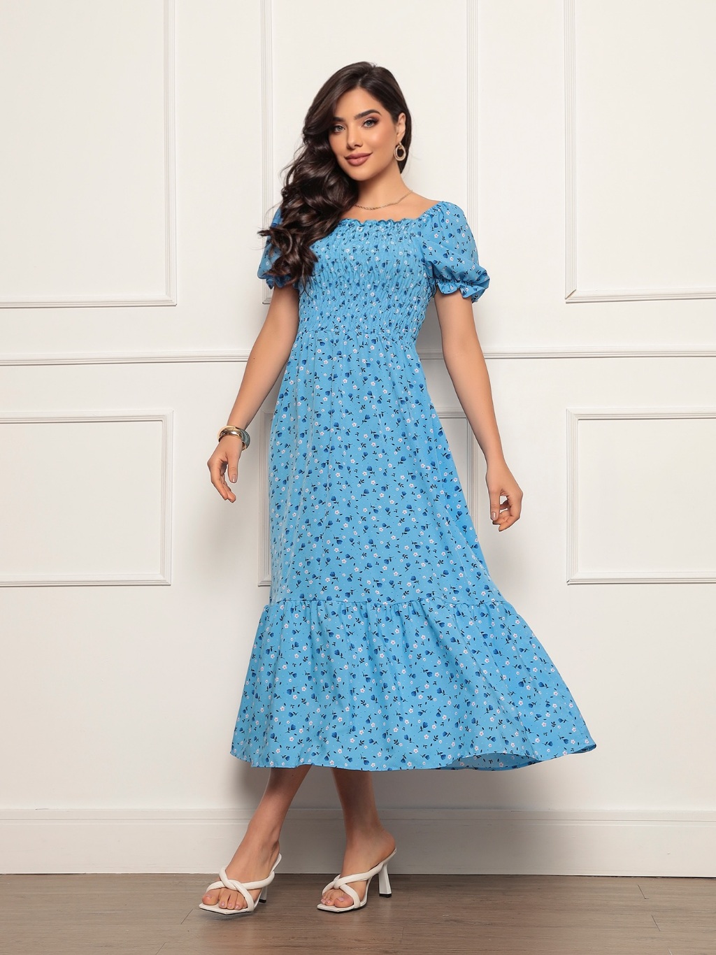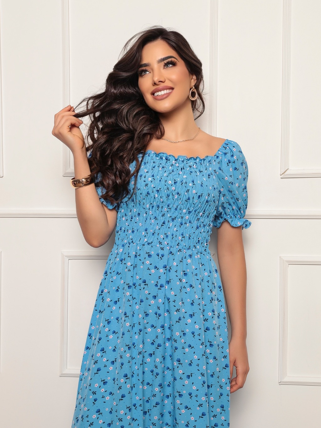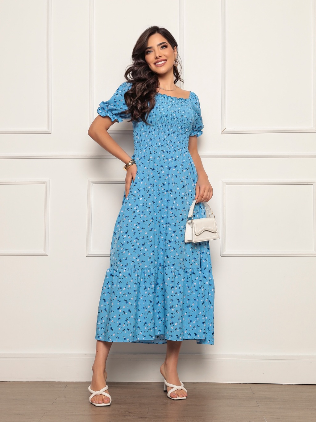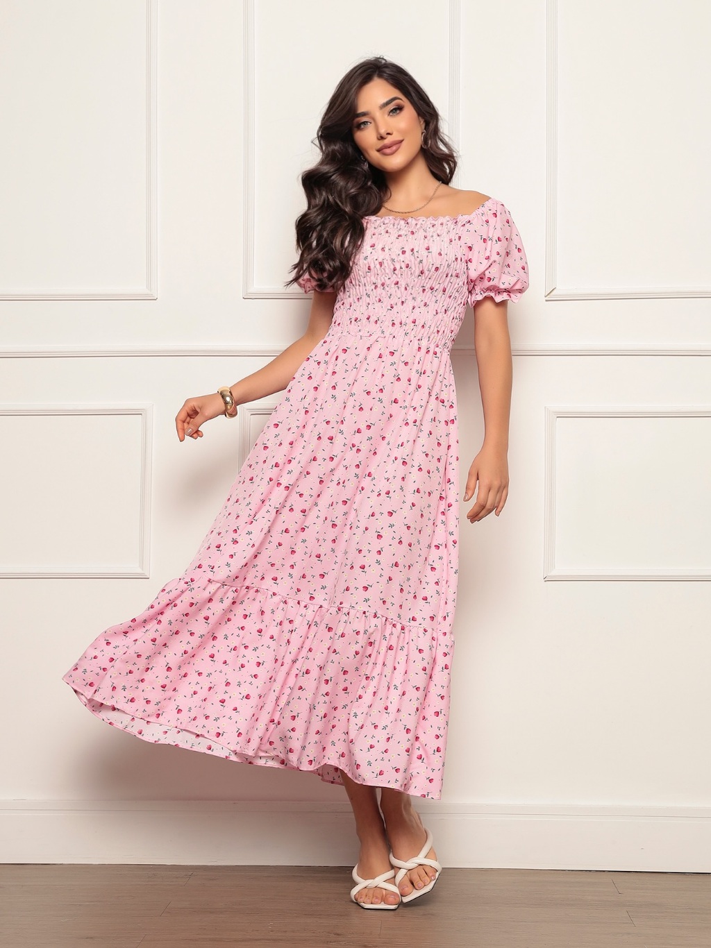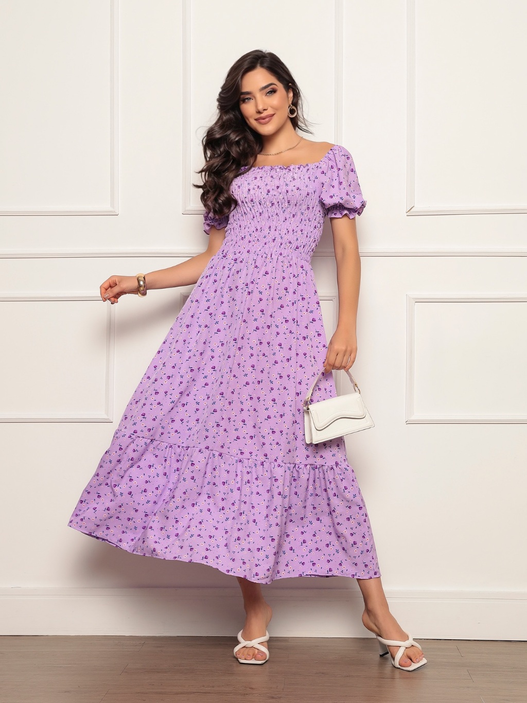 Vestido Longo elastex Feminino Manga curto estampado floral